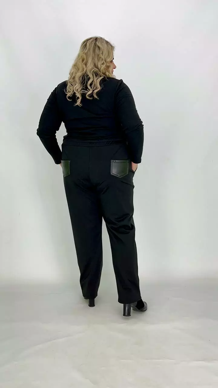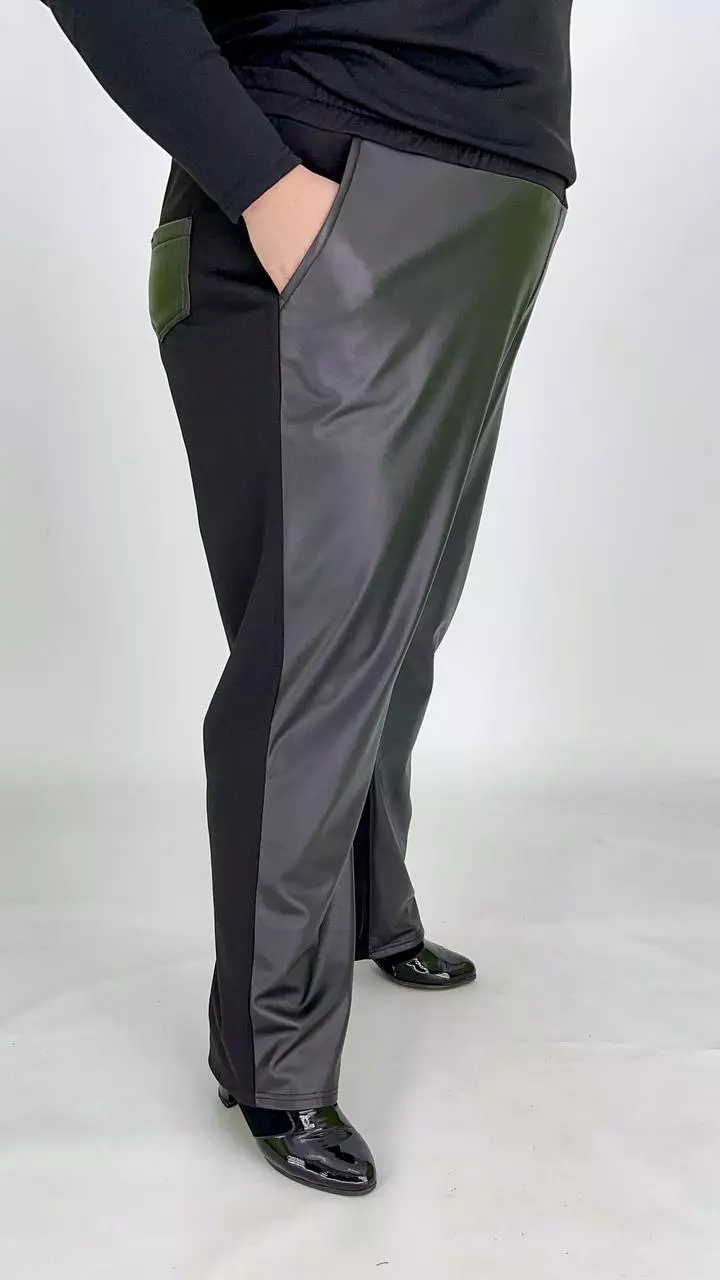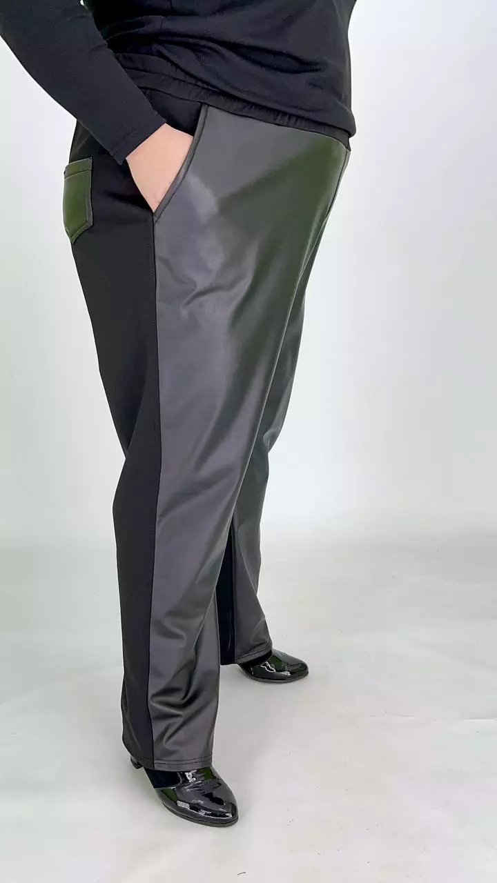 тканина мікродайвінг на флісі + екошкіра на велюрі (100% поліестер) . Штани комбіновані мікродайвінгом на флісі та екошкірою на велюрі. Дуже хороша розтяжимість, висока посадка, пояс на резинці з кишенями.