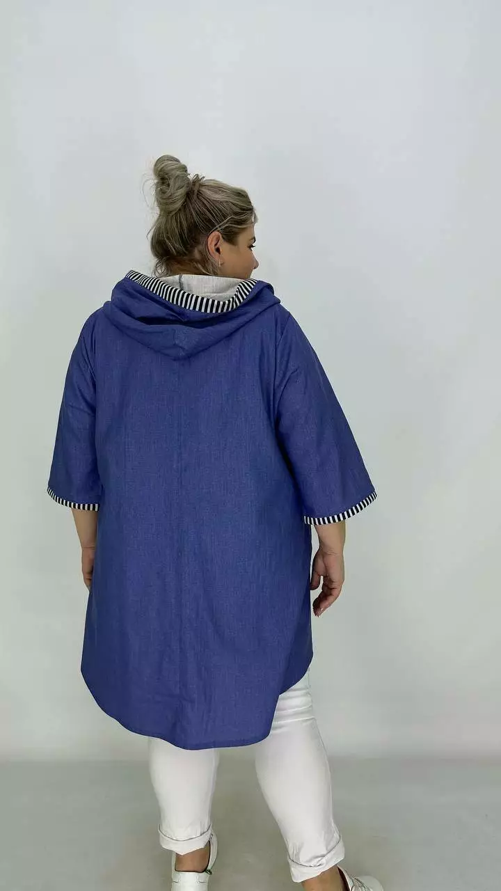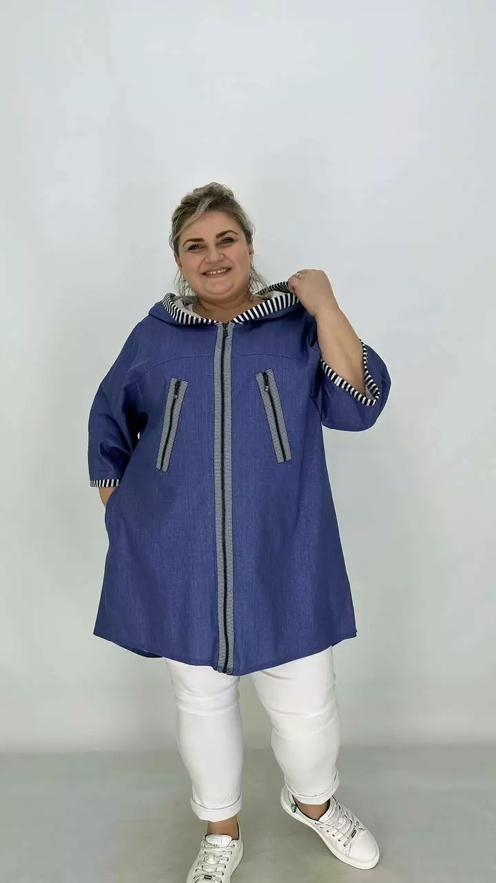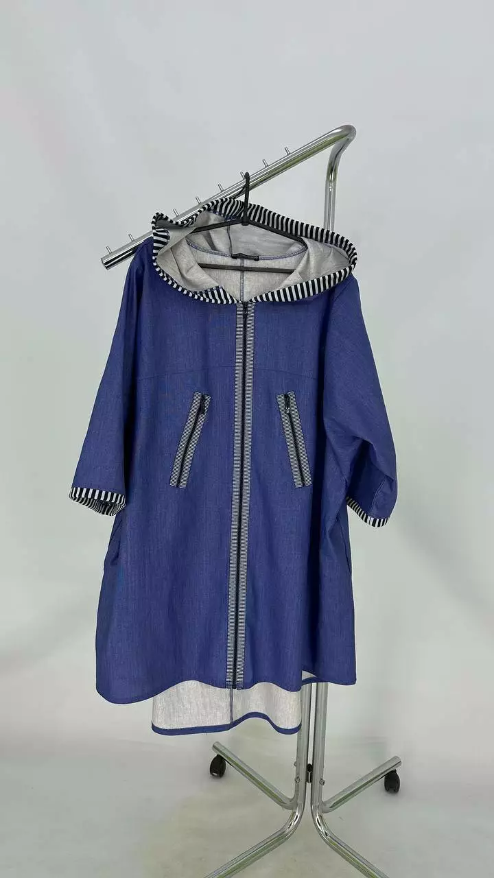 будь-які груди. Кишені в бічних швах, подовжена спина з каптуром,
