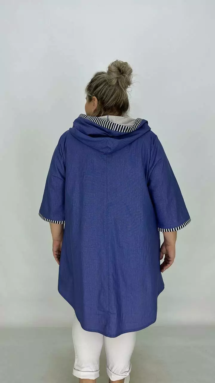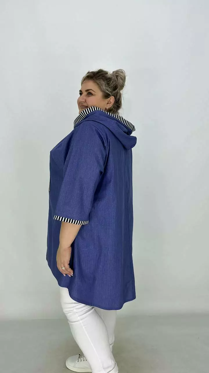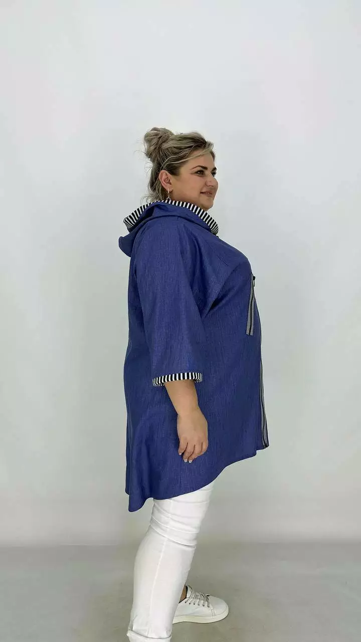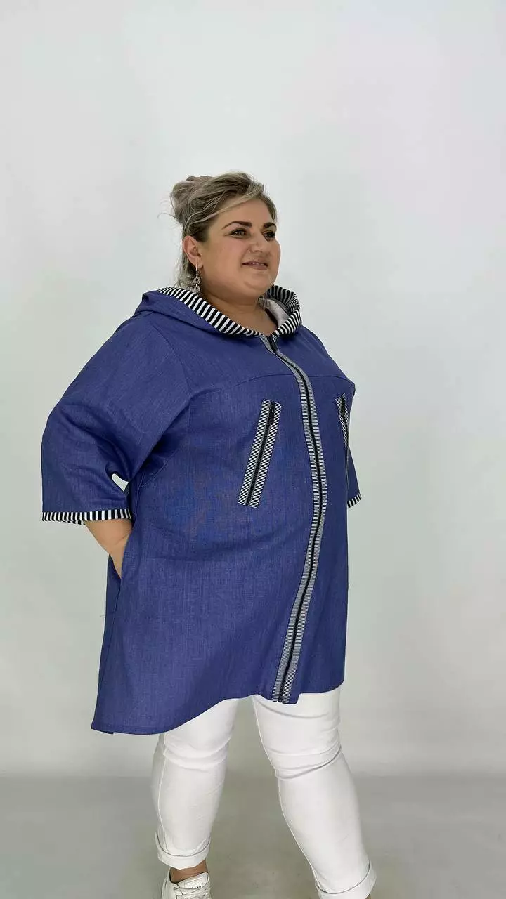 будь-які груди. Кишені в бічних швах, подовжена спина з каптуром,