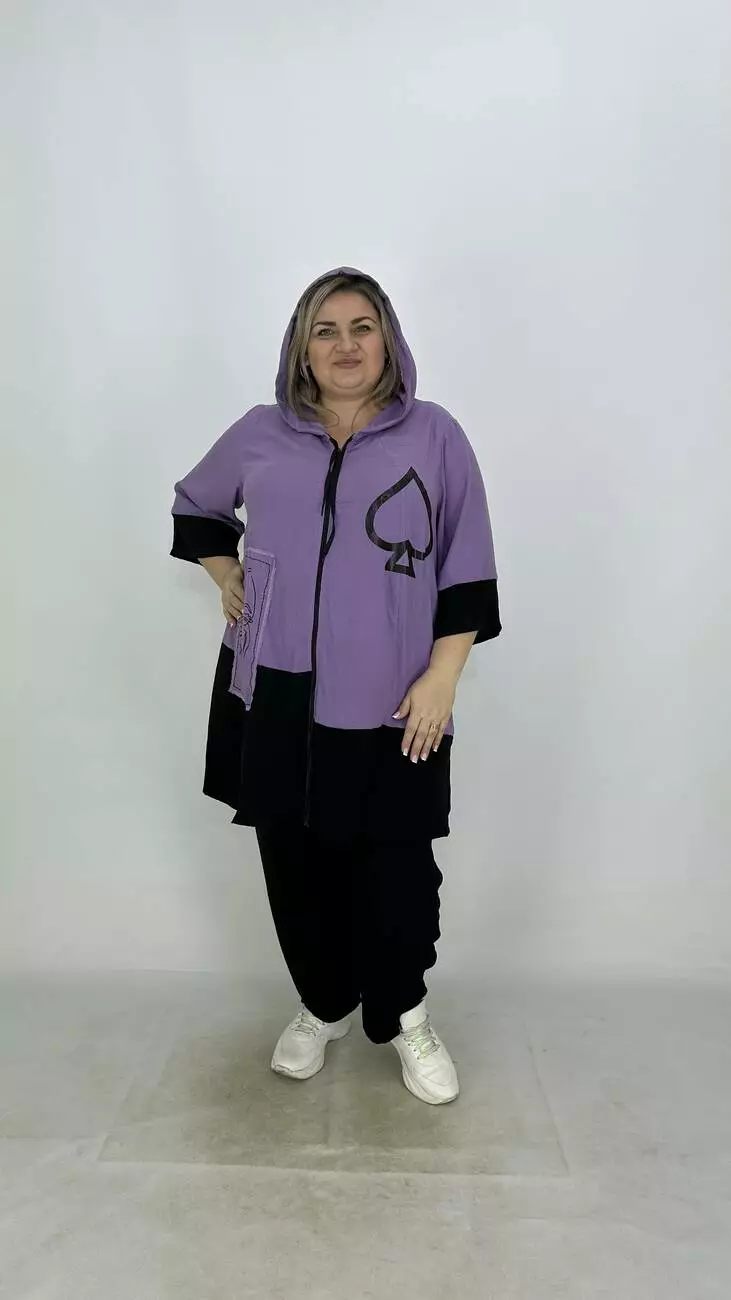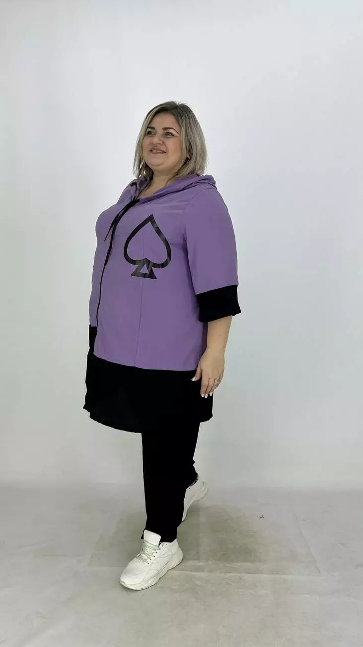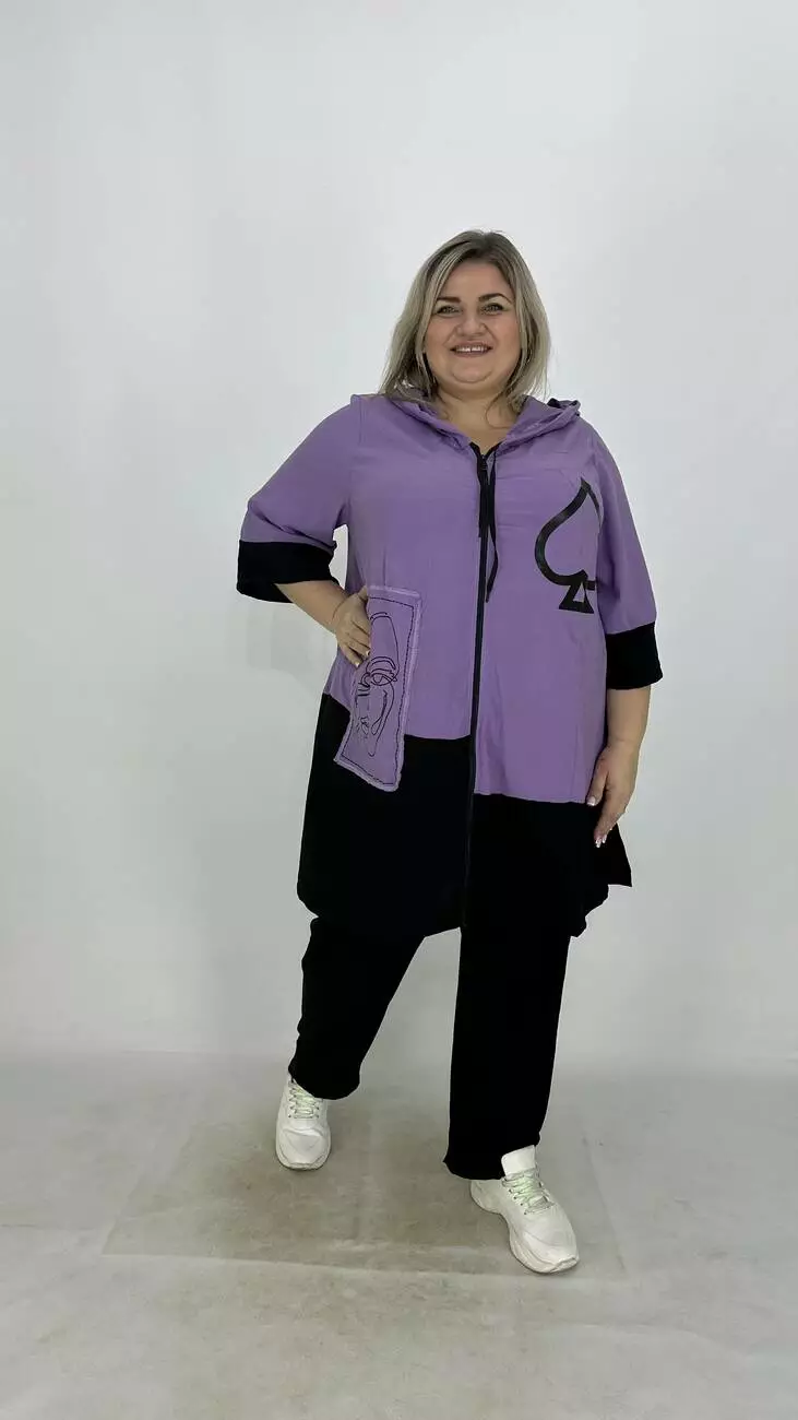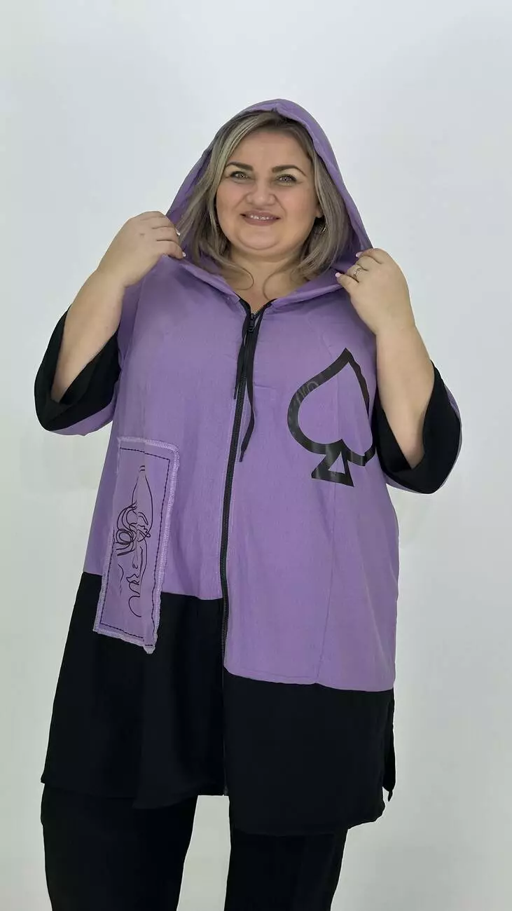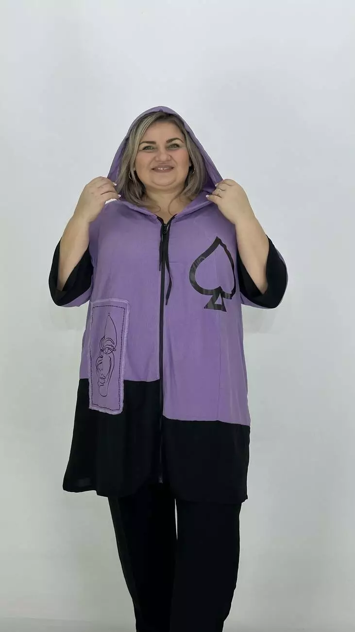 Легкий тонкий пильовик з американського крепу. Тканина трохи жата є невеликий стрєч, м'яка, приємна до тіла, не жарка. Силує трапеція. з капюшоном, застібка змійка прикрашена пришивними аплікаціями з якісним накатом.