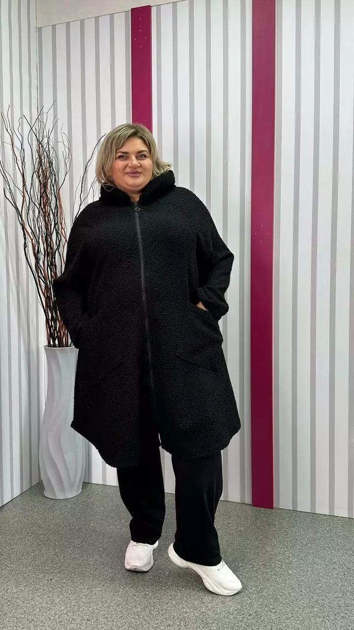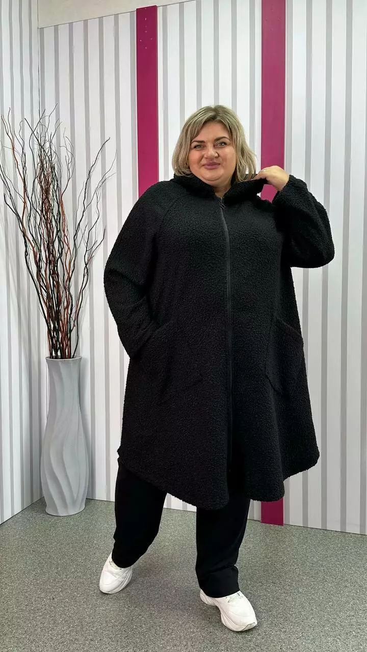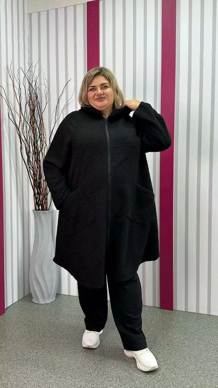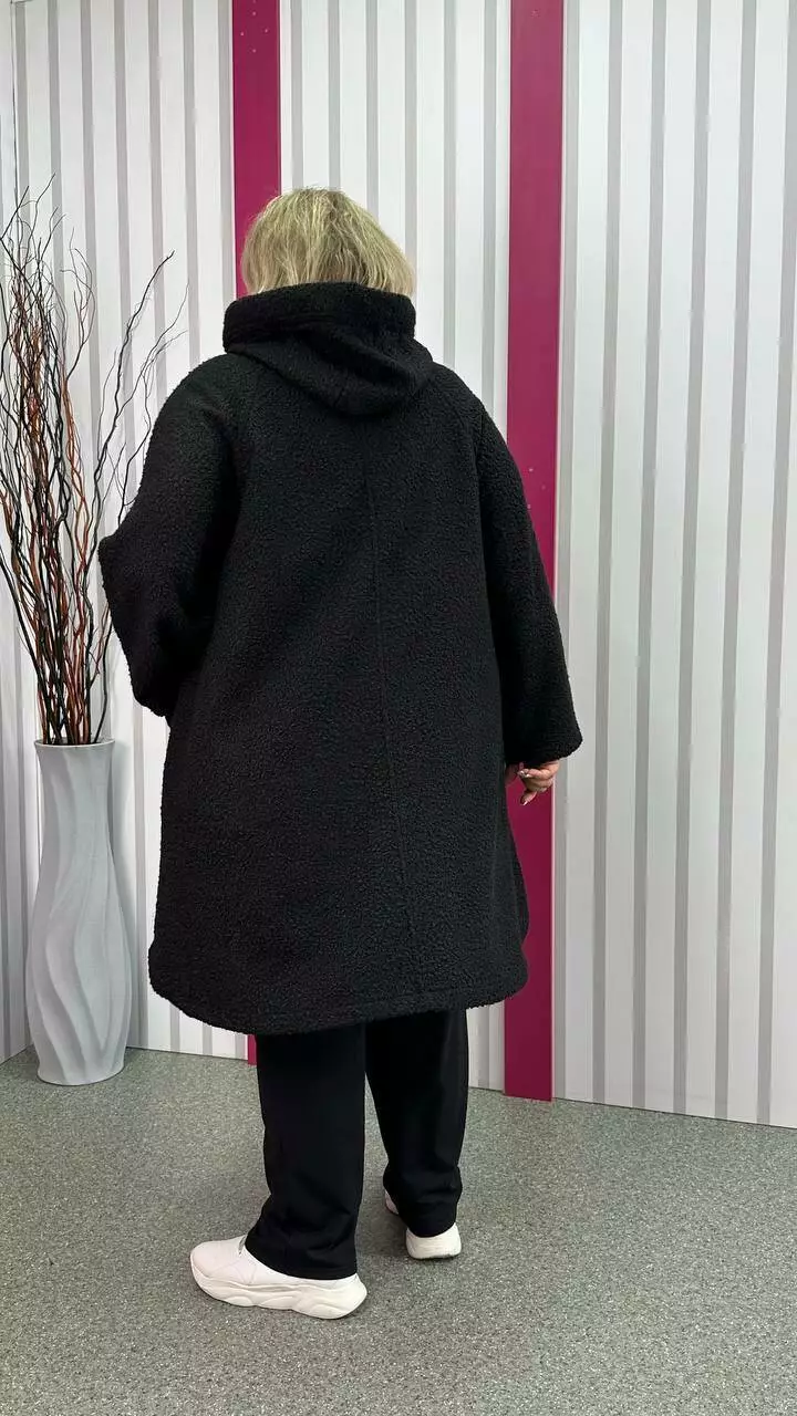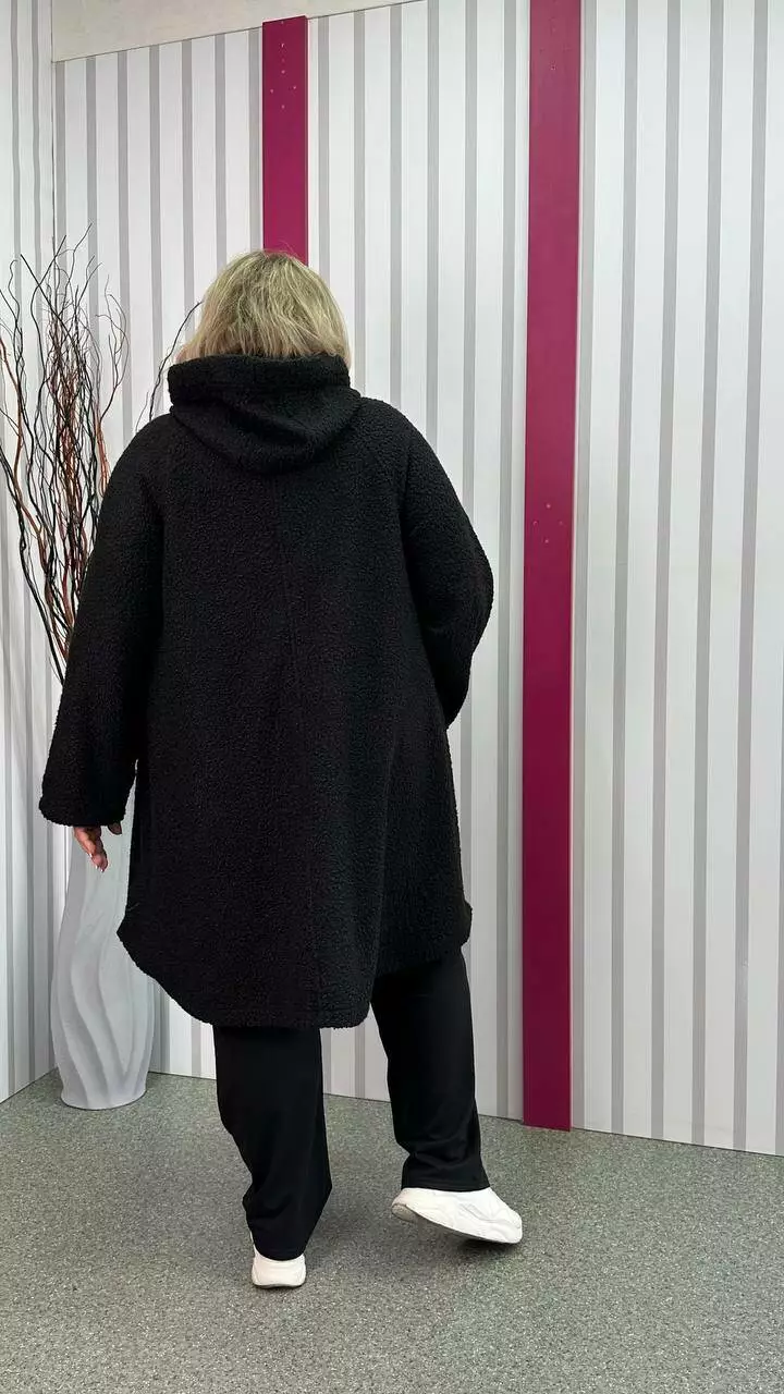 Шикарний кардиган, із щільної пальтової тканини баранчиків, без підкладки з невеликою розтяжністю. Тканина тепла, м'яка і приємна на дотик. Силует клешений, рукав реглан, кишені накладні, дуже зручний капюшон з обробкою із щільного хутра-мутону леопардового забарвлення. Не кошлатиться після прання.