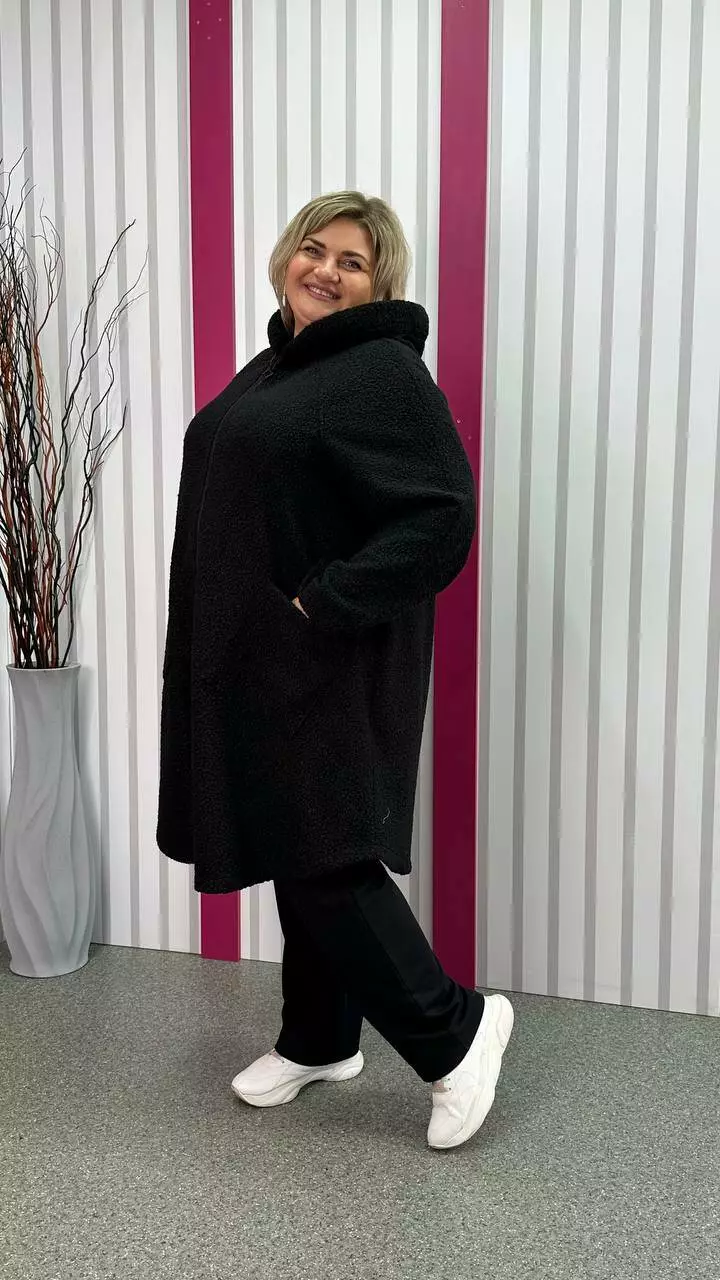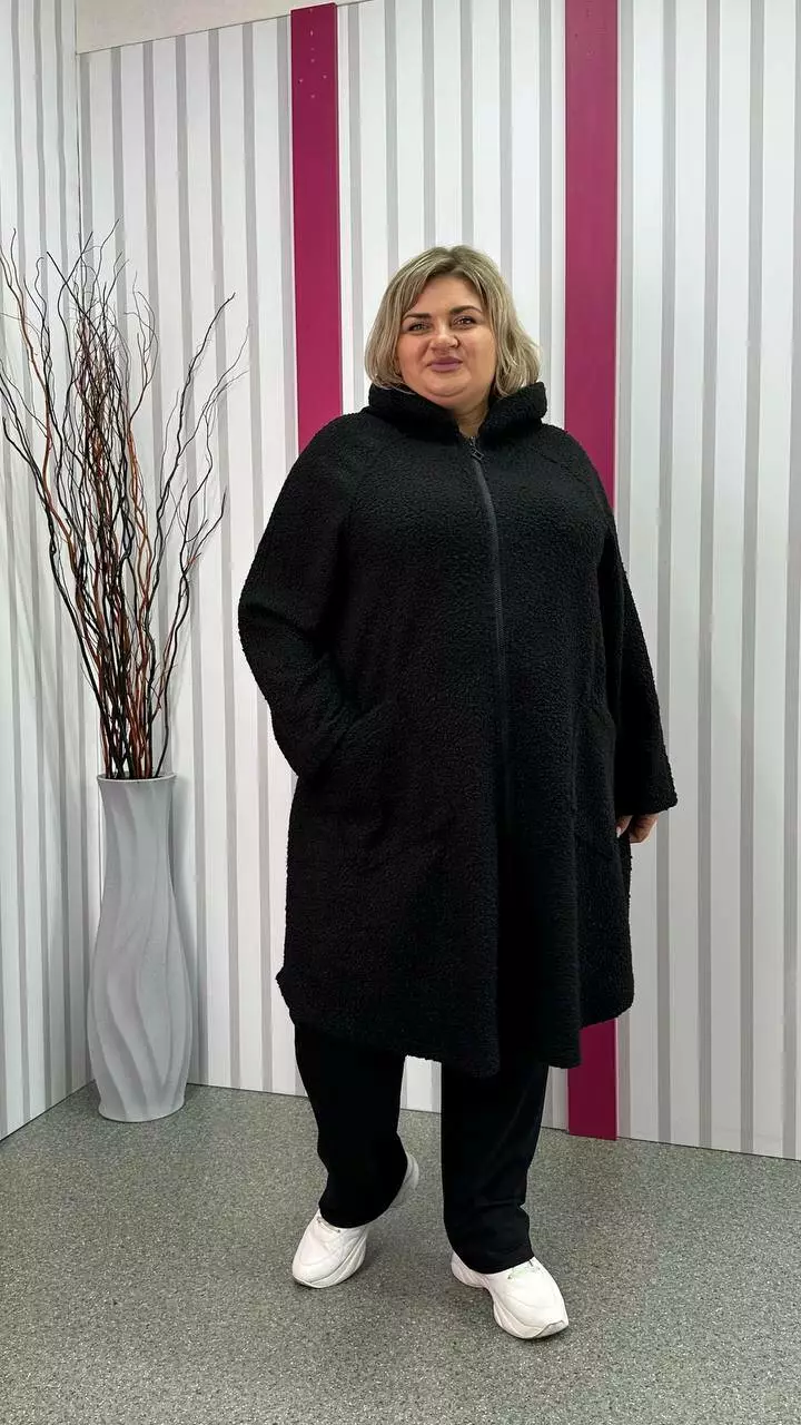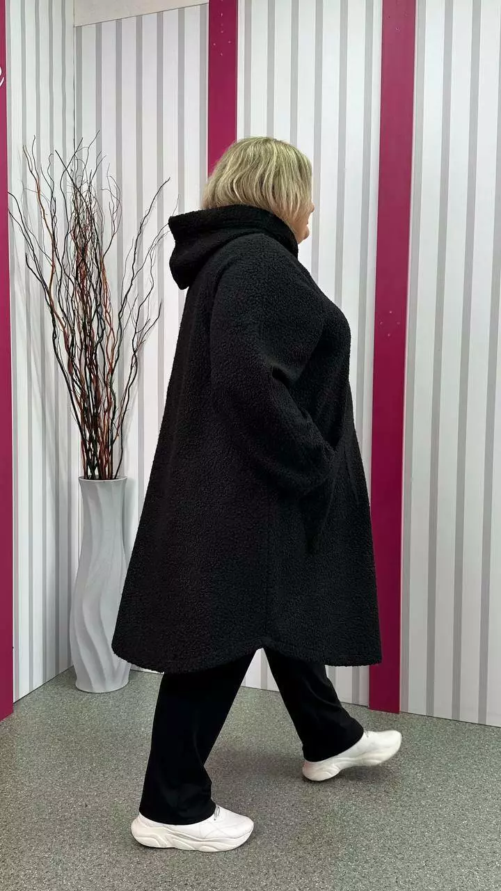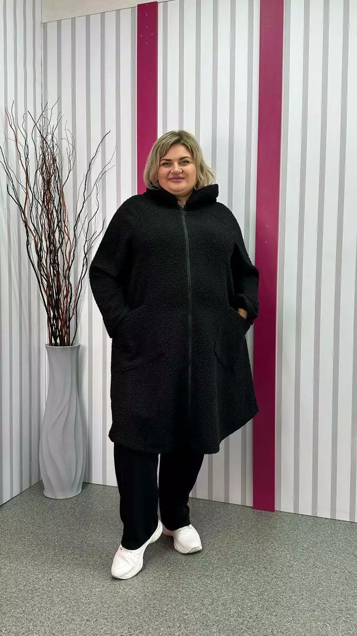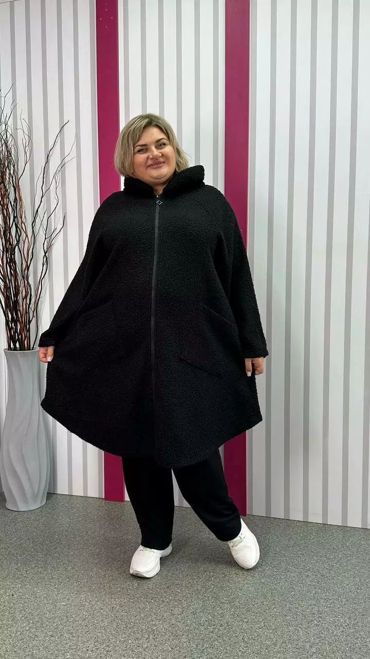 Шикарний кардиган, із щільної пальтової тканини баранчиків, без підкладки з невеликою розтяжністю. Тканина тепла, м'яка і приємна на дотик. Силует клешений, рукав реглан, кишені накладні, дуже зручний капюшон з обробкою із щільного хутра-мутону леопардового забарвлення. Не кошлатиться після прання.