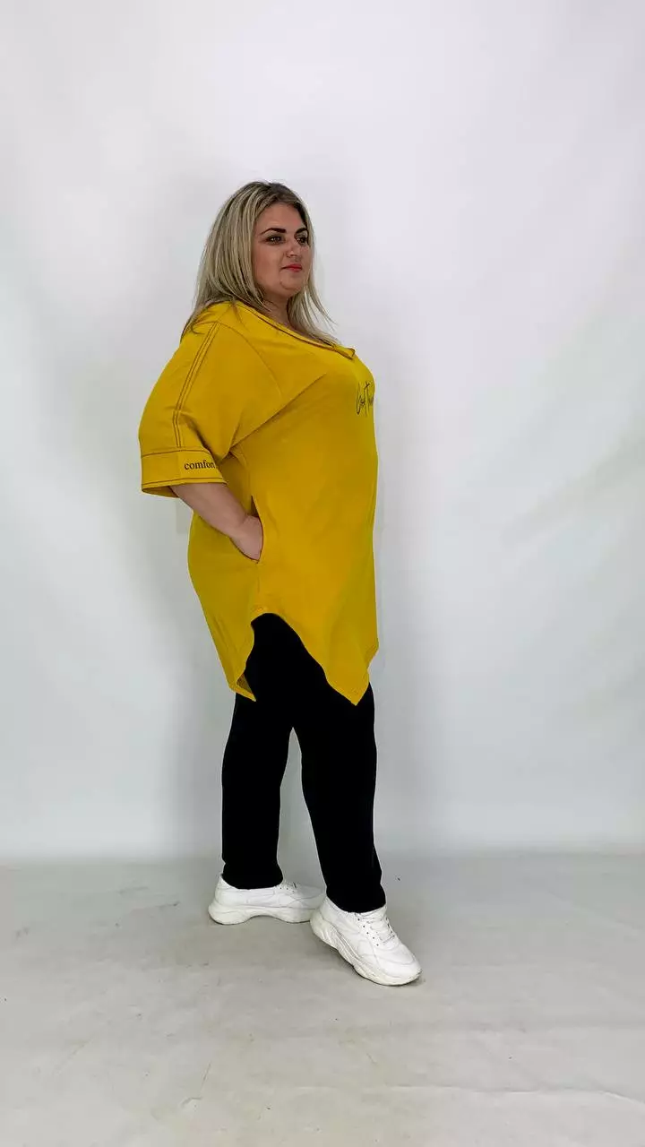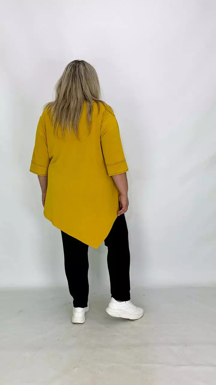 Тканина: двонитка - 47% бавовна, 3% еластан, 50% поліестер. Костюм складається з асиметричної туніки - рукав до ліктя, горловина кругла. Штани на резинці. Виріб виконаний модною технікою - "шви назовні".