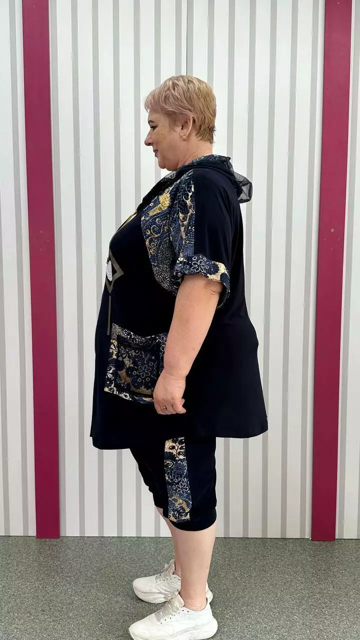 Капрі: Об'єм талії 100-150; Об'єм стегон 120-150; Довжина виробу 80; Внутрішній шов 44; ширина ноги 70; Ширина коліна 52; Ширина низу 40-44; Шов сидіння 80-88.