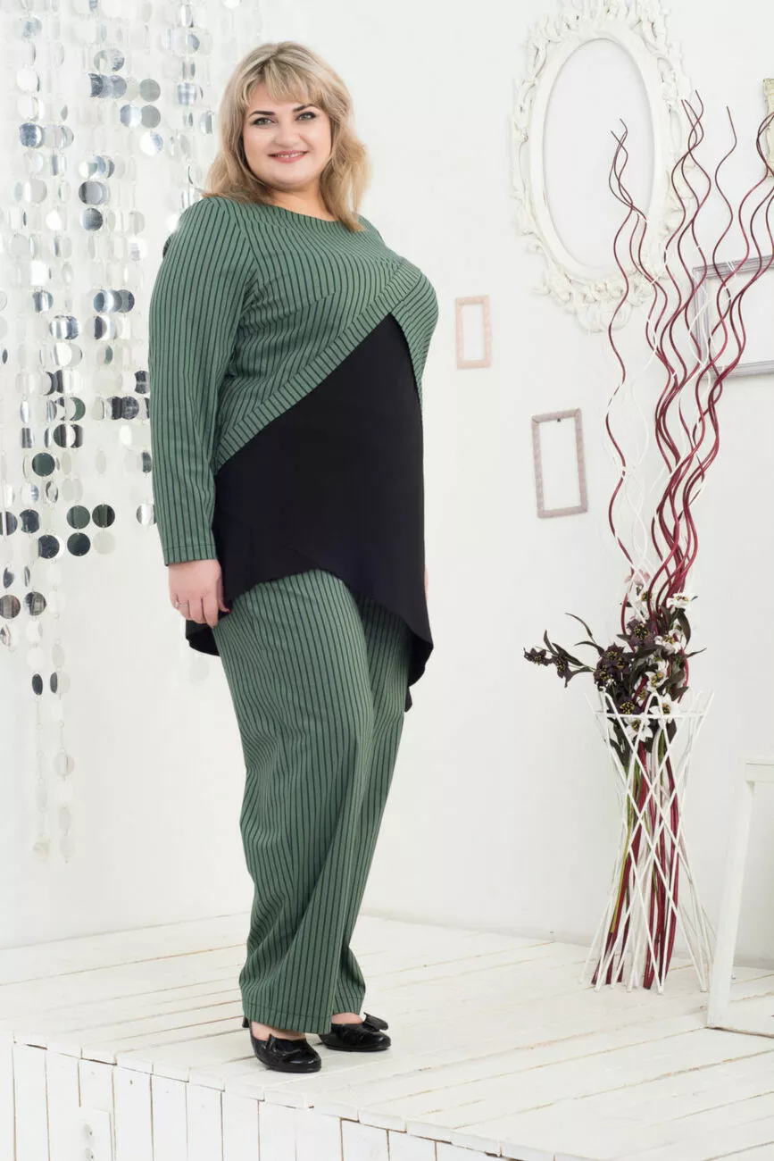 Тканина: джерсі -60% бавовна; 10% поліестер; 30% віскоза. Стильний і модний костюм виконаний з якісної тканини, складається з штанів на резинці та туніки. Туніка візуально з двох частин - однотонної та в смужку. Рукав довгий, горловина заокруглена. Костюм підійде як для ділової зустрічі, так і для вечірки. Міцна, не утворює катишки, мала змінність, не дає усадки, злегка тягнеться. Догляд: делікатний режим прання. Прасувати при температурі не вище 110 мм.