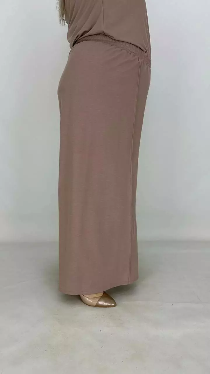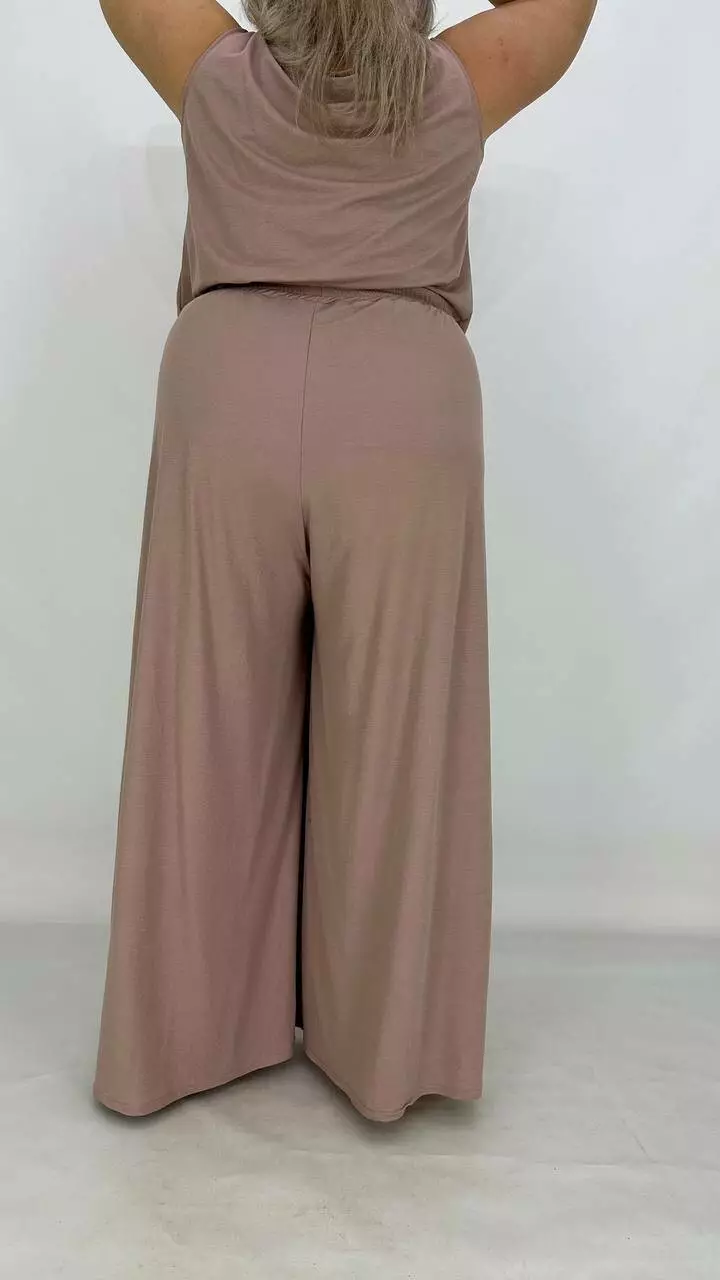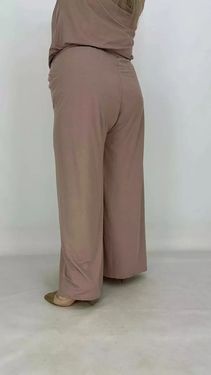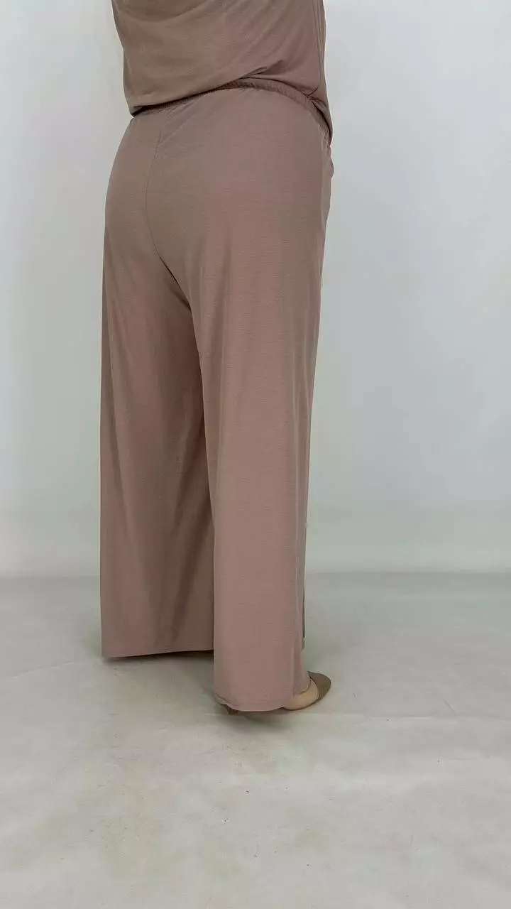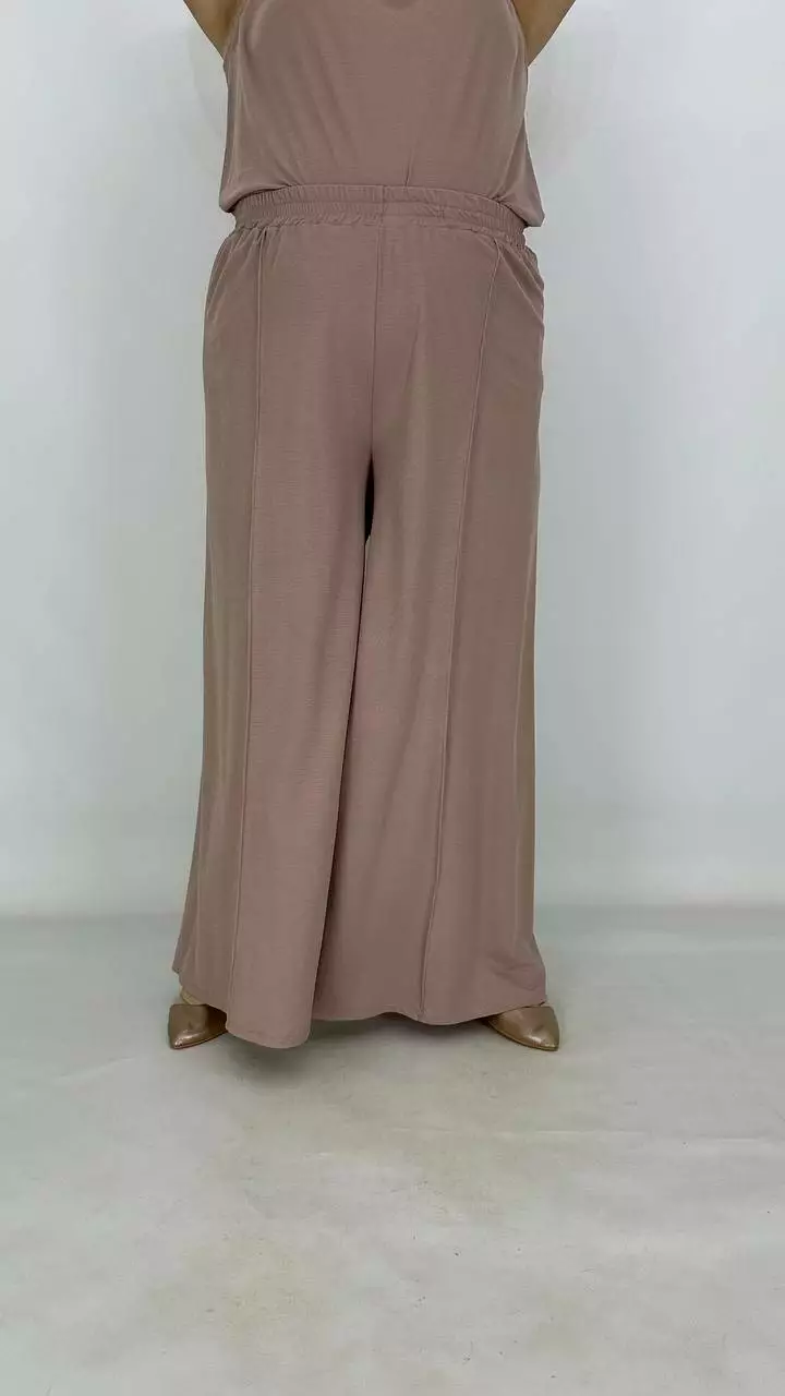 Штани широкі-палаццо без бокового шва, без кишень, по переду застрочена стрілка, пояс на гумці, посадка висока. Тканина дихає, гіпоалергенна. створює ефект прохолоди, приємна до тіла, мнеться, гладити з вивороту, прати 40 градусів у ручному режимі.