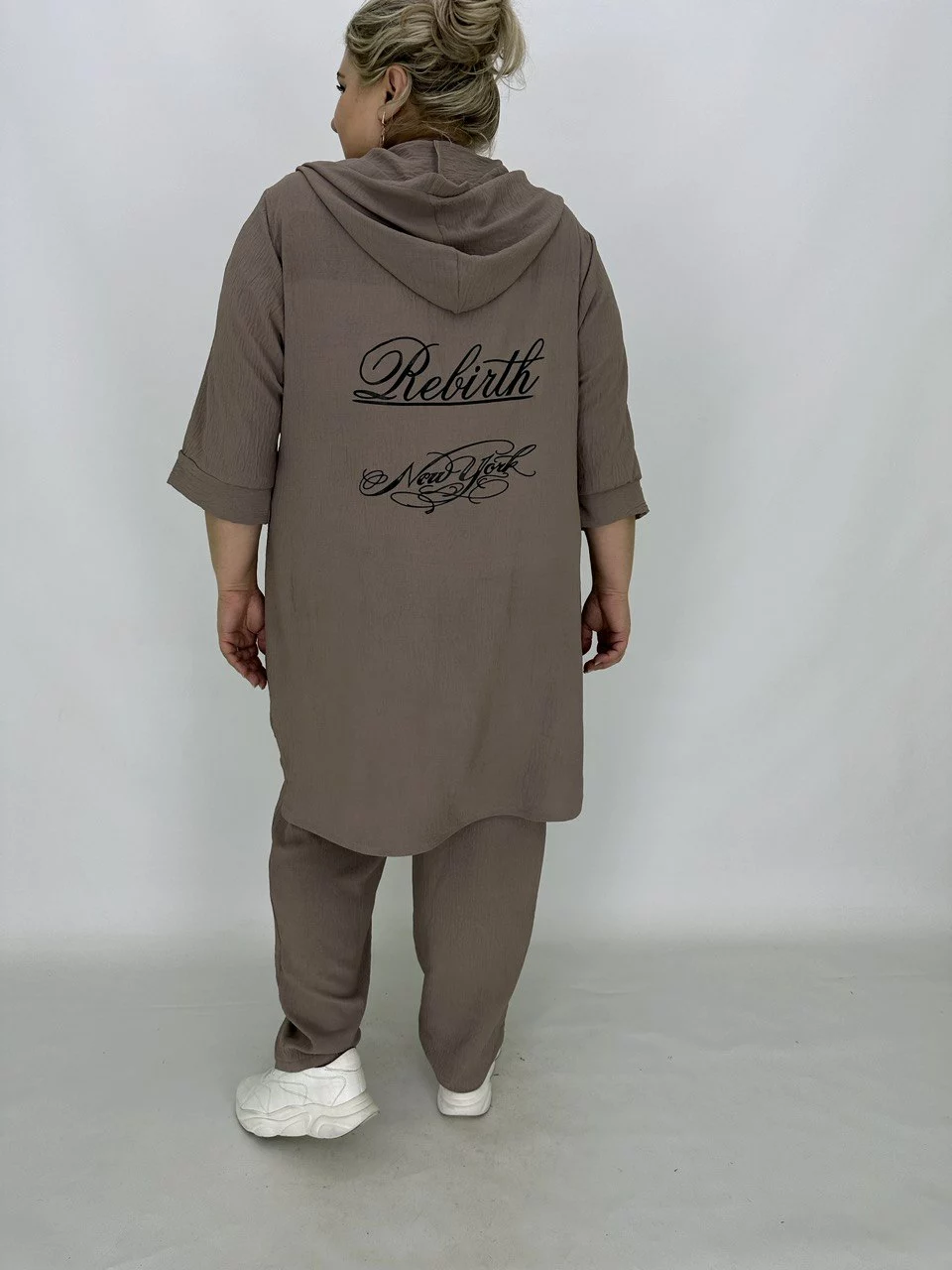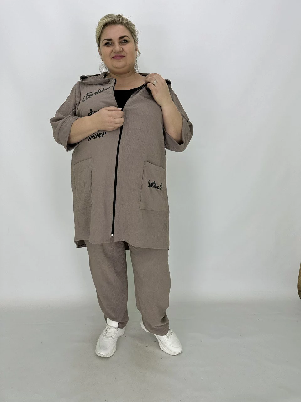 З ніжної, м'якої тканини-американський креп, розтяжність невелика, вільний силует, рукав-кажан, підходить під будь-які груди, кишені накладні, капюшон, якісний накат.