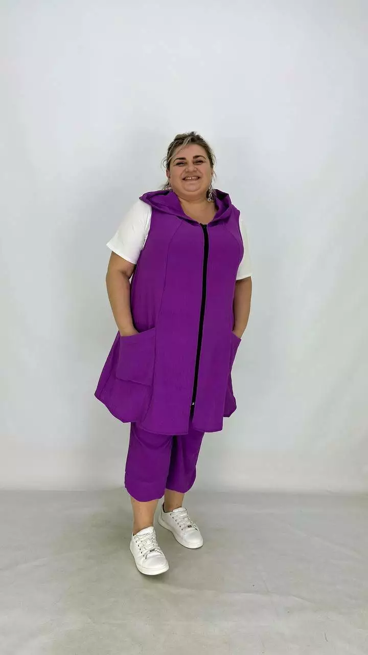 Жилет-силует трапеція з кишенями і капюшоном, фігурний низ з