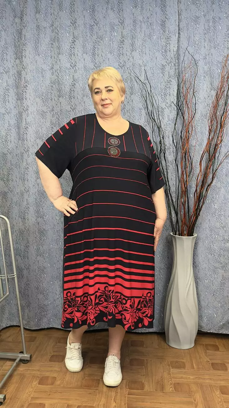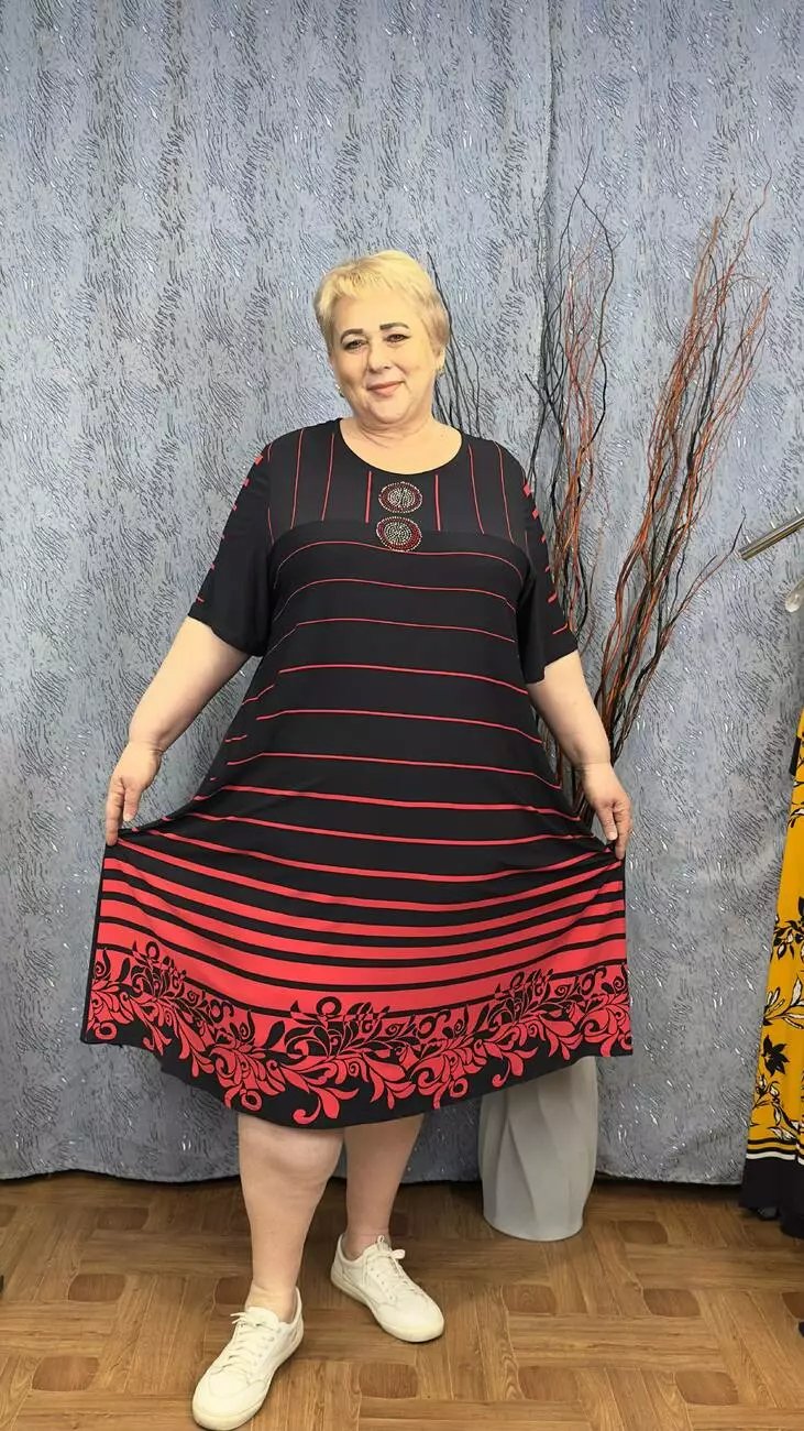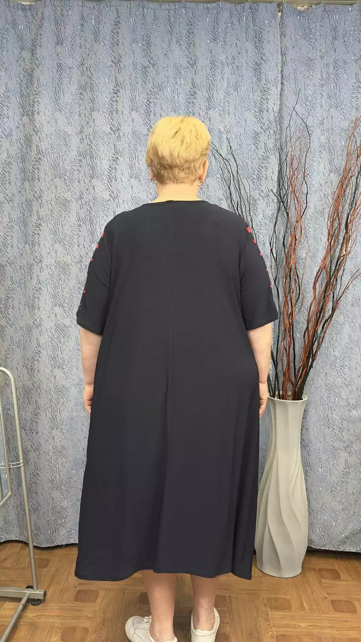 Розкльошена сукня з подовженими боками з трикотажу, олія п-ва Корея з гарною розтижністю. Тканина не меніться, не спекотна, не вимагає особливого догляду. Силует вільний, рукав втачний, на кокетці камінна аплікація.