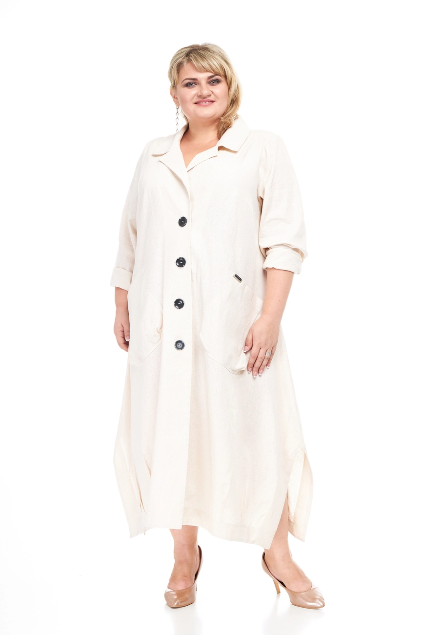Тканина: льон – 55% льон; 45% змішаний льон. Модний та стильний плащ із тканини льон. Застібається на великі, гарні гудзики; рукав довгий, комір сорочкового вигляду. Виріб має дві великі функціональні кишені. Тканина натуральна, гігроскопічна, добре пропускає повітря. Абсолютна екологічність, зносостійкість та міцність, мінімальна електризуваність, не тягнеться. Виріб прати не вище 40 градусів. Праска з парою полегшить процес прасування, температура не повинна перевищувати 200 градусів.