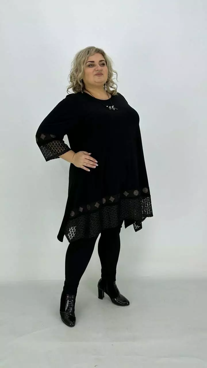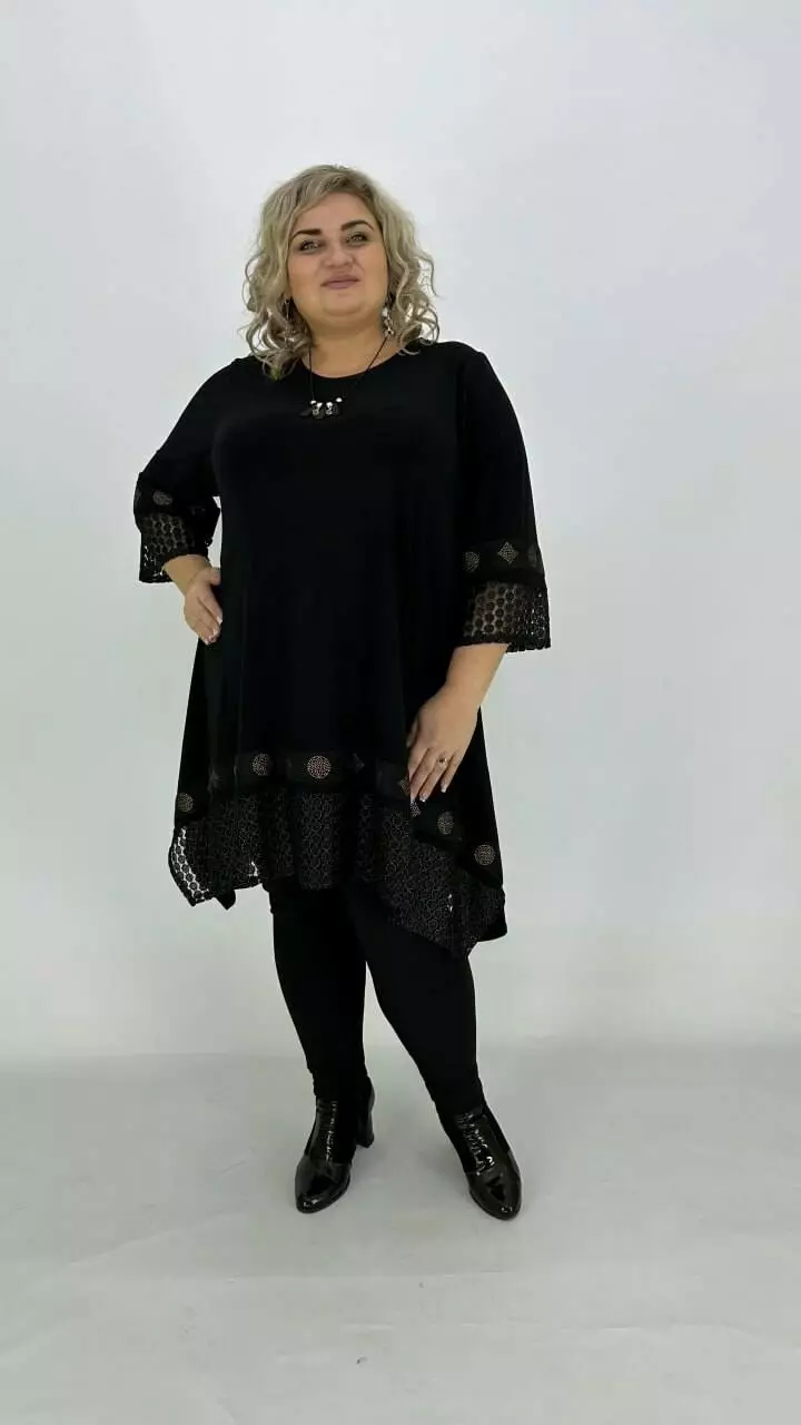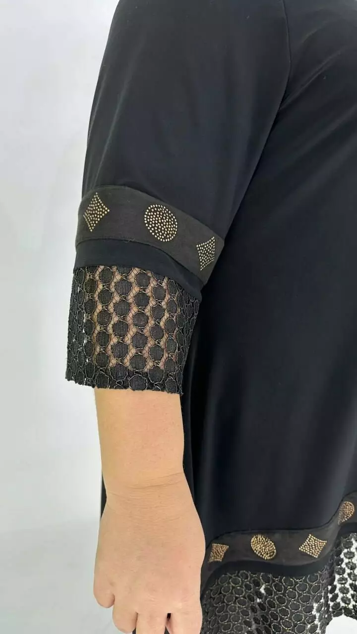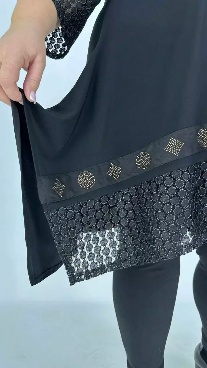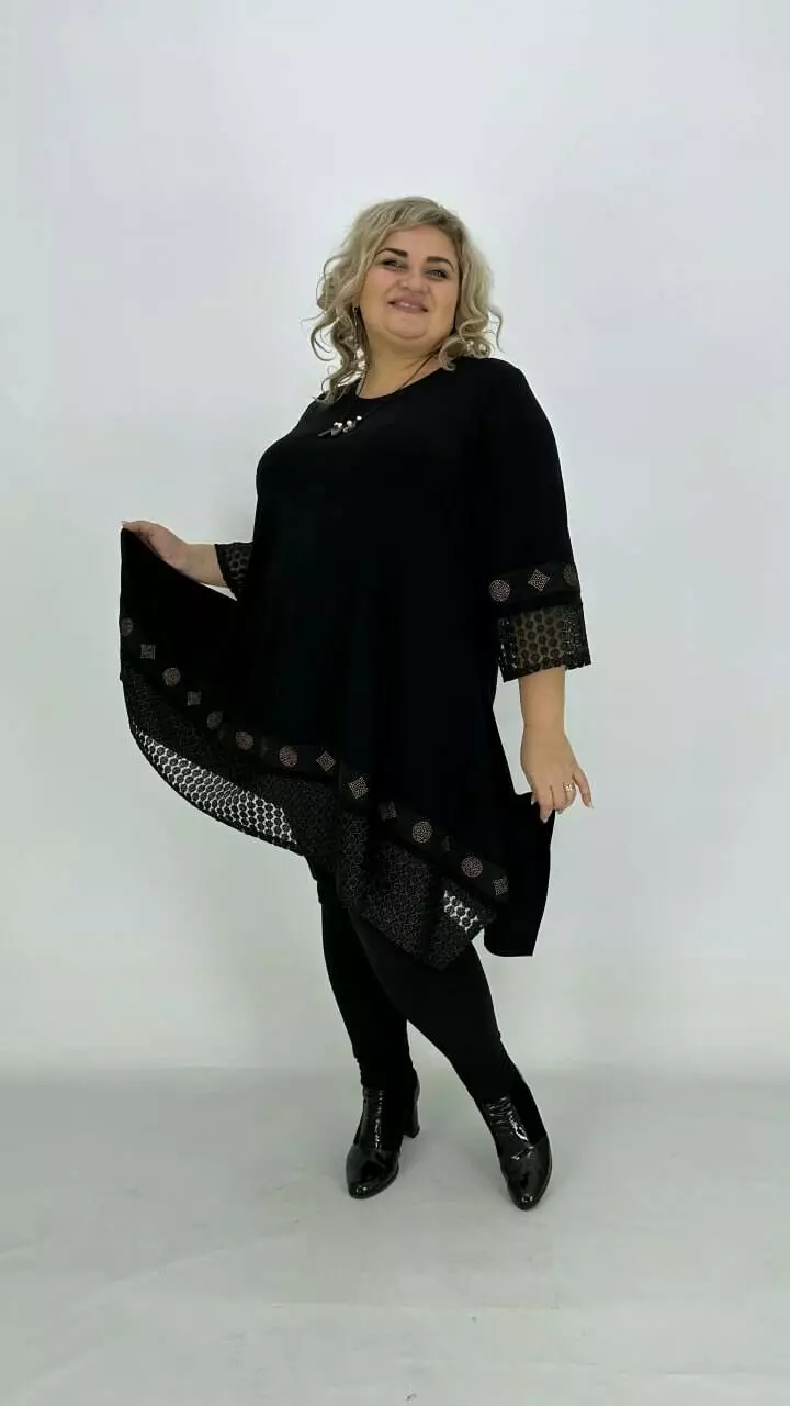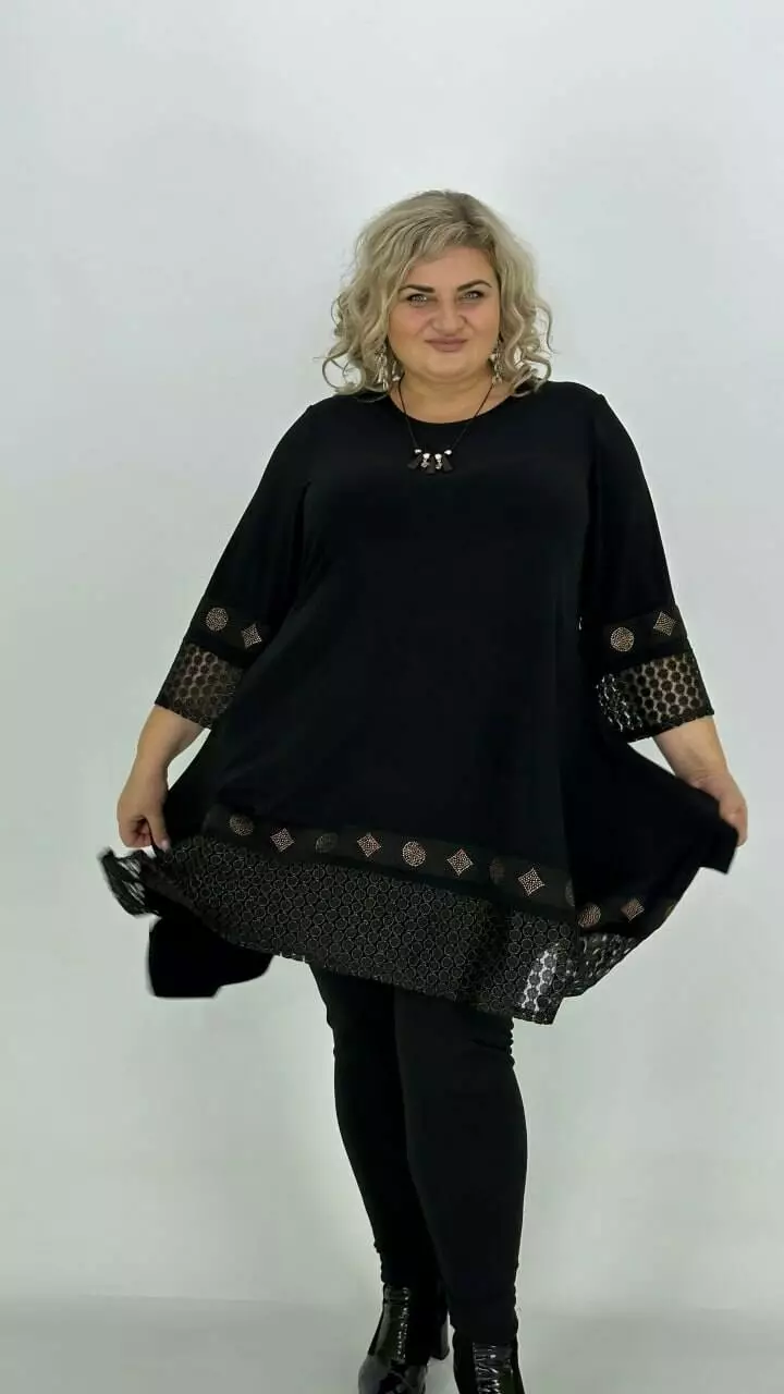 Ошатна туніка з корейського масла з дуже гарною розтяжністю, прикрашена мереживом з люрексом або люрекс тканиною та пришивною тасьмою з каменевою накаткою. Силует вільний з подовженими боками, рукав у точній. Підвіска у подарунок.