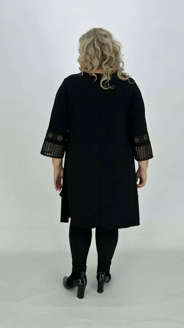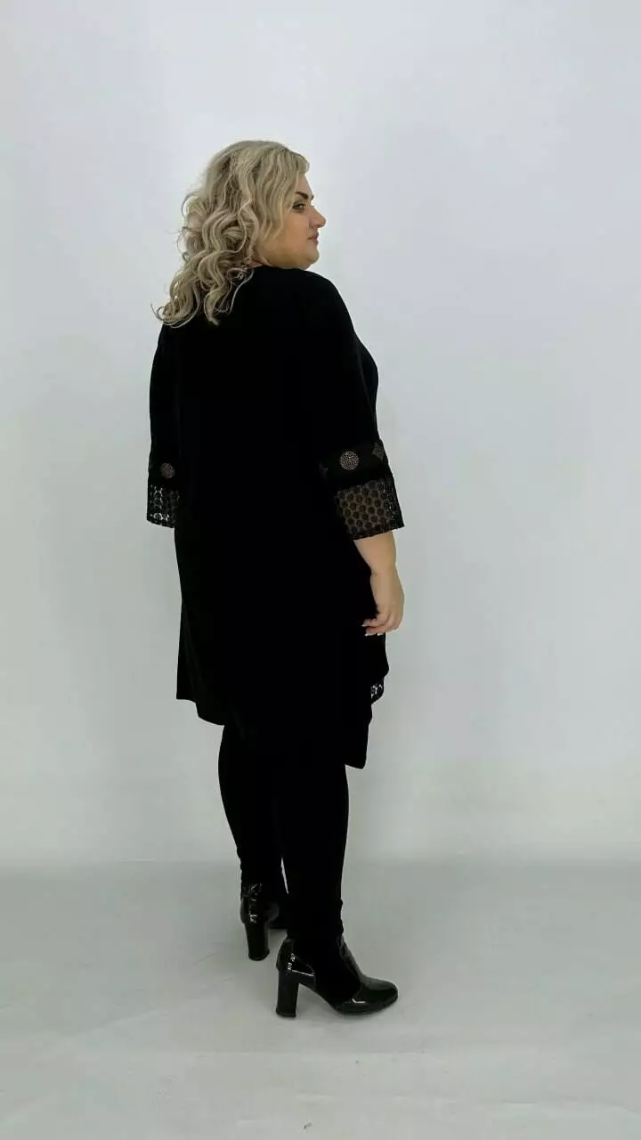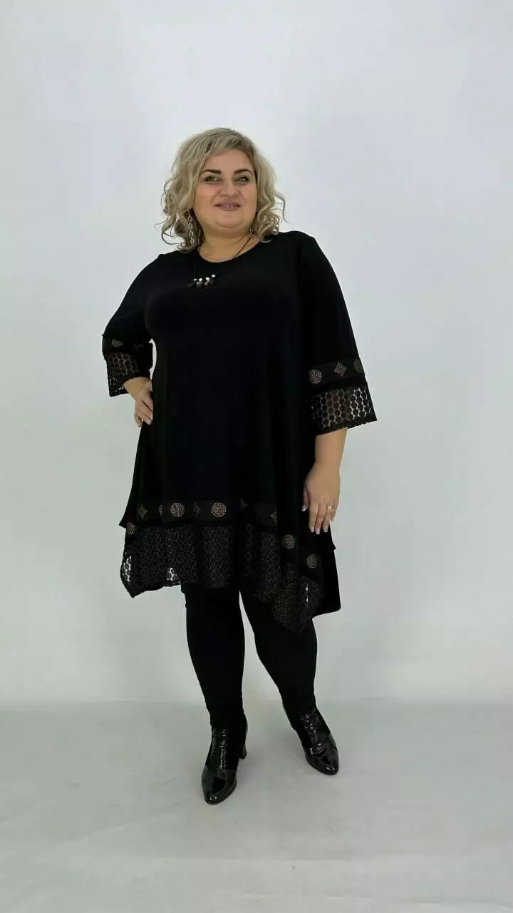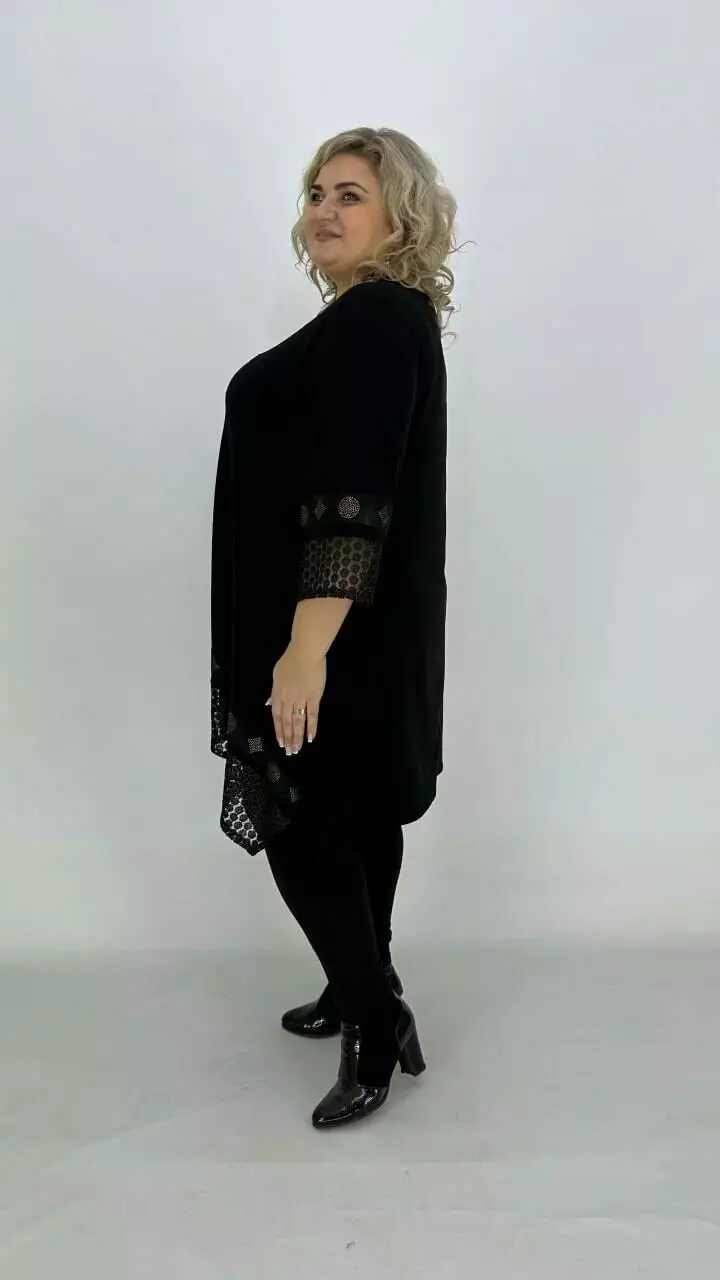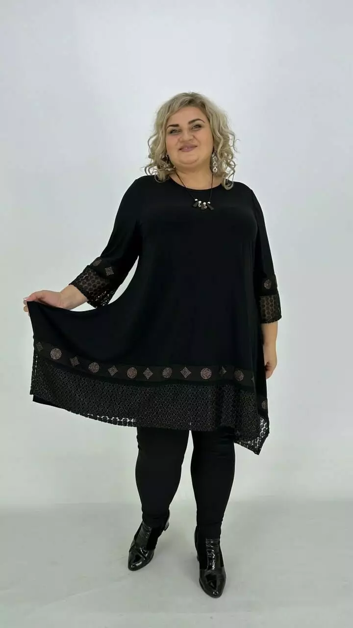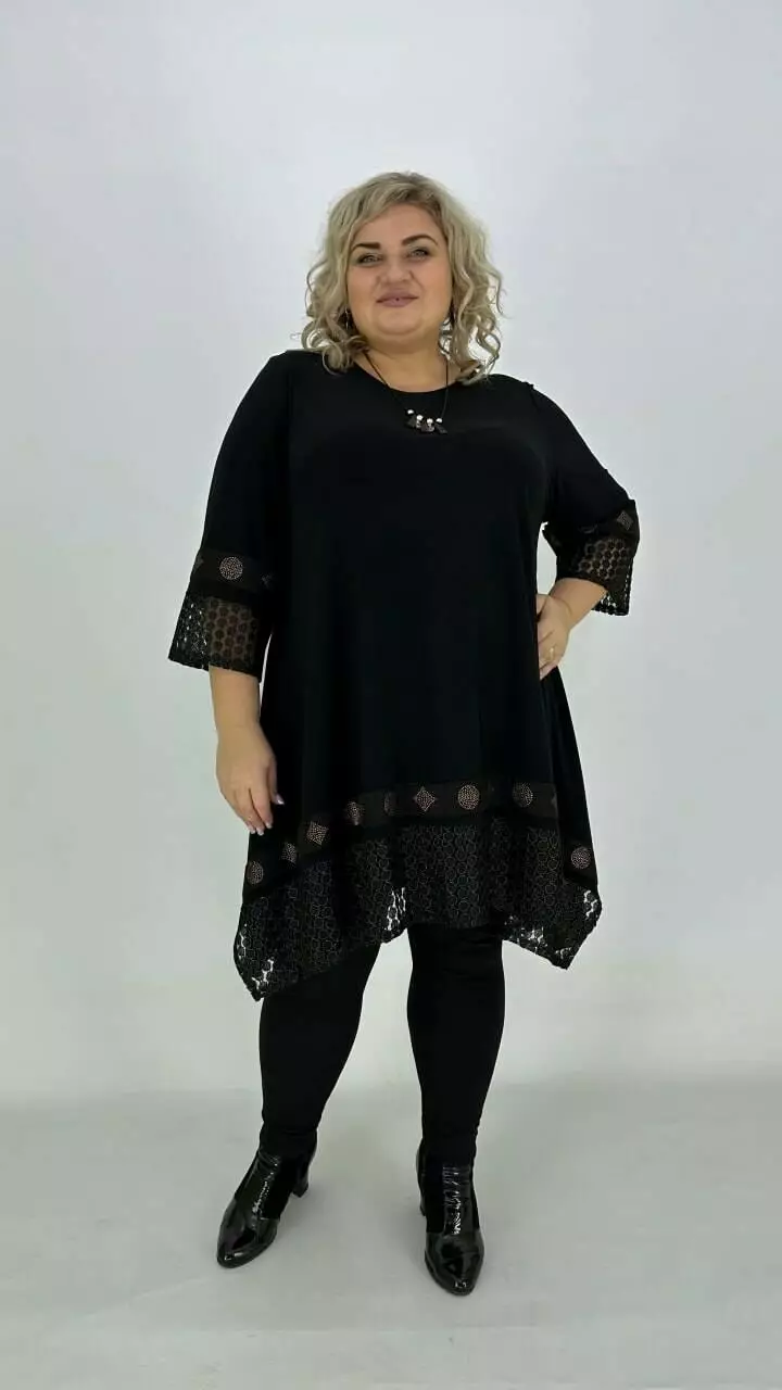 Ошатна туніка з корейського масла з дуже гарною розтяжністю, прикрашена мереживом з люрексом або люрекс тканиною та пришивною тасьмою з каменевою накаткою. Силует вільний з подовженими боками, рукав у точній. Підвіска у подарунок.