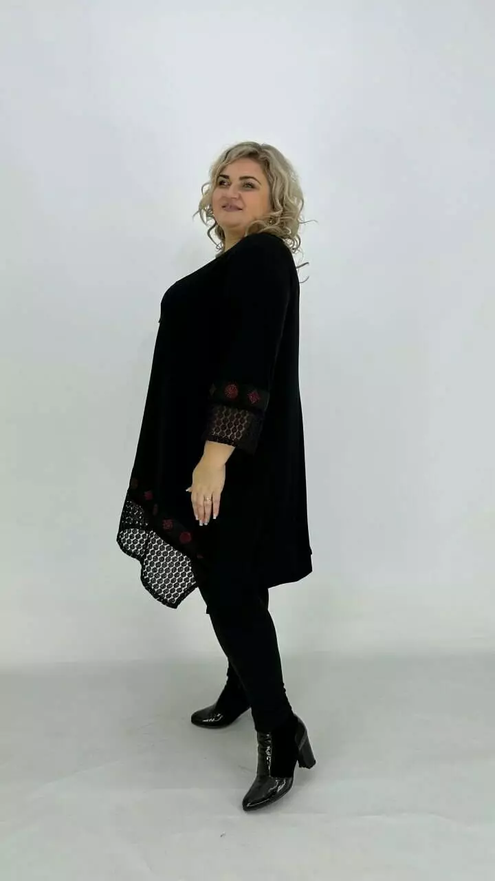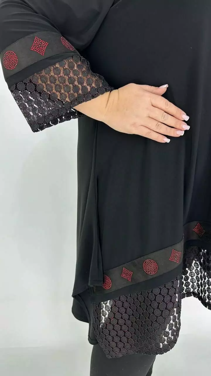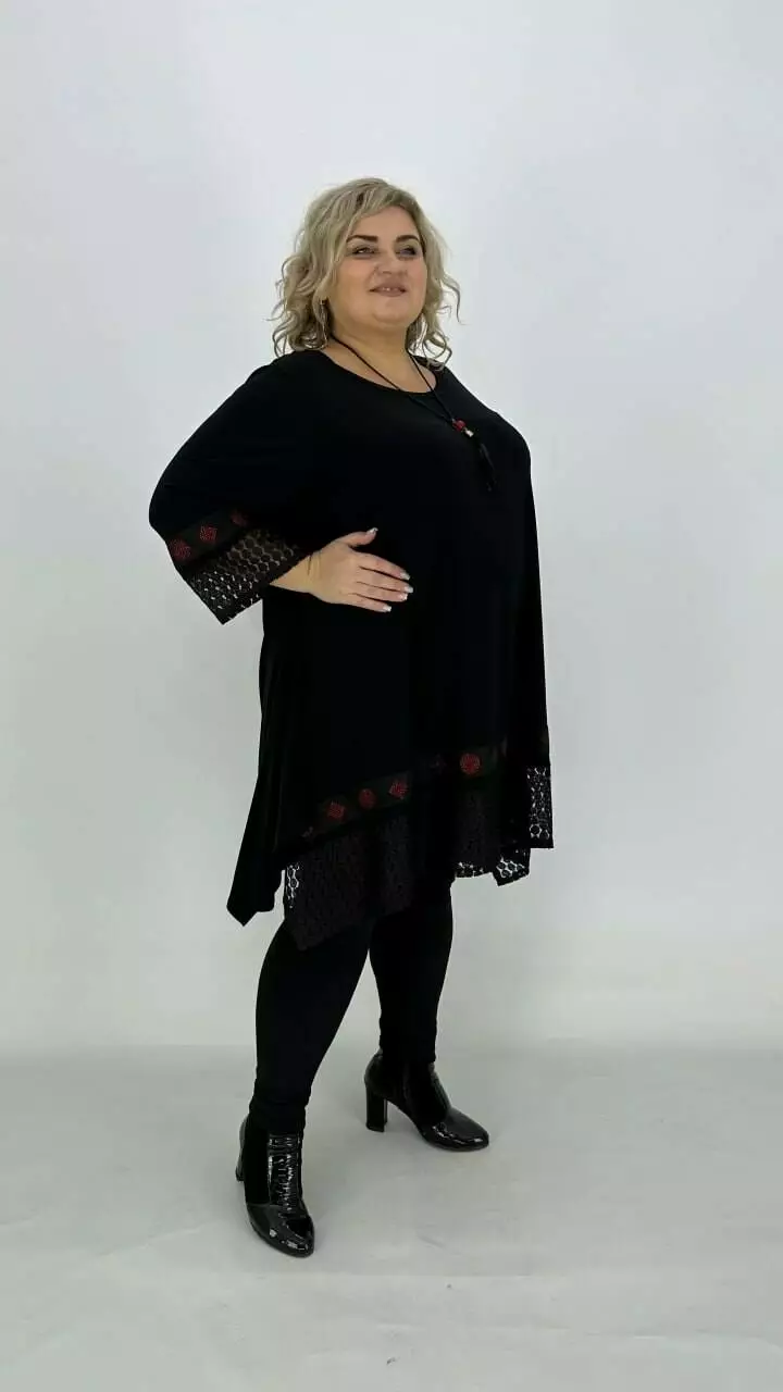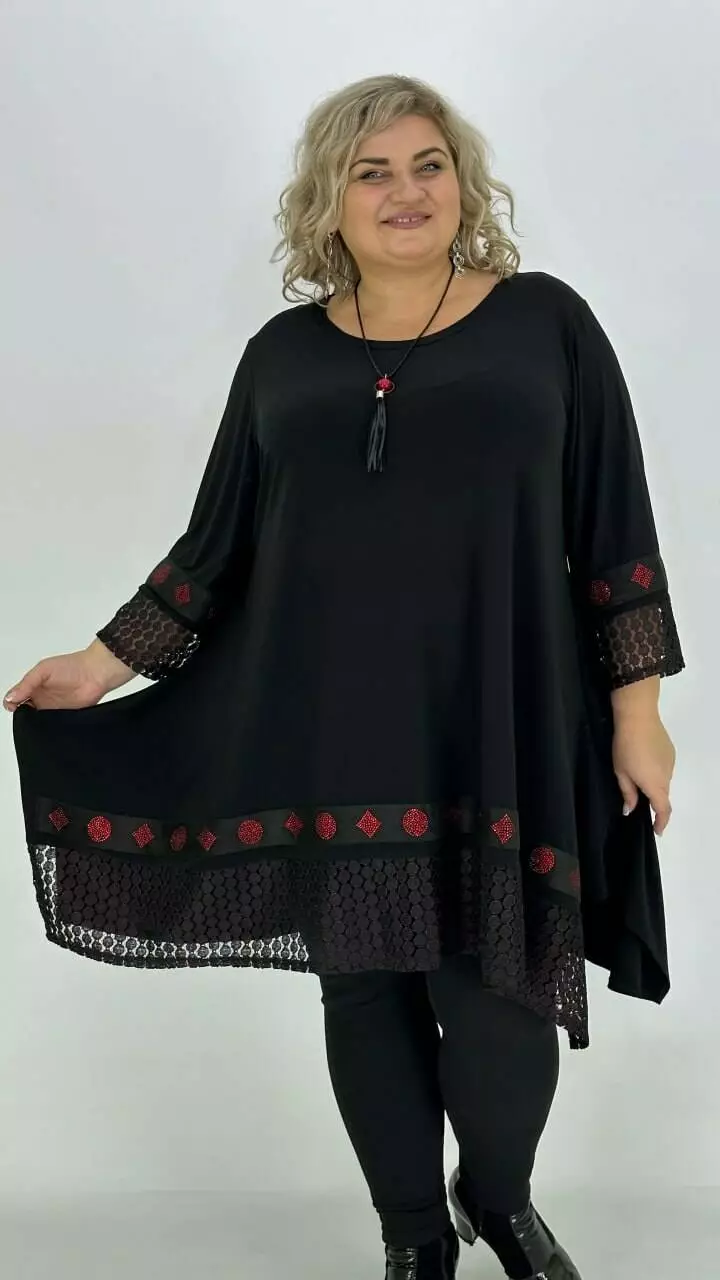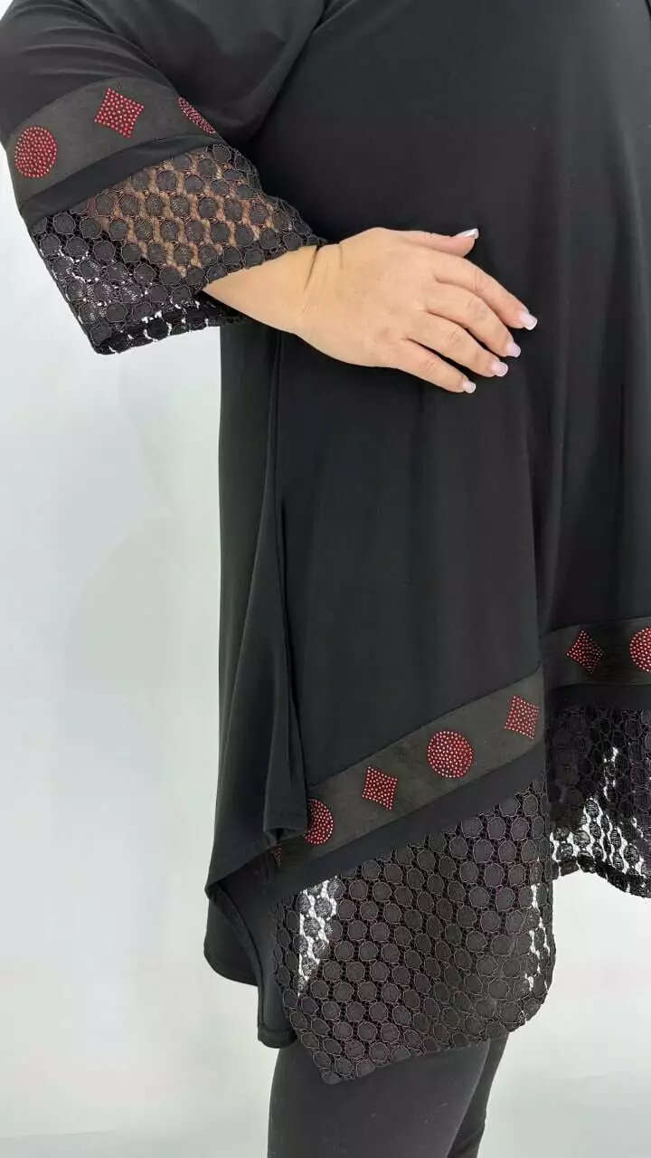 Ошатна туніка з корейського масла з дуже гарною розтяжністю, прикрашена мереживом з люрексом або люрекс тканиною та пришивною тасьмою з каменевою накаткою. Силует вільний з подовженими боками, рукав у точній. Підвіска у подарунок.