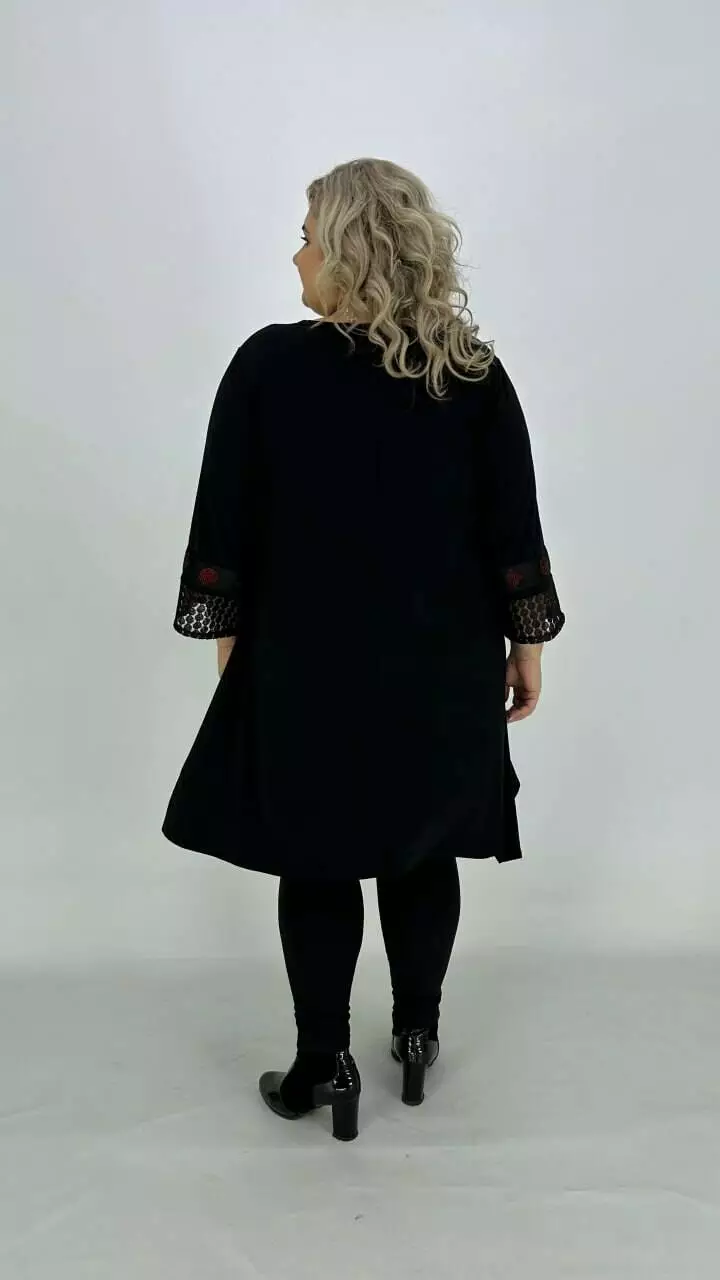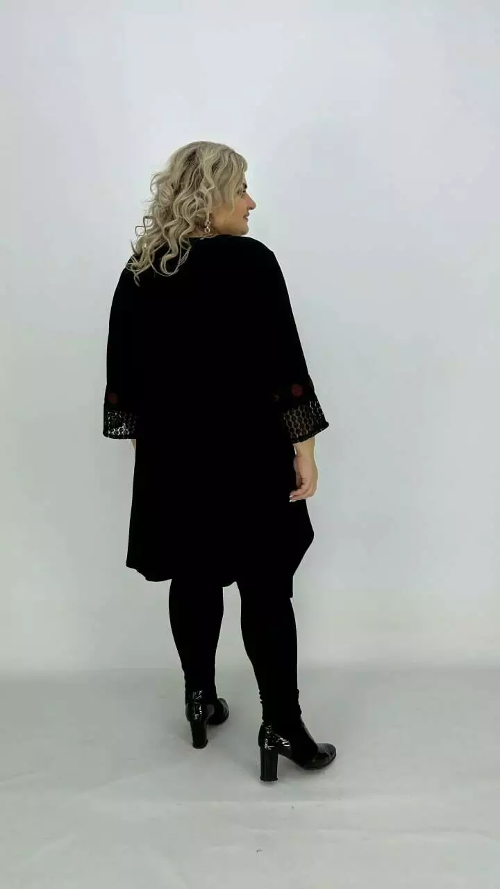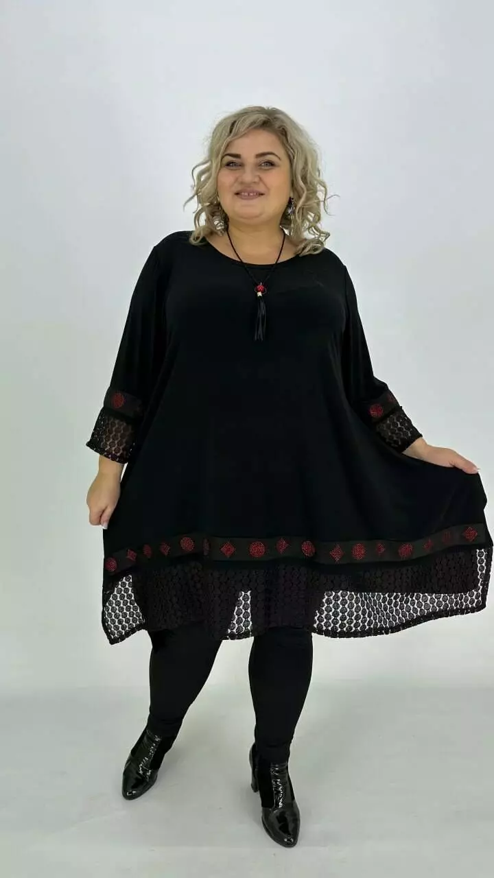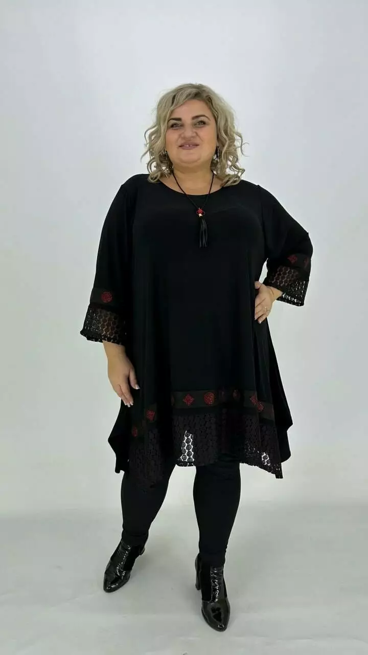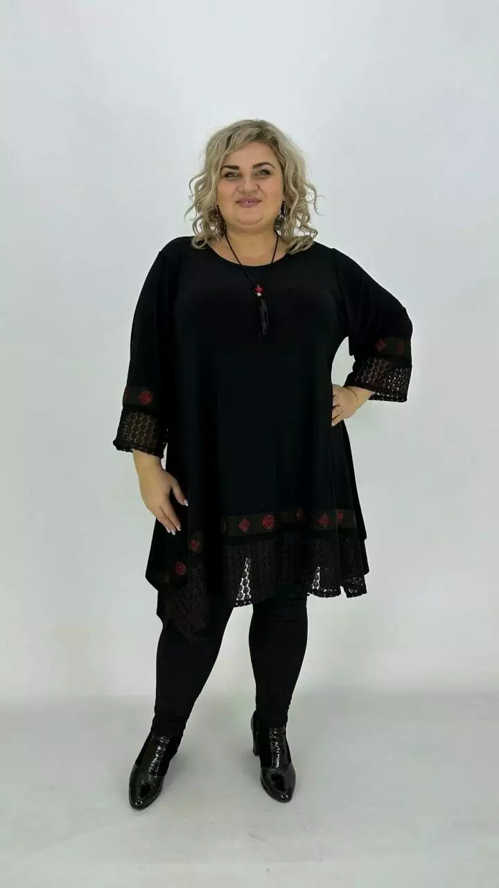 Ошатна туніка з корейського масла з дуже гарною розтяжністю, прикрашена мереживом з люрексом або люрекс тканиною та пришивною тасьмою з каменевою накаткою. Силует вільний з подовженими боками, рукав у точній. Підвіска у подарунок.