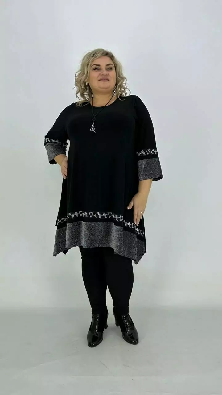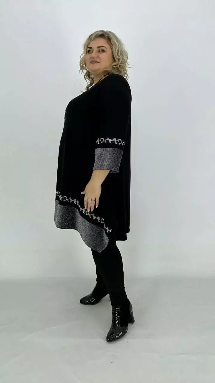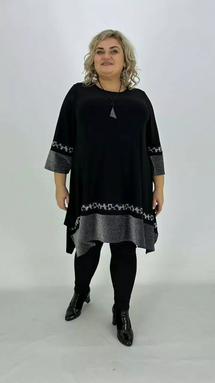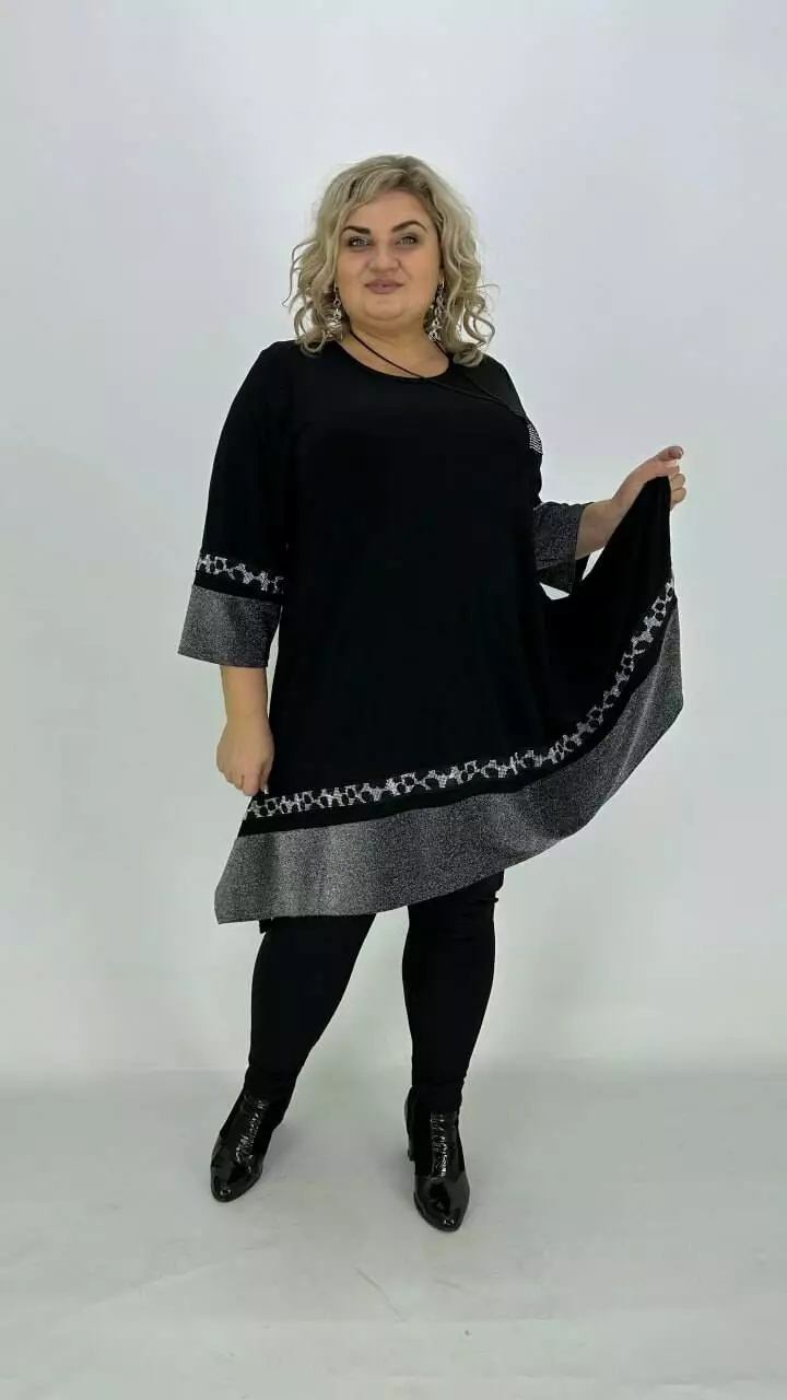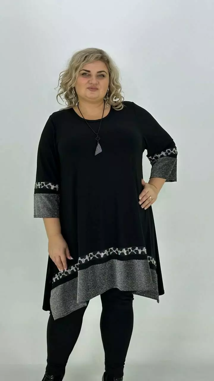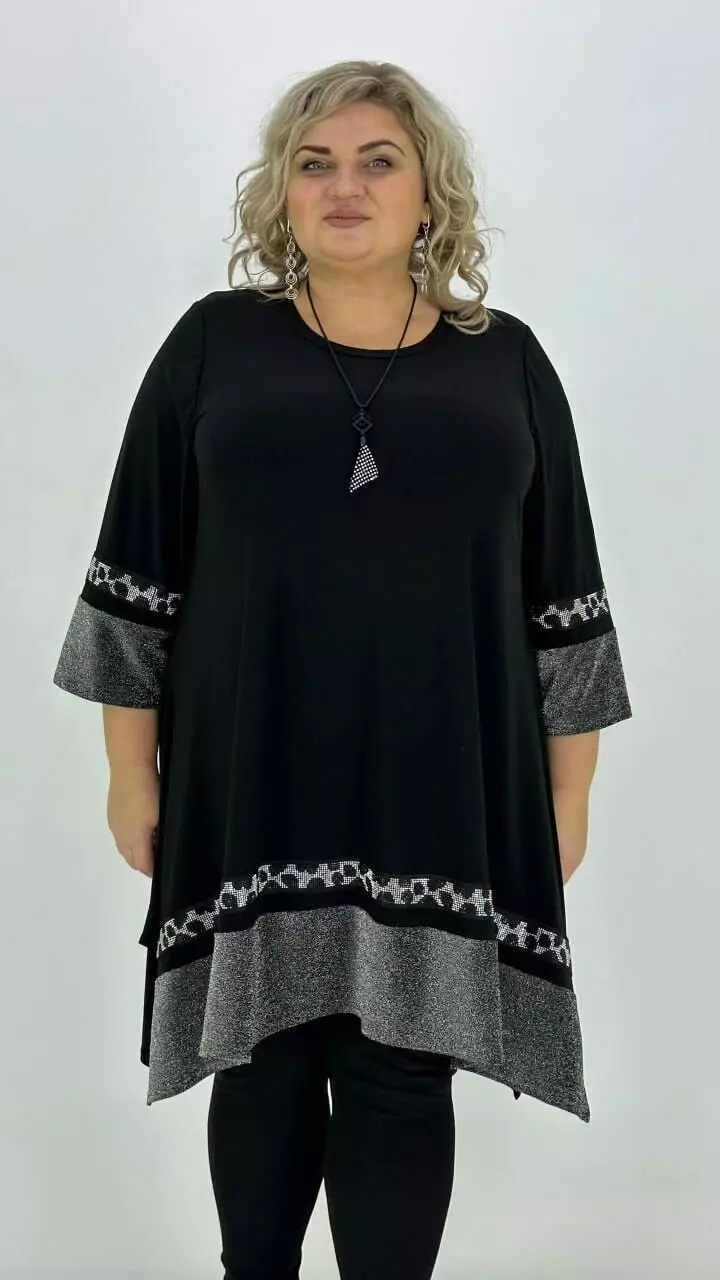 Ошатна туніка з корейського масла з дуже гарною розтяжністю, прикрашена мереживом з люрексом або люрекс тканиною та пришивною тасьмою з каменевою накаткою. Силует вільний з подовженими боками, рукав у точній. Підвіска у подарунок.