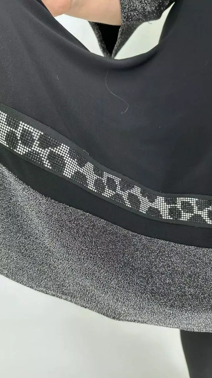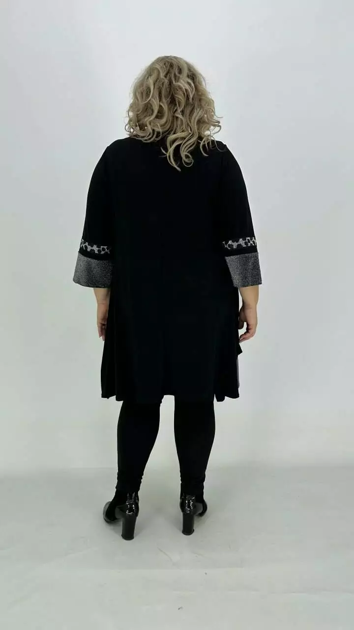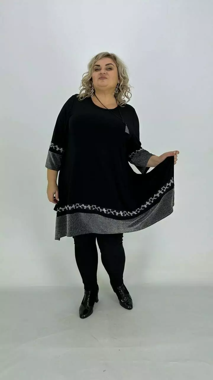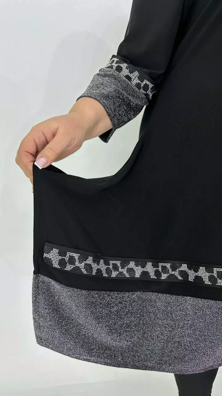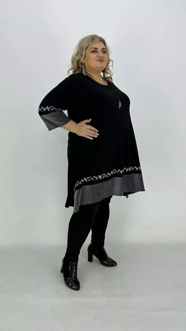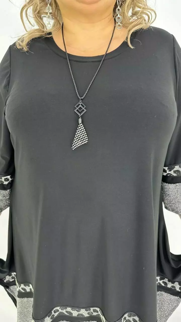 Ошатна туніка з корейського масла з дуже гарною розтяжністю, прикрашена мереживом з люрексом або люрекс тканиною та пришивною тасьмою з каменевою накаткою. Силует вільний з подовженими боками, рукав у точній. Підвіска у подарунок.