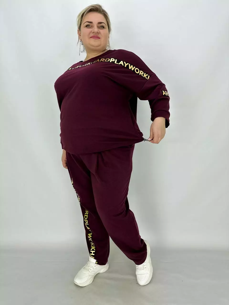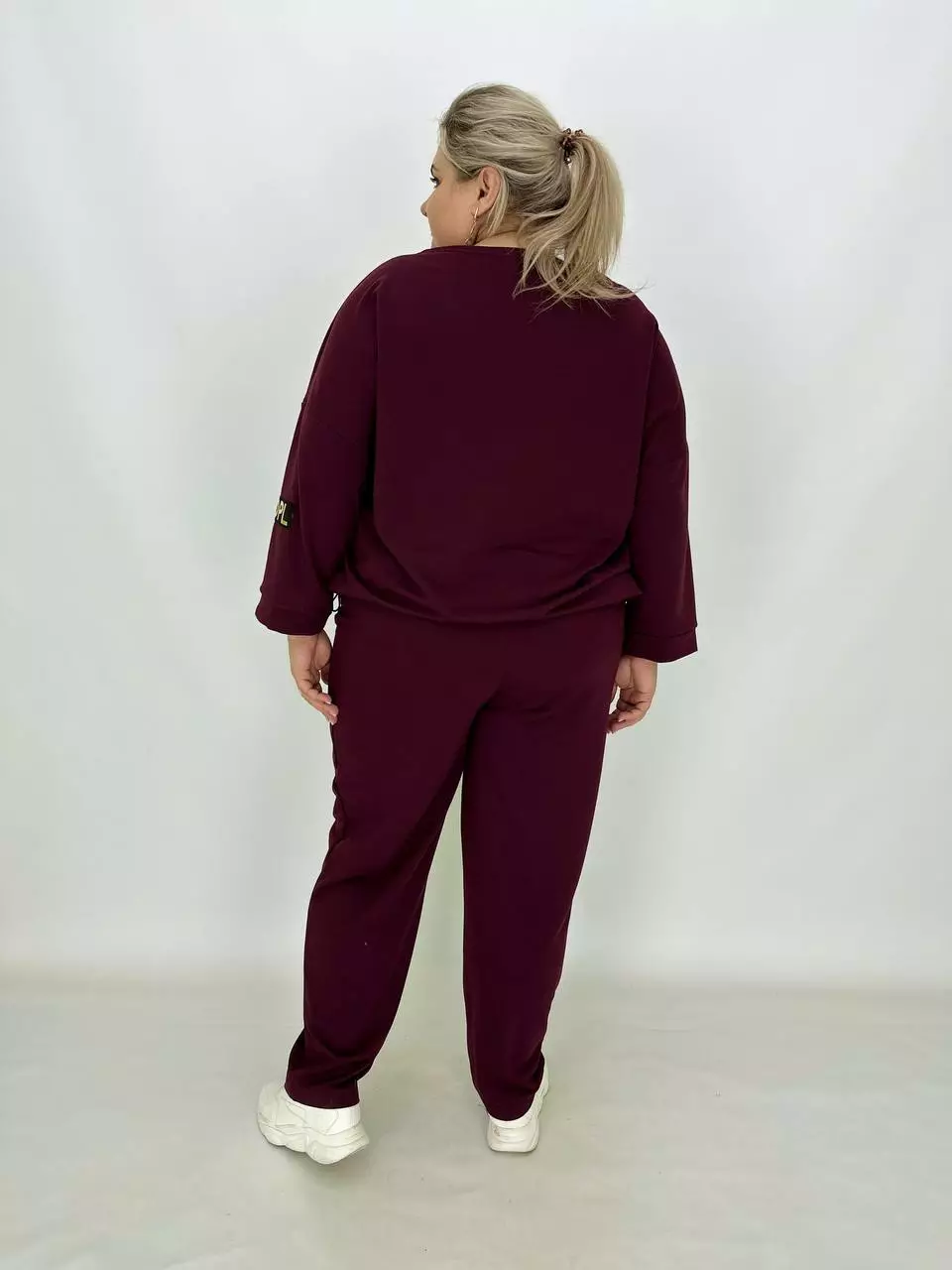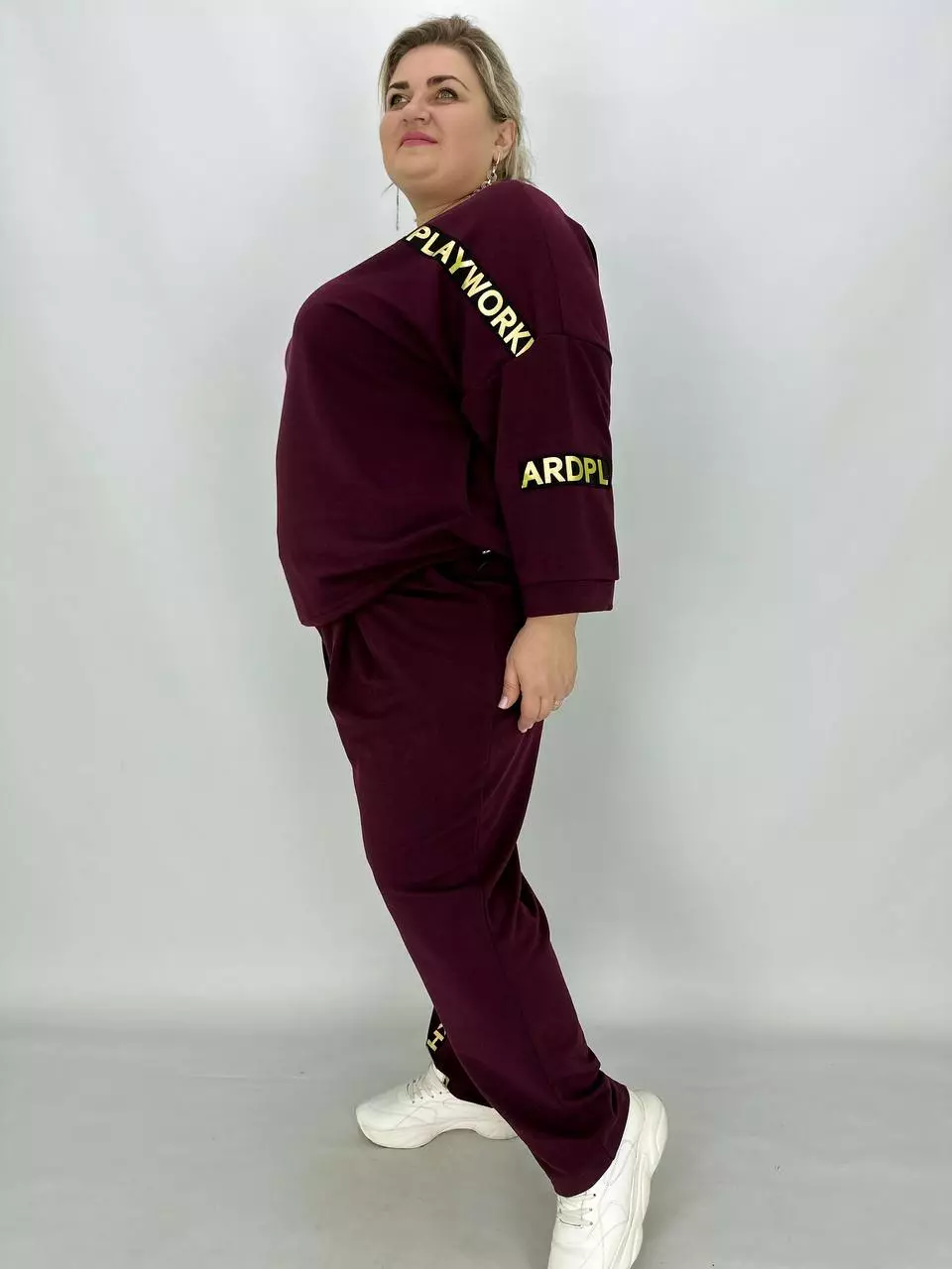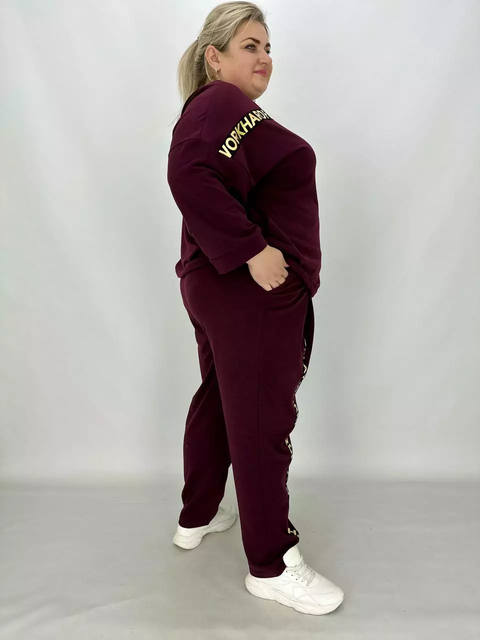 Прогулянковий костюм із двонитки, відмінної якості з гарною розтяжністю, прикрашений пришивною стрічкою з нанесенням з фольга. Кофта-вільний крій зі спущеним плечем, низ регулюється гумками з фіксатором, кишені в бічних швах, горловина човник. Штани-посадка висока, пояс на гумці, з кишенями, по переду закладені зустрічні складки, до низу звужені