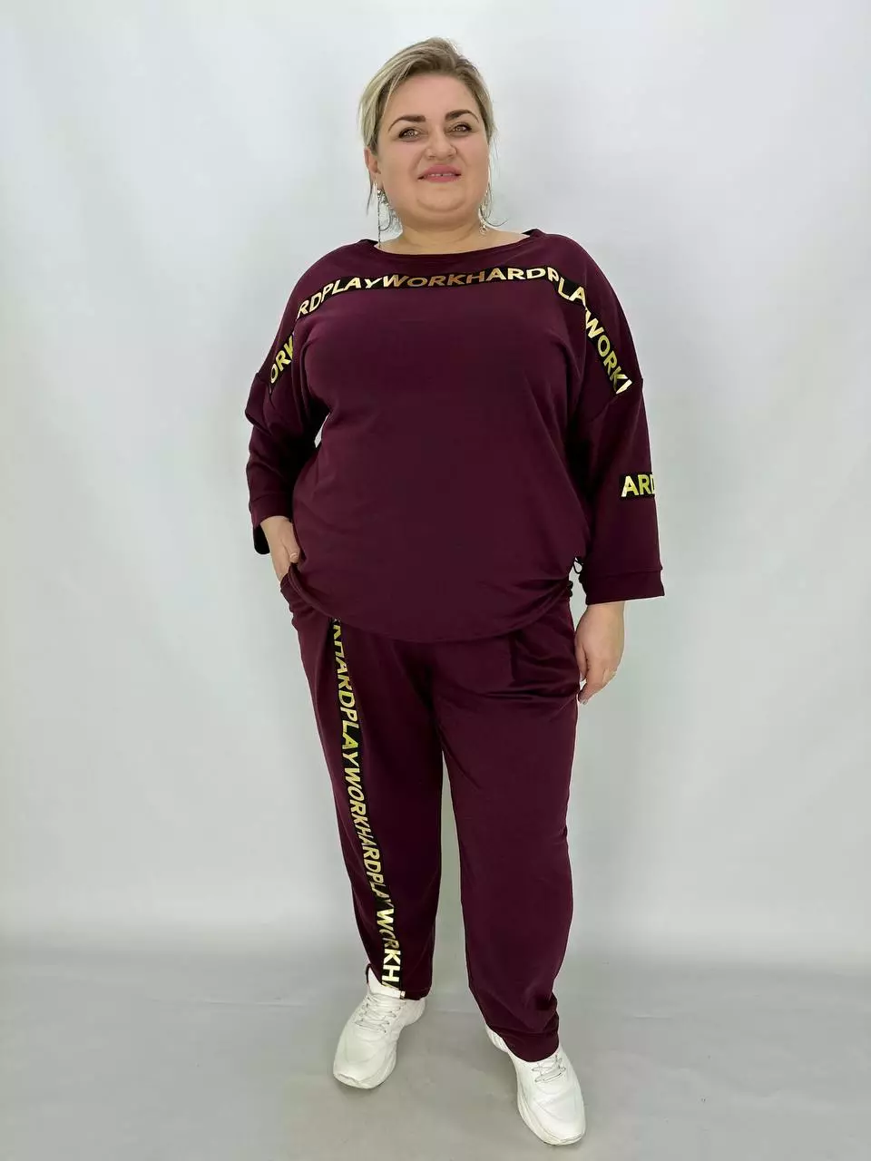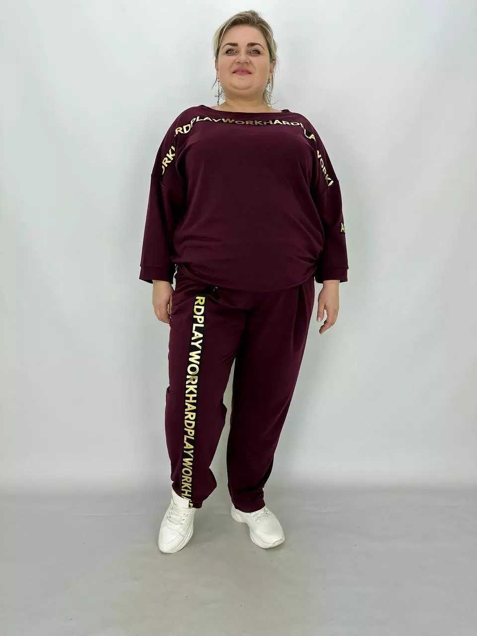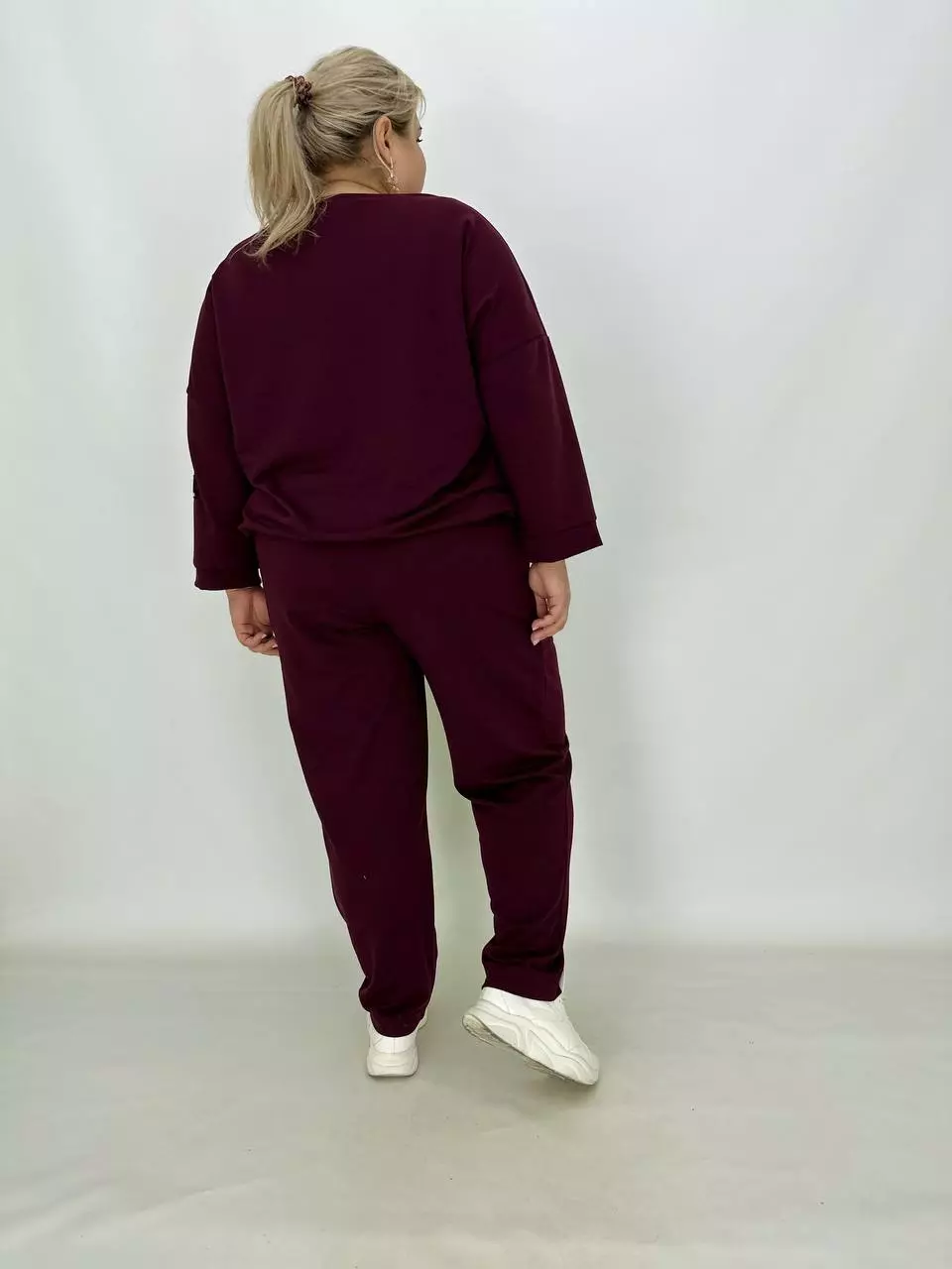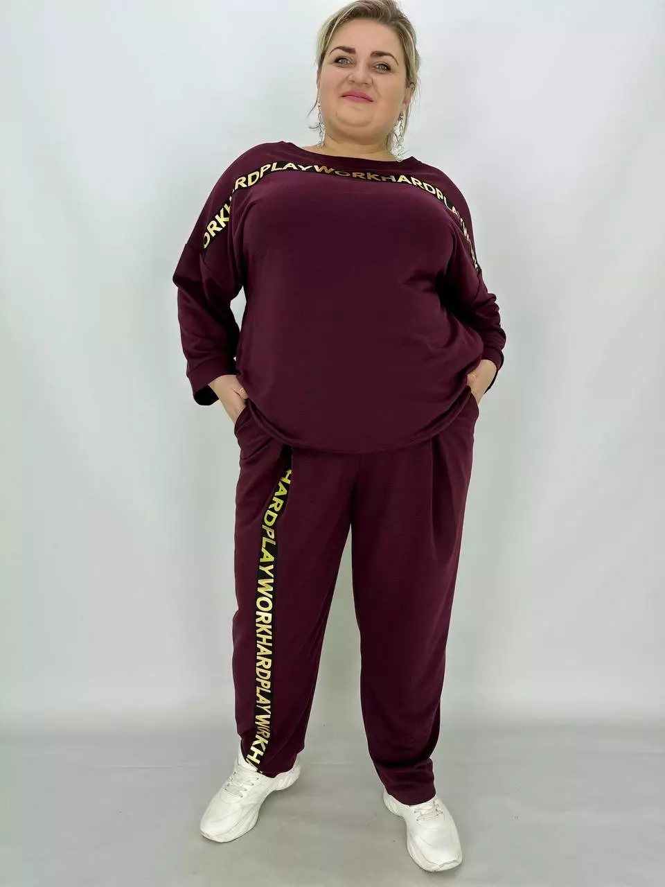 Прогулянковий костюм із двонитки, відмінної якості з гарною розтяжністю, прикрашений пришивною стрічкою з нанесенням з фольга. Кофта-вільний крій зі спущеним плечем, низ регулюється гумками з фіксатором, кишені в бічних швах, горловина човник. Штани-посадка висока, пояс на гумці, з кишенями, по переду закладені зустрічні складки, до низу звужені