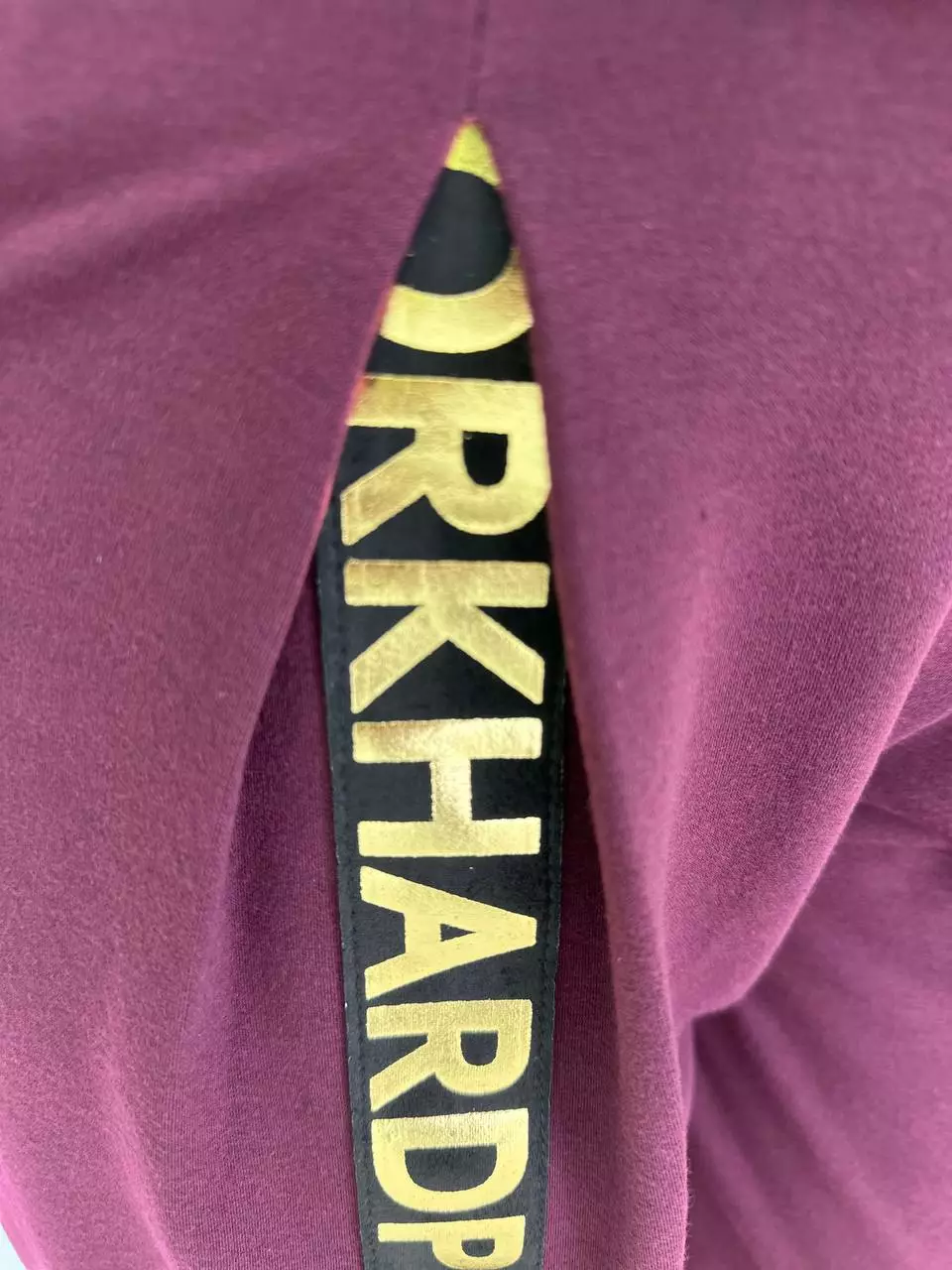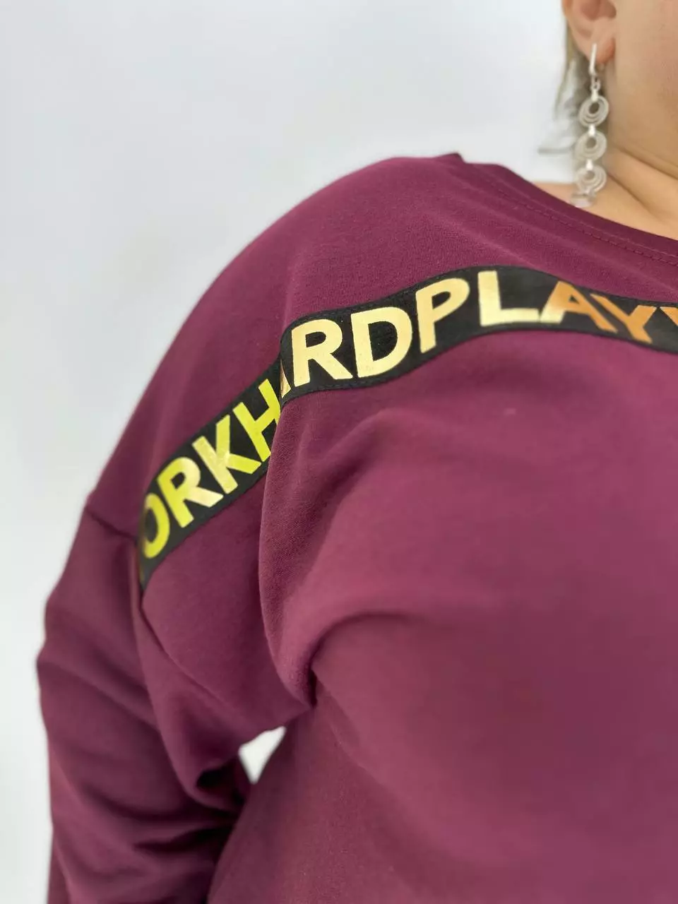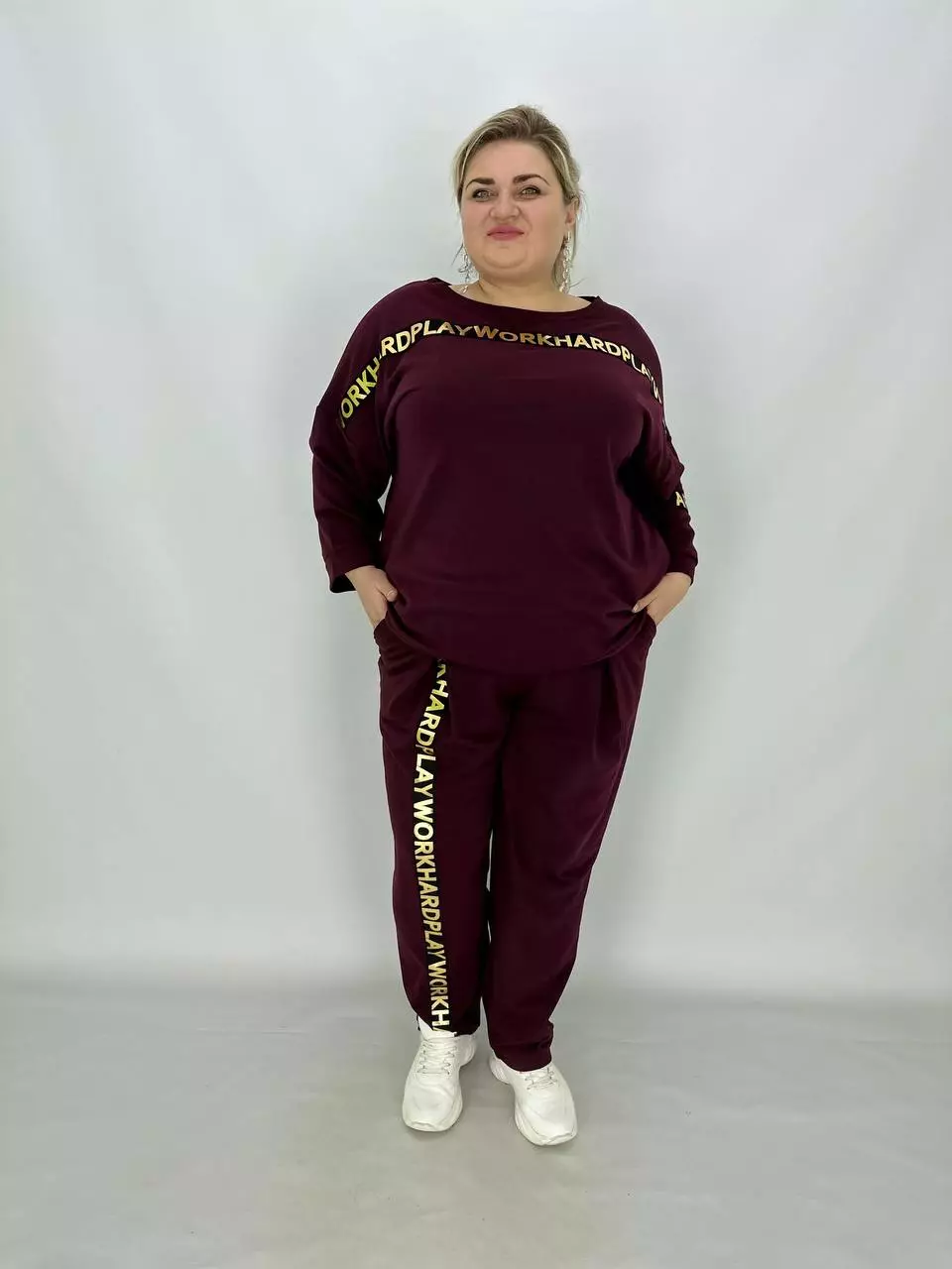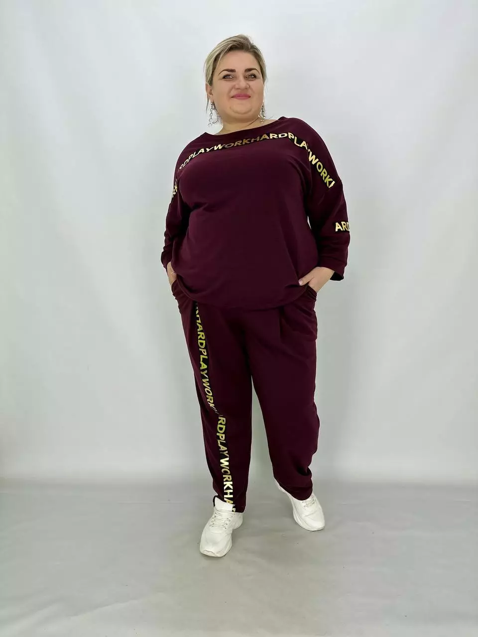 Прогулянковий костюм із двонитки, відмінної якості з гарною розтяжністю, прикрашений пришивною стрічкою з нанесенням з фольга. Кофта-вільний крій зі спущеним плечем, низ регулюється гумками з фіксатором, кишені в бічних швах, горловина човник. Штани-посадка висока, пояс на гумці, з кишенями, по переду закладені зустрічні складки, до низу звужені
