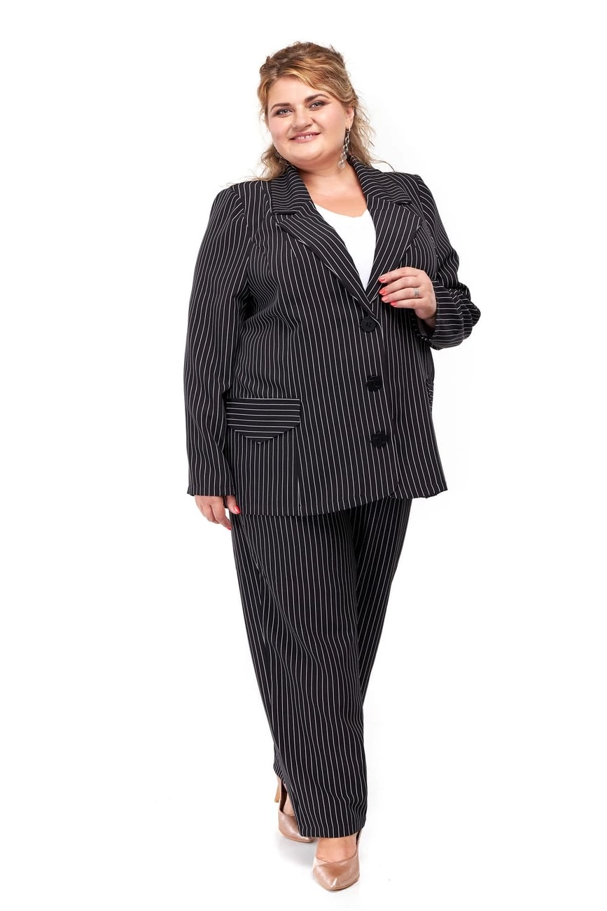 Тканина: костюмна тканина - 70% поліестер; 25% віскоза; 5% еластан. Стильний піджак вільного силуету, застібка - на три гудзики. Виріб має дві накладні кишені. Розміри: 66-68 ог-136-140 от-140 об-144 дв-78 шр-48 др-65; 70-72 ог-144-148 от-142 об-154 дв-78 шр-50 др-65; 74-76 ог-152-156 от-152 об-164 дв-78 шр-52 др-65