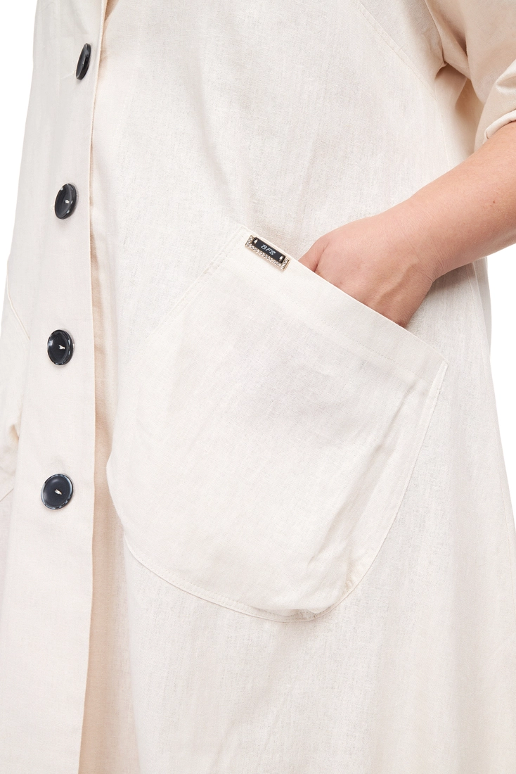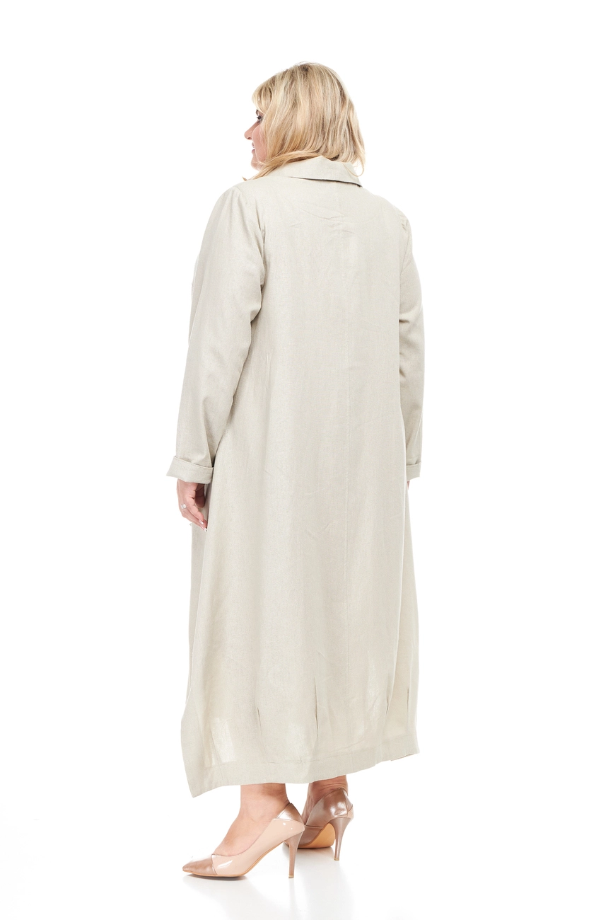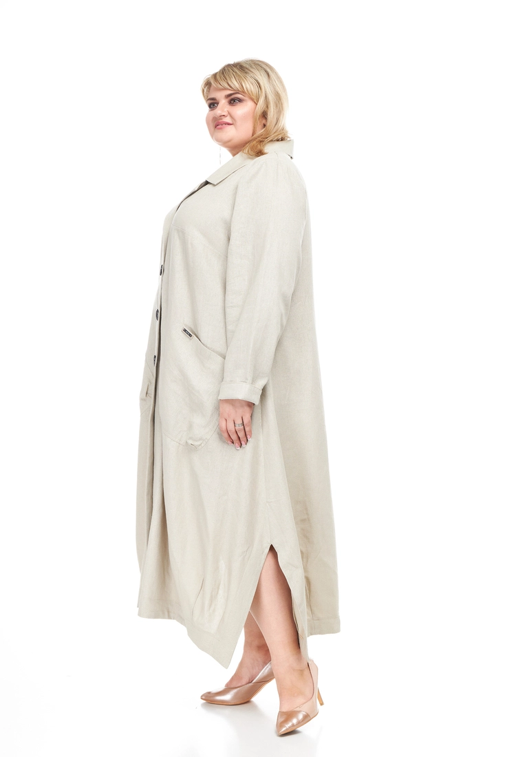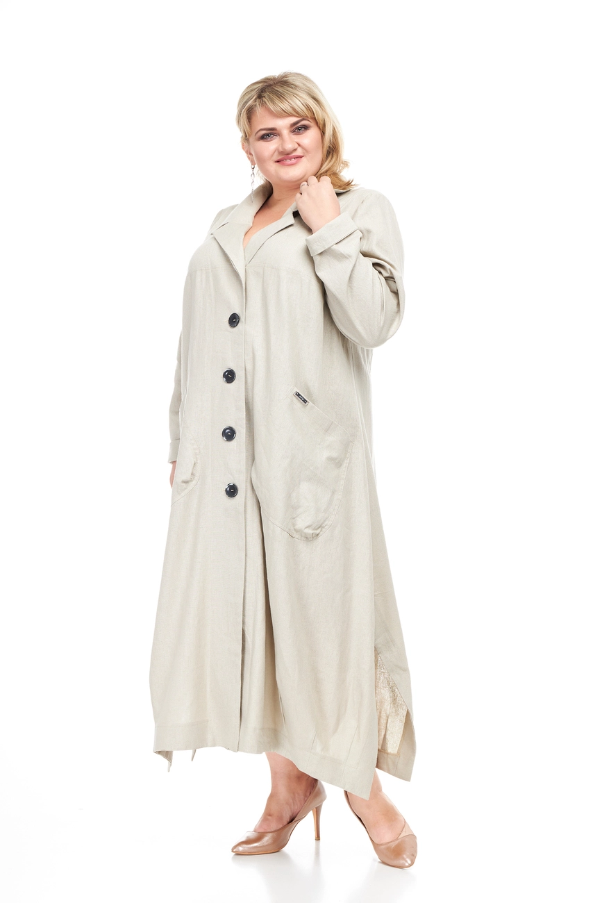 Тканина: льон – 55% льон; 45% змішаний льон. Модний та стильний плащ із тканини льон. Застібається на великі, гарні гудзики; рукав довгий, комір сорочкового вигляду. Виріб має дві великі функціональні кишені. Тканина натуральна, гігроскопічна, добре пропускає повітря. Абсолютна екологічність, зносостійкість та міцність, мінімальна електризуваність, не тягнеться. Виріб прати не вище 40 градусів. Праска з парою полегшить процес прасування, температура не повинна перевищувати 200 градусів.