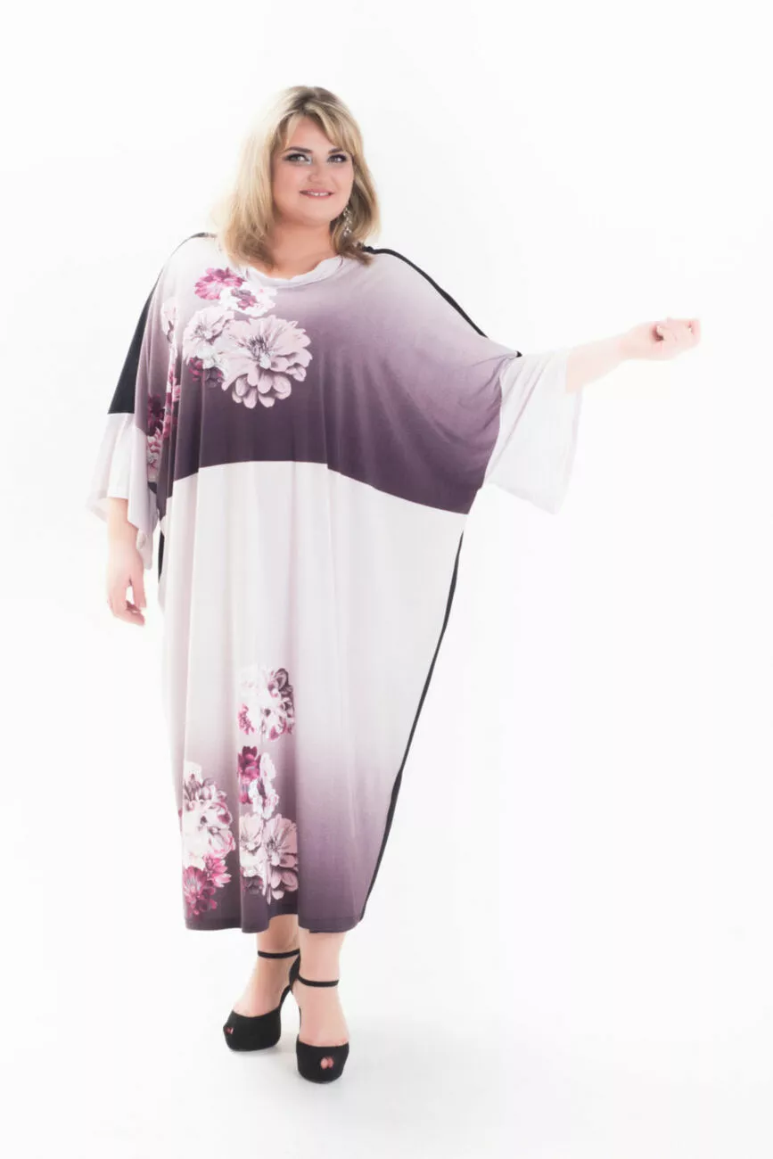 Тканина олія: 70% віскоза; 30% поліестер. Сукня має рукав – реглан, вільного крою та універсальний розмір. Спинка виробу темно-синього кольору. Має гарну розтяжність, добре сідає на фігуру, не вигоряє, не меніться на довго зберігає свої якості. Догляд: делікатне прання, при прасуванні праску нагрівати не вище 110 градусів. Розміри :