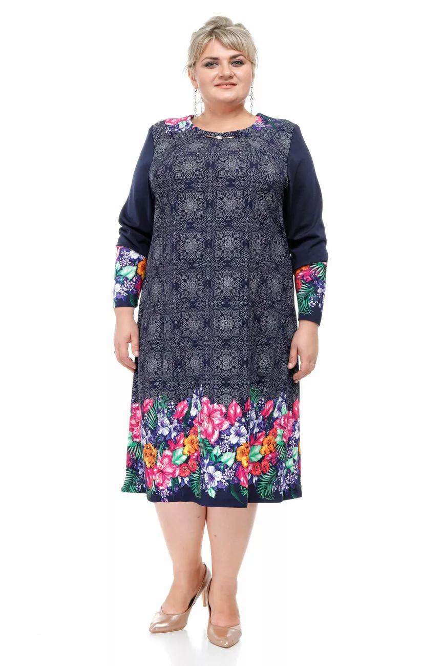 Ткань: французский трикотаж- 77% полиэстер; 18% вискоза; 5% спандекс. Модель выглядит очень ярко и интересно благодаря красивому цветочному принту. Выточки на груди делают модель удобной . Фигурный манжет является модным аксессуаром так же как и украшение колье на горловине золотого цвета с большим граненым белым камнем .Прочная и эластичная, привлекательная на вид, мягкая, бархатистая и приятная. Уход: Стирать в деликатном режиме, при необходимости погладить, температура утюга, не выше 110 градусов. Размеры : 60 ог-120 от-116 об-132 ди-110 шр-46 др-60; 62 ог-124 от-120 об-136 ди-110 шр-48 др-60; 64 ог-128 от-124 об-140 ди-110 шр-50 др-60; 66 ог-132 от-128 об-144 ди-110 шр-52 др-60.
