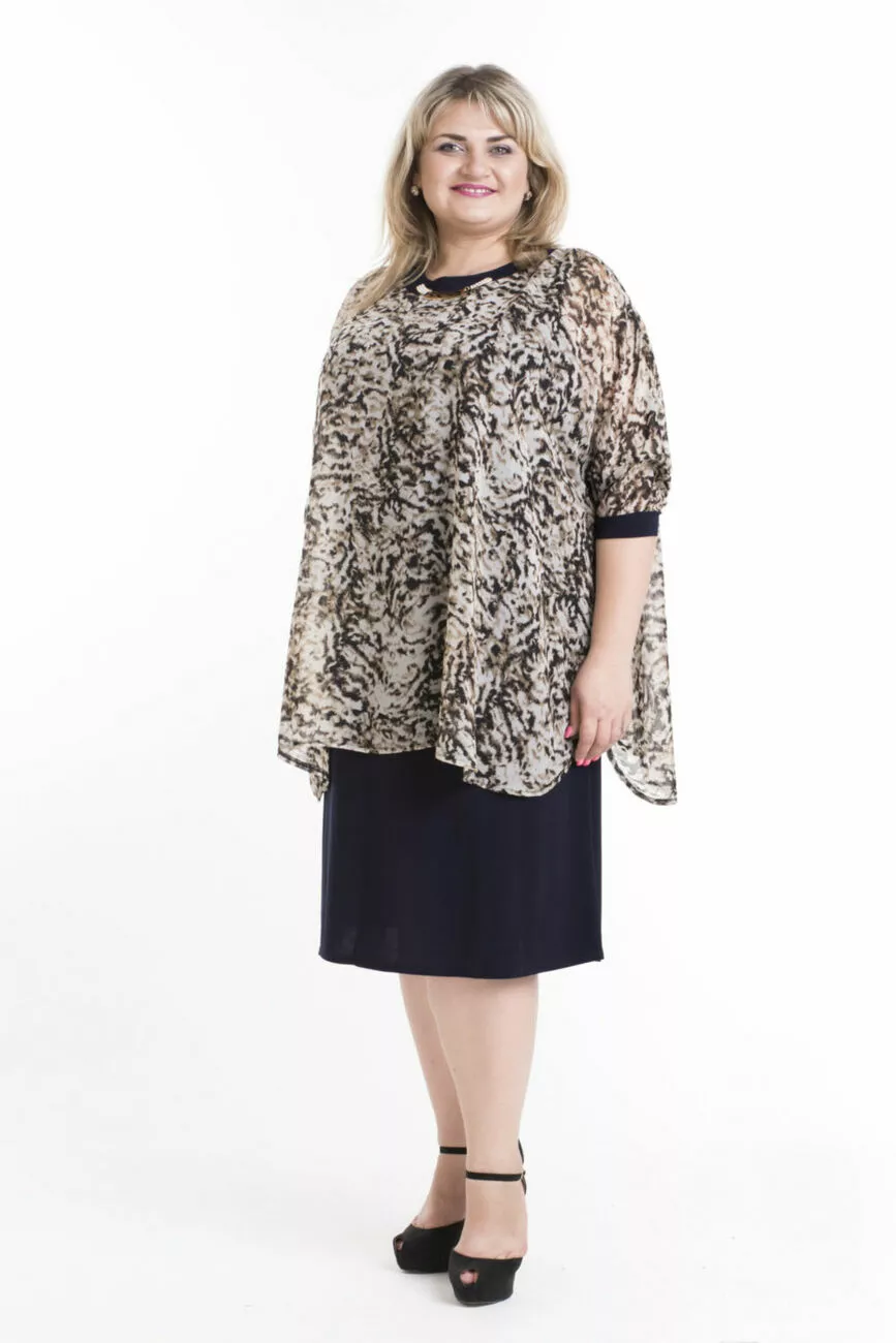 Тканина: олія - 70% поліесте; 20% віскоза; 10% еластан, шифон-100% поліестер. Класична, стильна сукня з накидкою, імітація двійки - накидка з сітки пришита у горловини. Рукав 3/4, горловина кругла, прикрашена декоративним кольє. Виконано з якісної тканини, не вимагає особливого догляду.