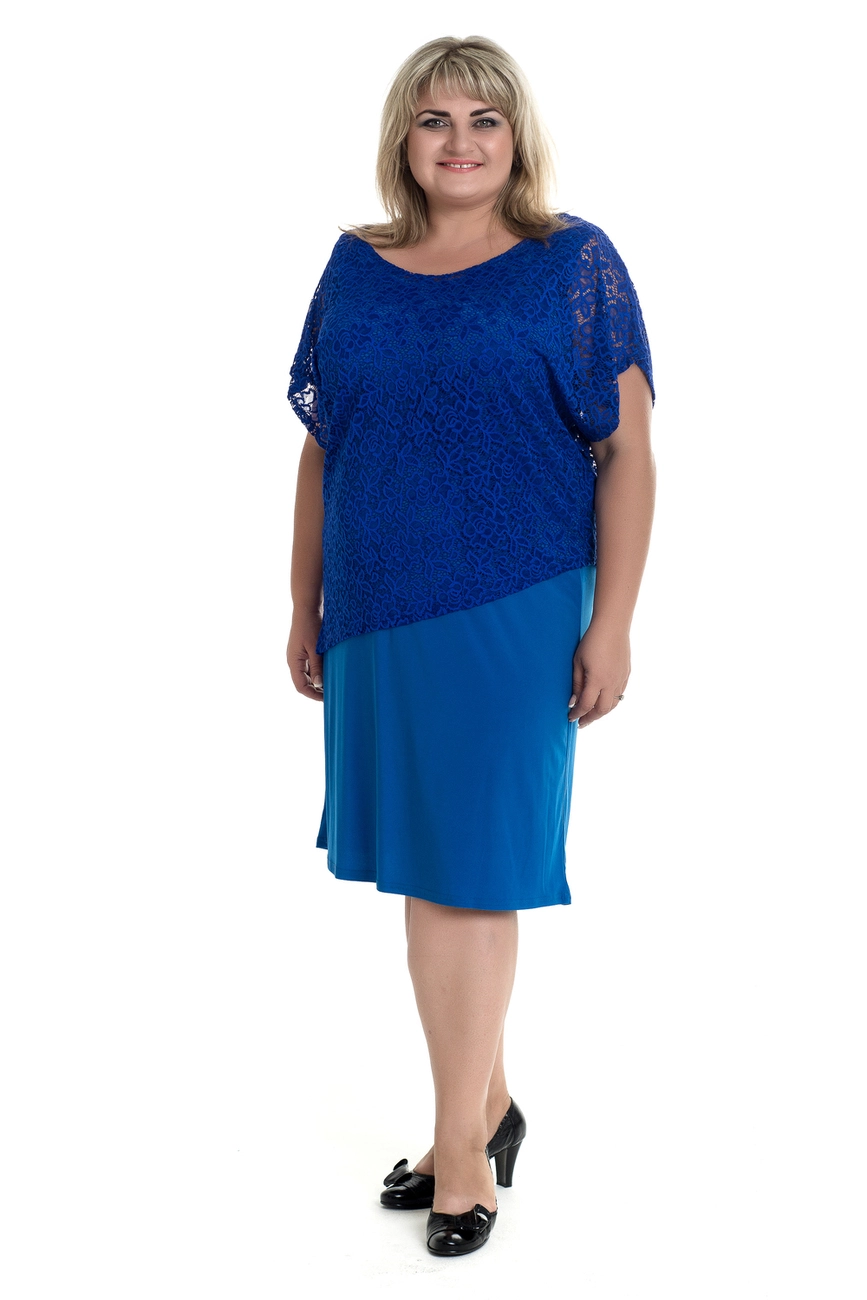 Тканина: олія -70% поліестер, 20% віскоза, 10% еластан; гіпюр-57% поліестер, 40% нейлон, 3% еластан. Модна сукня у діловому стилі напівприлеглого силуету з гіпюровою накидкою. Сукня у вигляді сарафану, накидка з коротким спущеним рукавом. Горловина кругла.