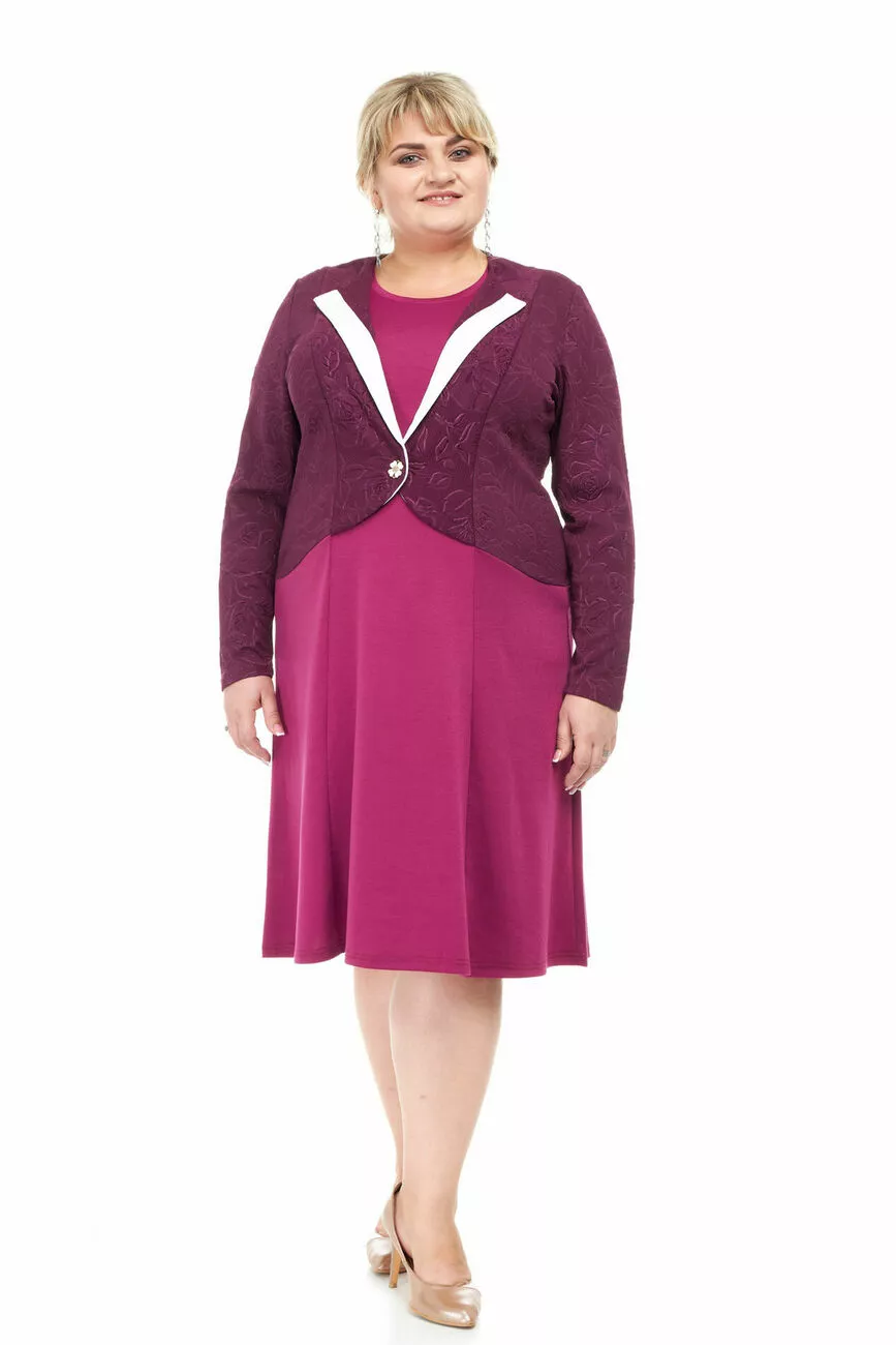 Тканина: французький трикотаж – 77% поліестер; 18% віскозу; 5% спандекс, жаккард -100% полієстер. Красива сукня Двійка з тканини жакард, кукурудза, французький трикотаж. Модель імітація двійки - сукня та болеро. Силует трапеції. Рукав довгий. Горловина кругла.Болеро на гарному ґудзику.