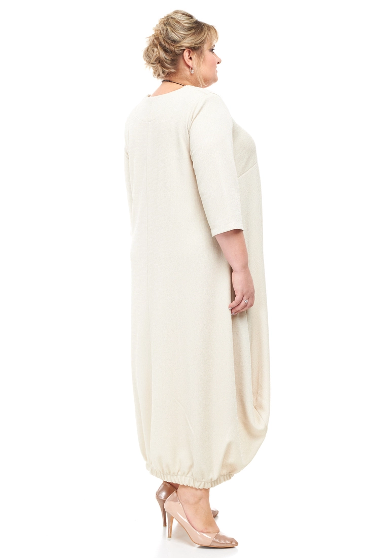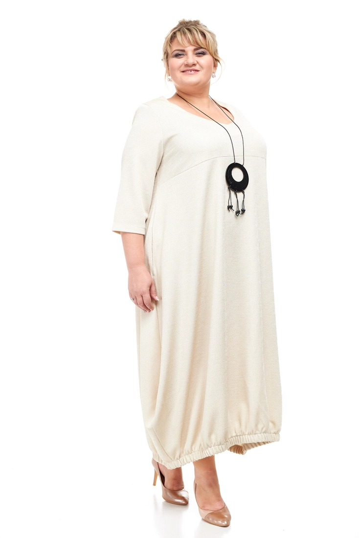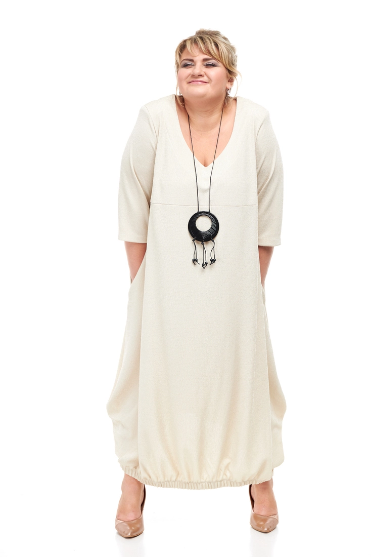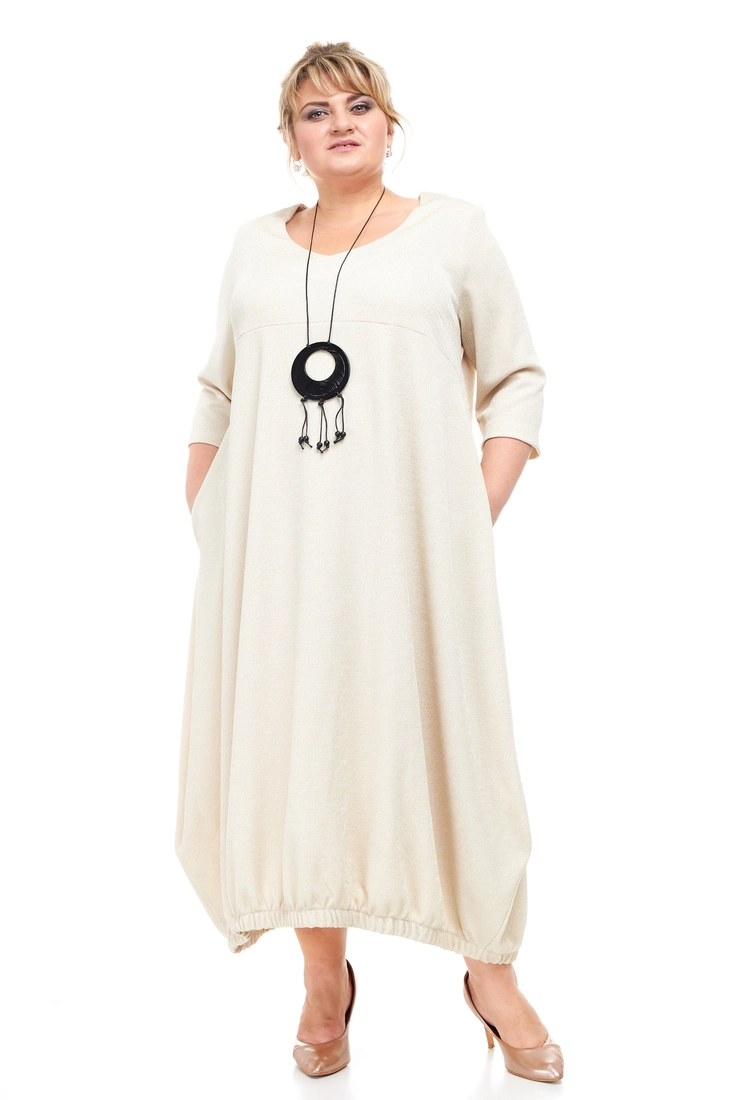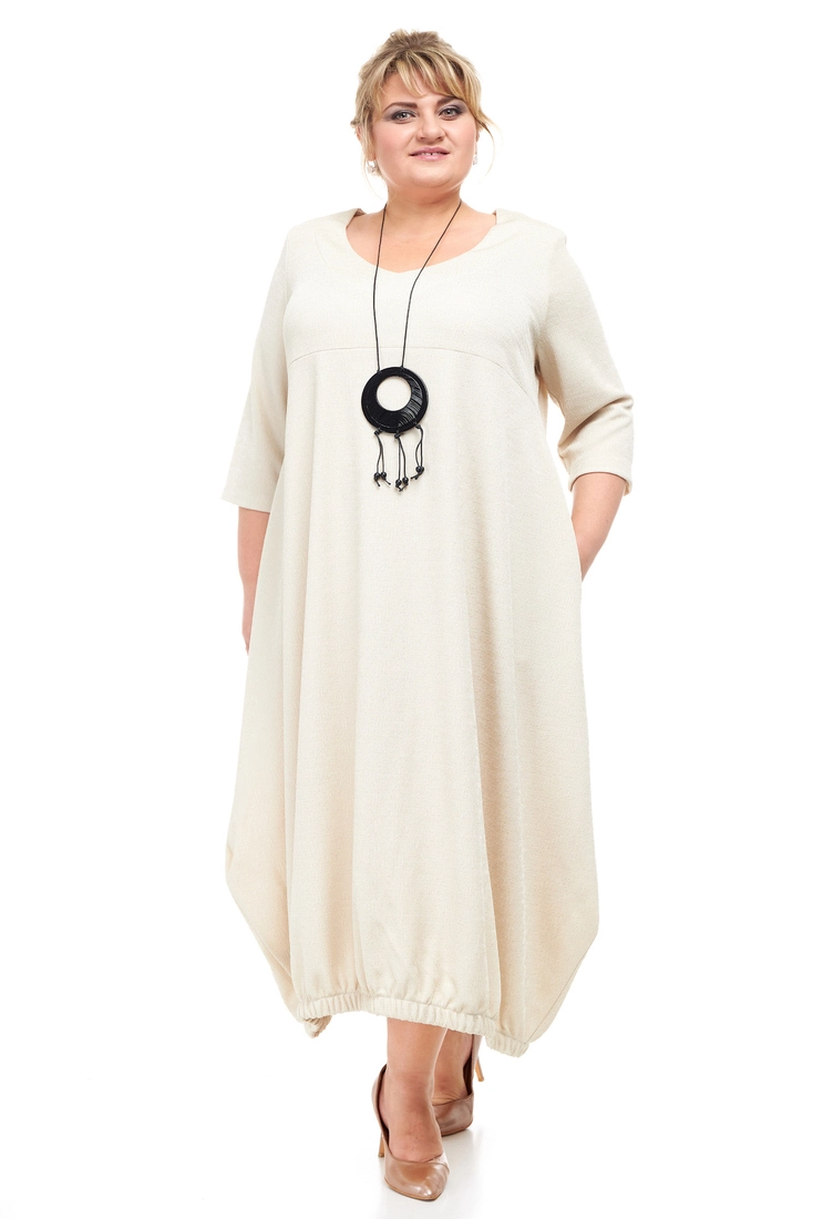 Тканина: фукра - 100% поліестер. Модне, стильне плаття вільного силуету. Рукав 3/4, горловина кругла. Низ виробу зібраний гумкою. У сукні дві кишені у бічних швах. Тканина міцна, хорошої якості, не потребує особливого догляду. Розміри :