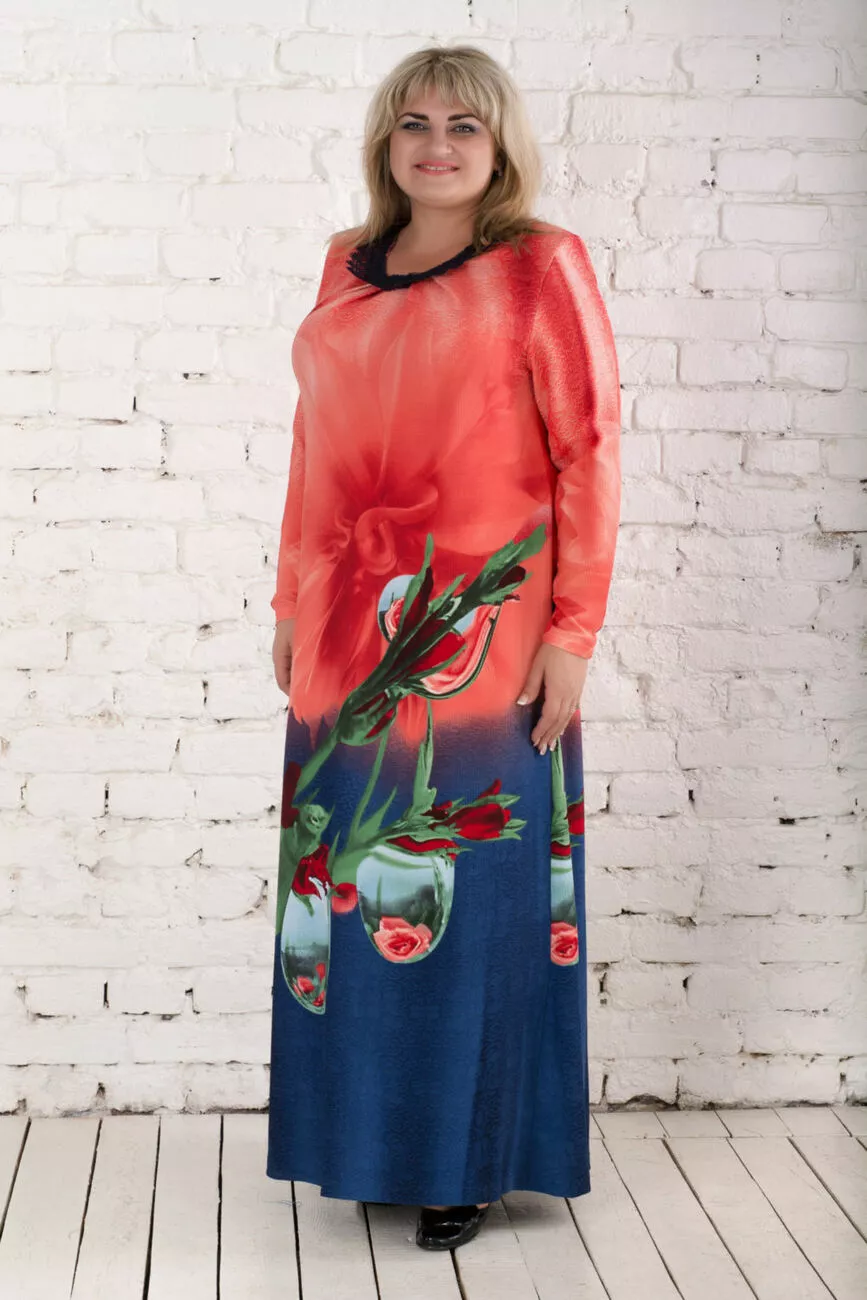 Тканина: кукурудза - 65% віскоза; 30% поліестер; 5% еластан. Красива, стильна сукня виготовлена з тканини трикотаж кукурудза. Рукав довгий, горловина кругла, прикрашена мереживом. Принт омбре з двох кольорів і красивий природний принт у вигляді краплі. Тканина досить тепла, не потребує особливого догляду.