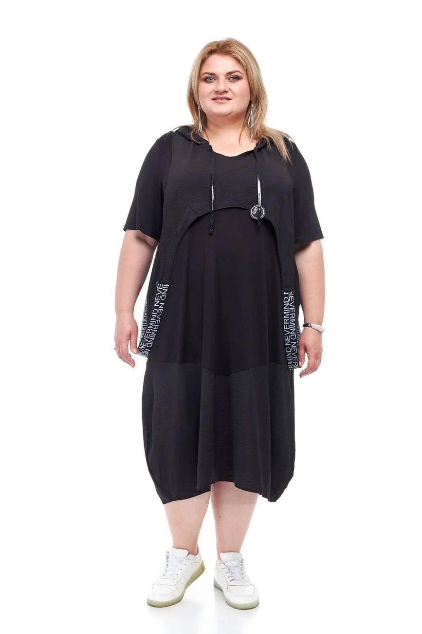 Тканина: віскоза – 95% віскоза, 5% еластан; змішаний льон - 50% бавовна, 40% льон, 10% поліестер. Модне, стильне плаття вільного силуету, типу балахон - з накидкою на декоративних шпильках. Виріб з капюшоном, короткий рукав.