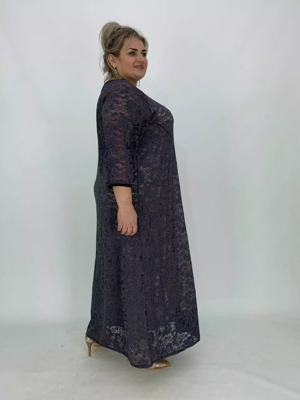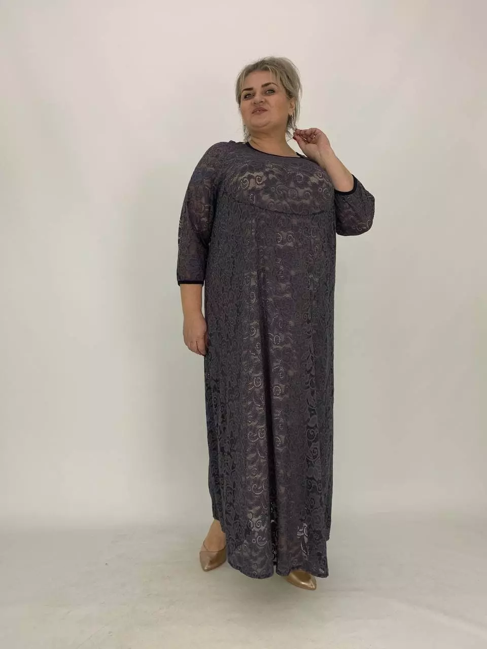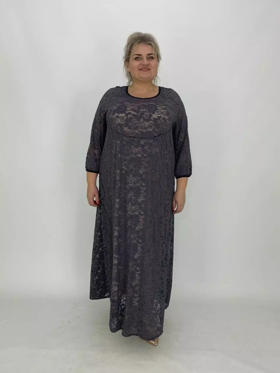 Тканина: масло - 70% поліестер, 20% віскоза, 10% еластан та гіпюр 100% поліестер. Ошатне плаття з Трикотажного гіпюру з гарною розтяжністю, на трикотажній підкладці. А-образний силует, рукав реглан унизу присобраний. Тканина-красивий гіпюр, добре тягнеться, не мнеться.Рекомендована прання вручному режимі при температурі 30 градусів. Розміри :