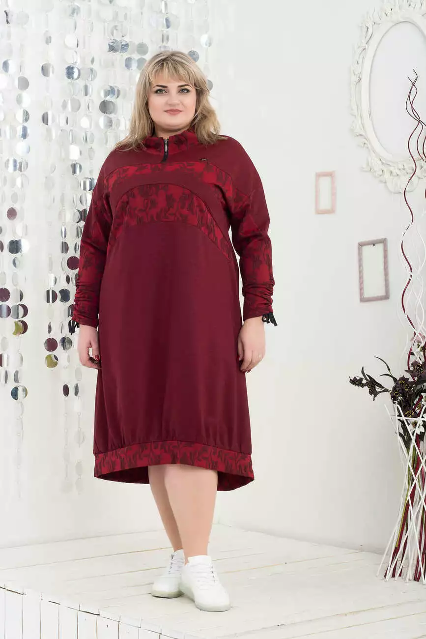 Тканина: жакард -100% поліестер. Тепла, м'яка, стильна сукня напівприлеглого силуету. Рукав довгий на затяжках унизу, горловина висока на робочій змійці. Виріб має дві кишені у бокових швах.