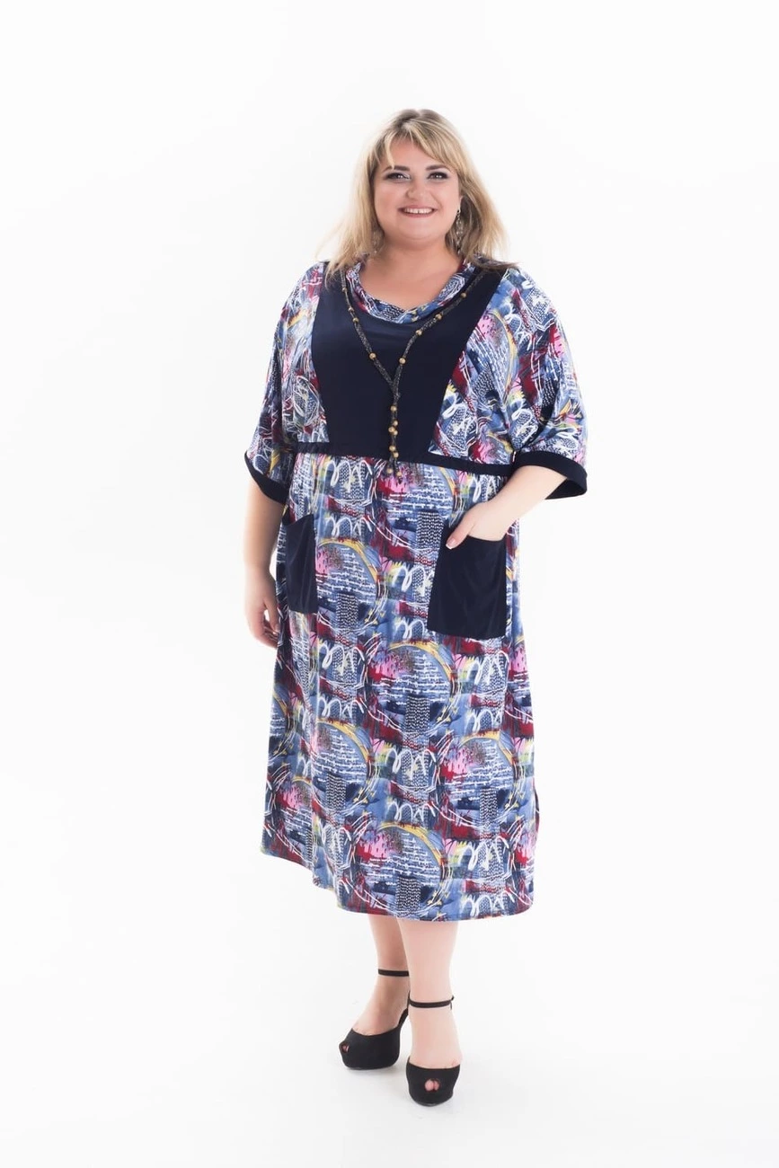 Тлошадь: масло -70% полиэстер; 20% вискоза; 10% эластон. Стильное платье полуприлегающего силуэта. Рукав 3/4, круглая горловина хомутиком. Изделие имеет два накладных, функциональных кармана и украшение в виде бусы. Размеры: 62-64 ог-128 от-124 об-148 дв-117; 66-68 ог-138 от-134 об-158 дв-117; 70-72 ог-148 от-144 об-168 дв-117