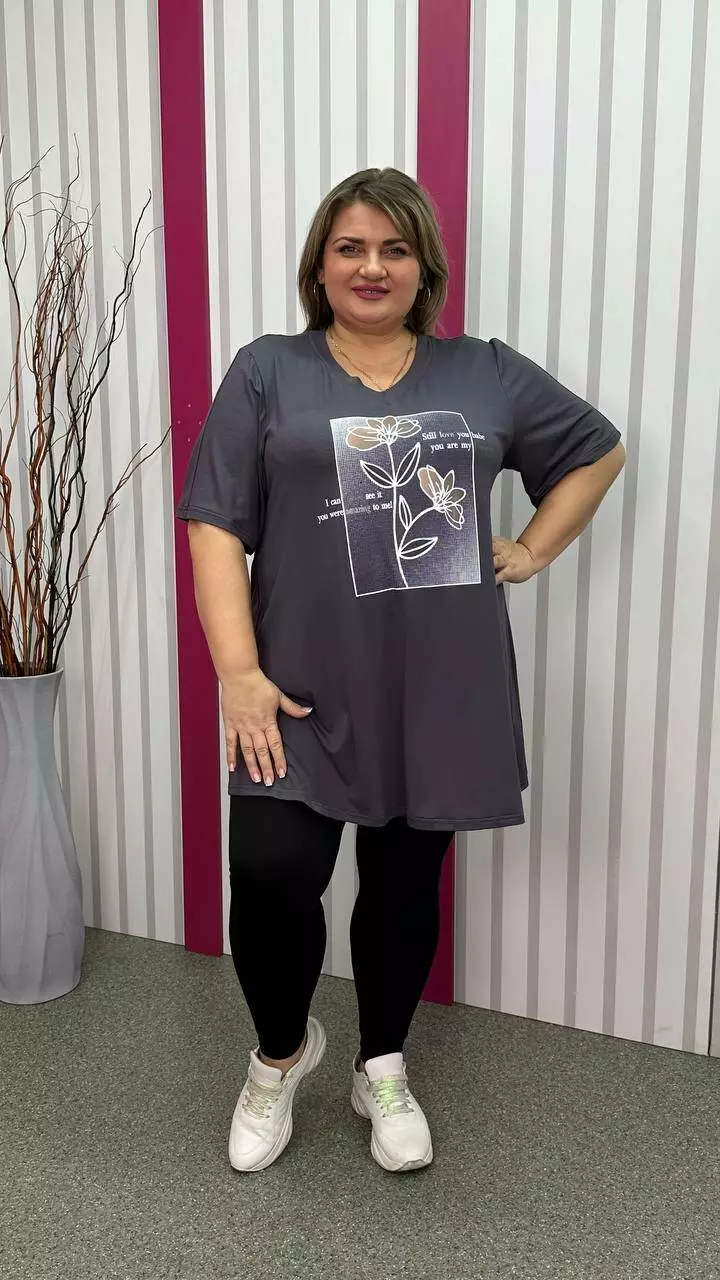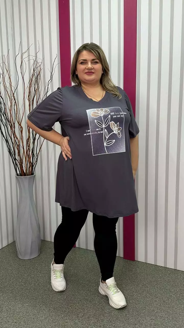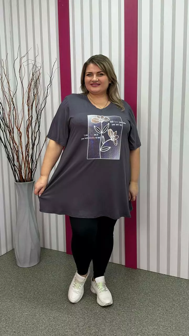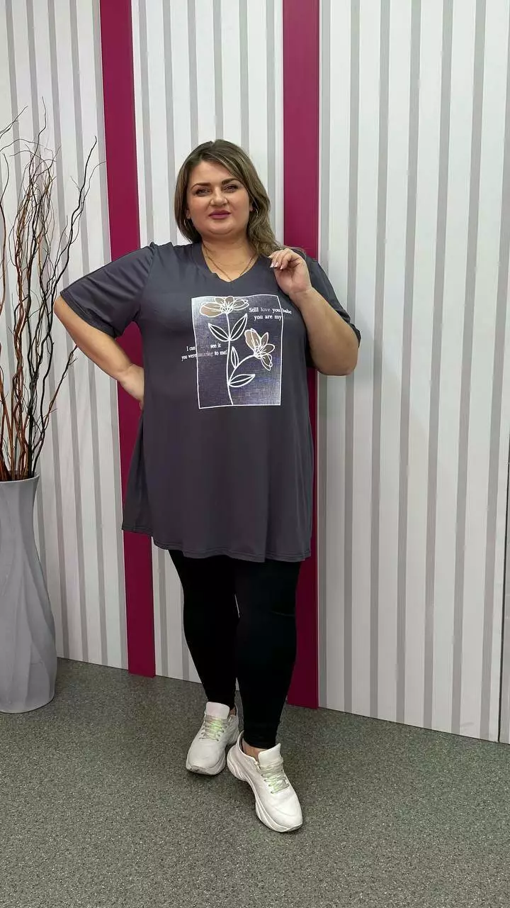 Розкльошена та подовжена футболка з трикотажу віскоза виробництва Туреччина. Легка, м'яка тканина з гарною розтяжністю, не кашлатиться. Силует-трапеція, рукав втачний, горловина мисик, прикрашена якісним накатом.