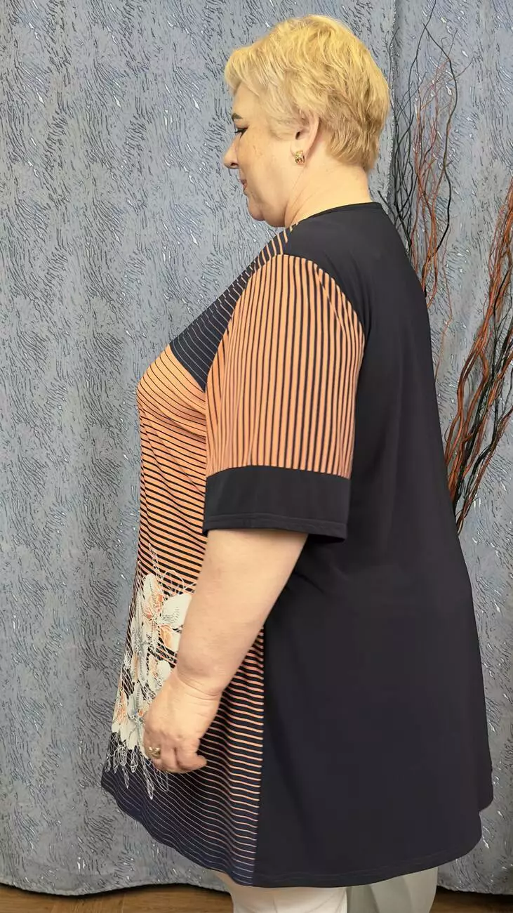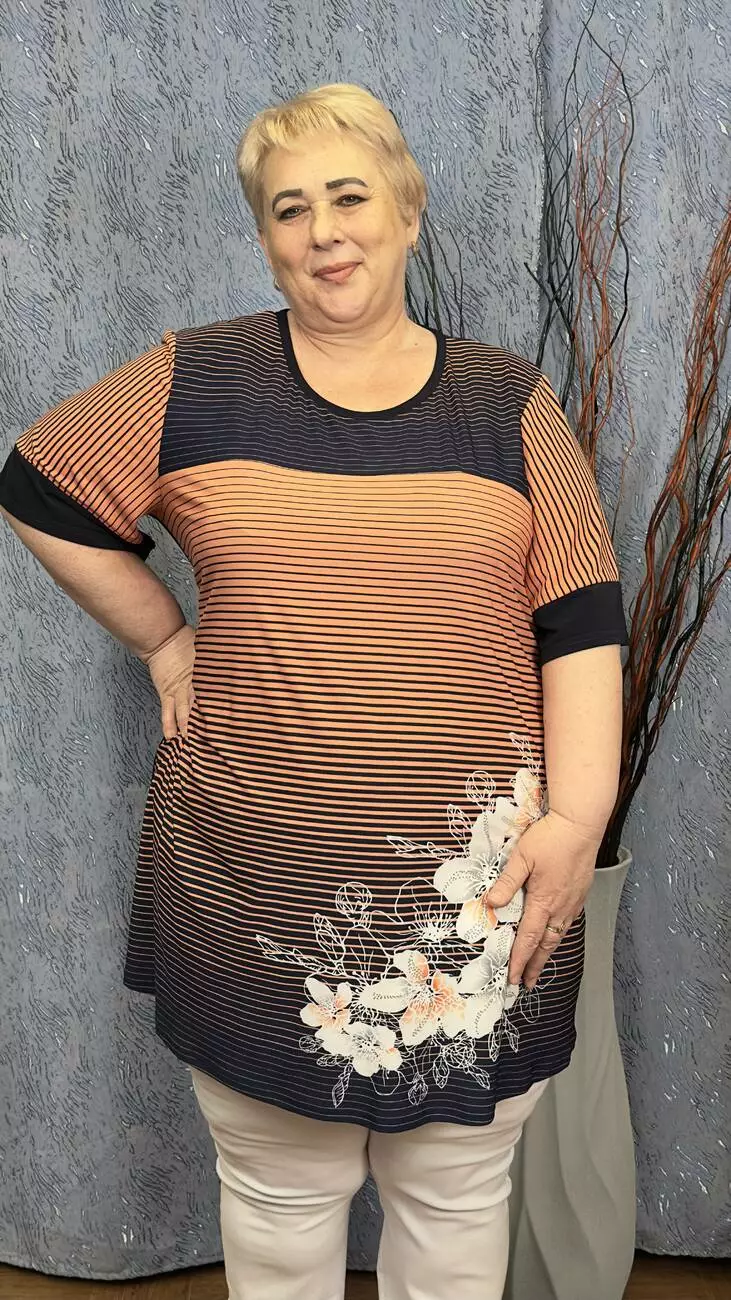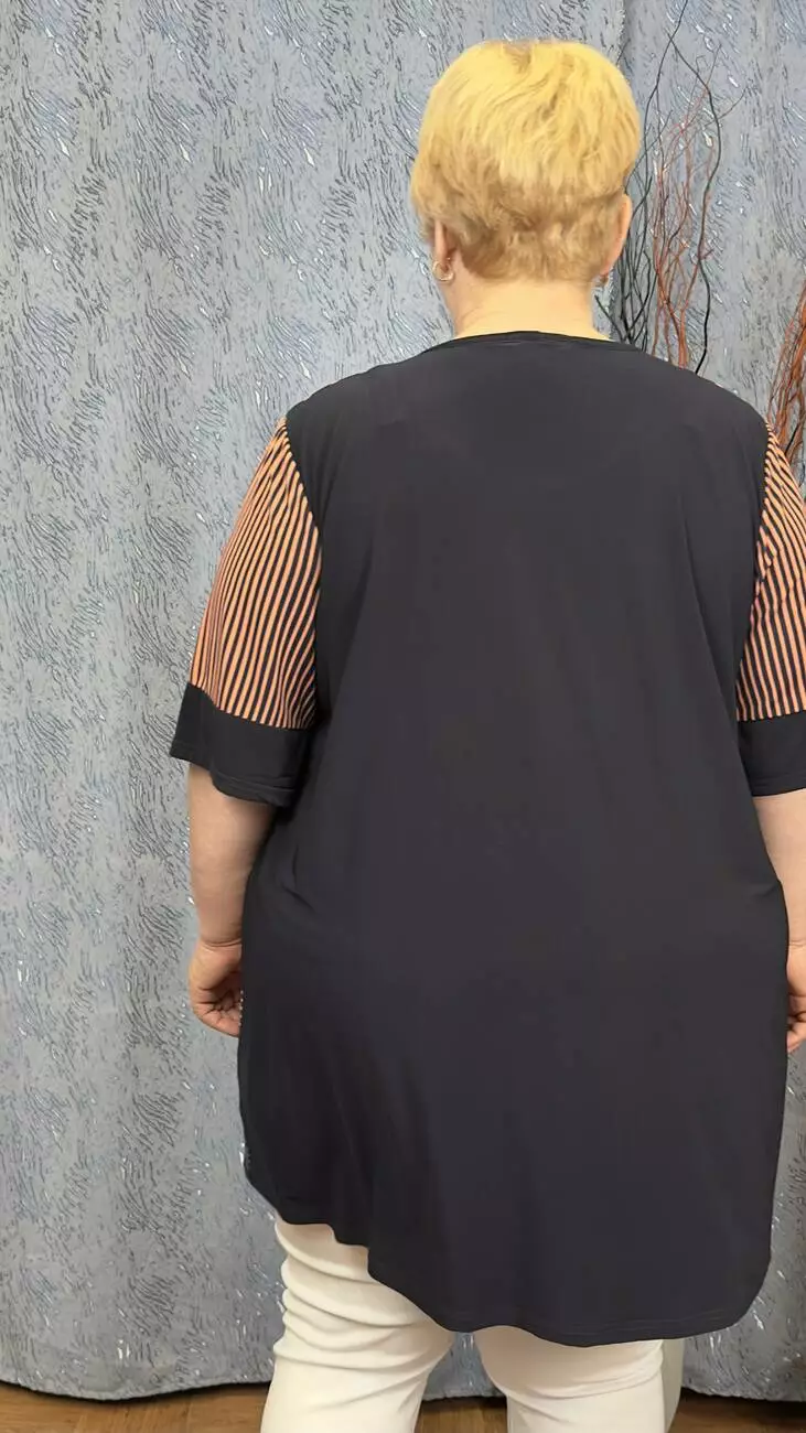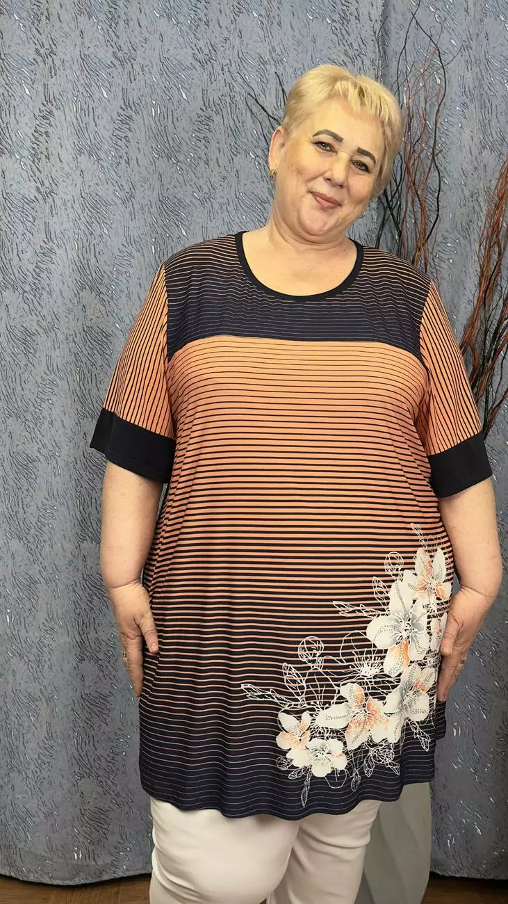 Подовжена, вільна туніка з трикотажу олія п-ва. Корея з дуже гарною розтяжністю. Тканина не меніться, не гаряча пропускає повітря, у складі 40% віскози 60 п/е, не вимагає особливого догляду дуже довговічна. Силует трапеція, рукав втачний, горловина прикрашена кам'яним накатом.