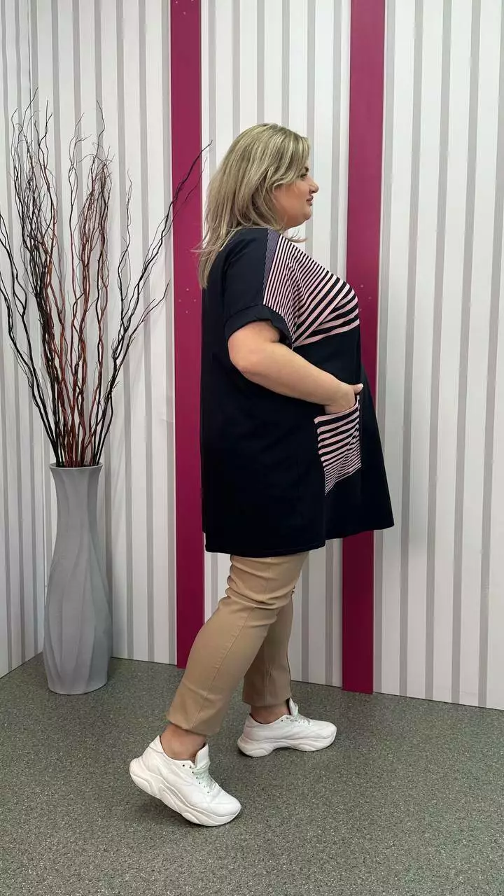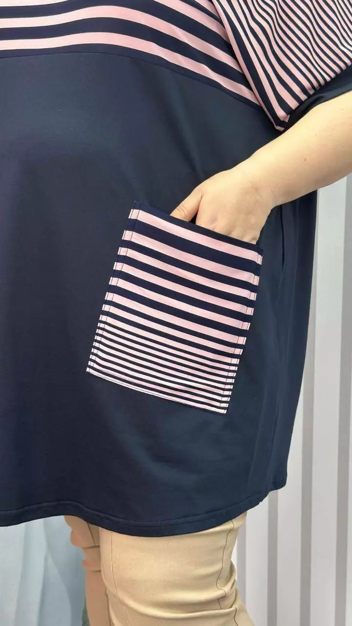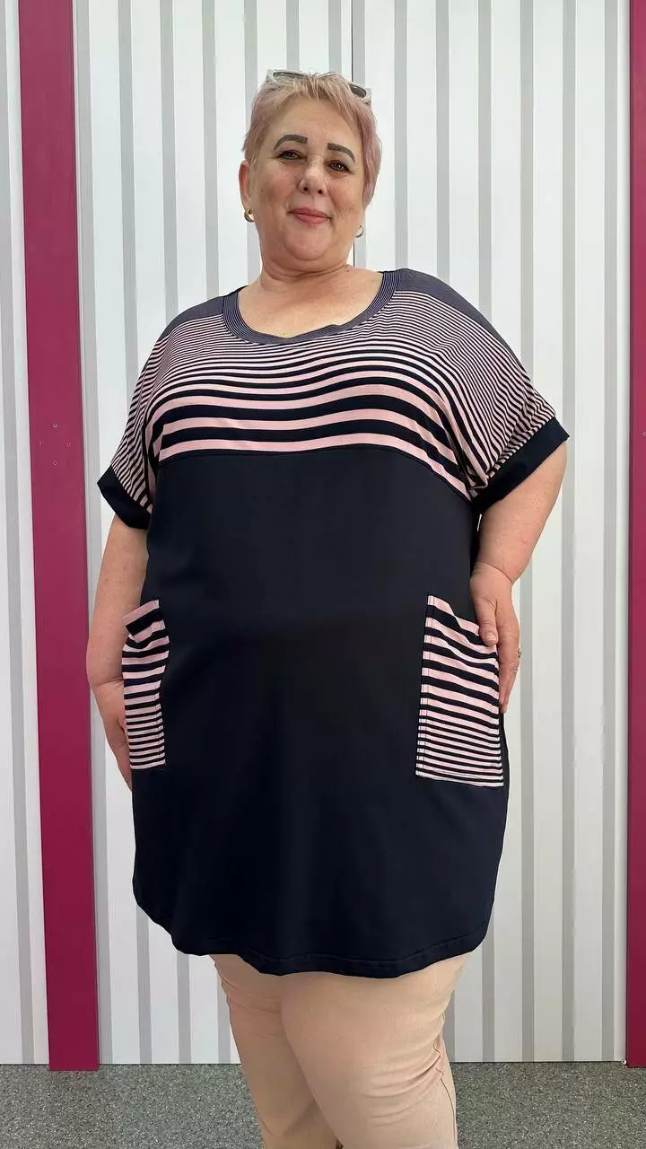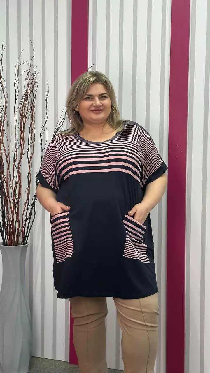 Подовжена вільна туніка зі спущеним плечем, по грудях оверсайз, з накладними кишенями. Тканина турецький кулір якості спів спів з дуже гарною розтяжністю, легка, приємна до тіла, не деформується. Комбінований з корейською олією.