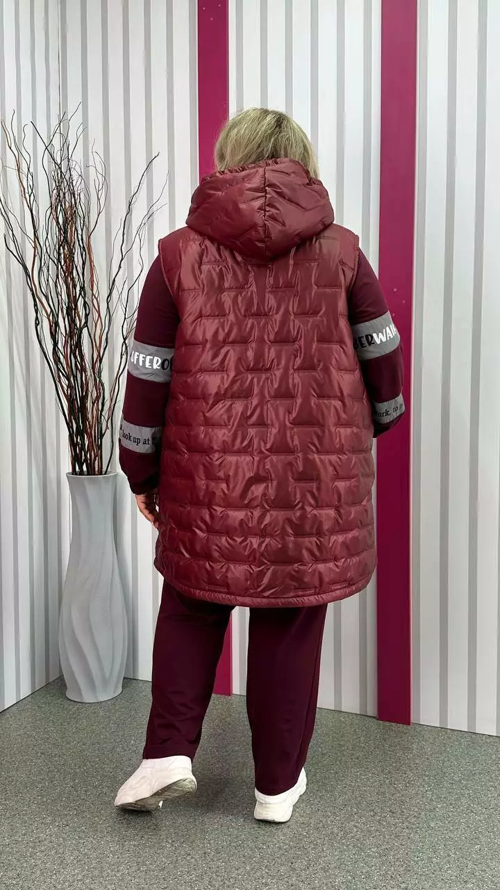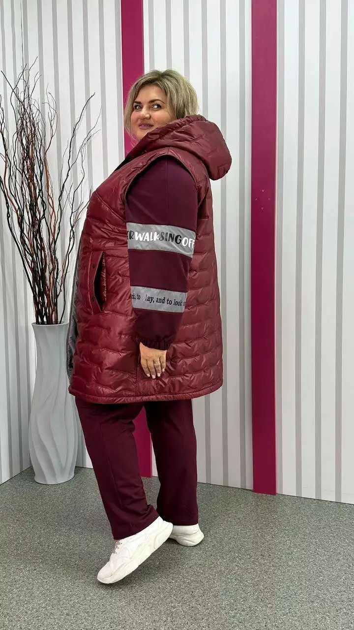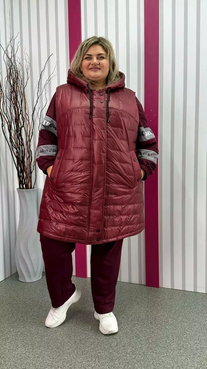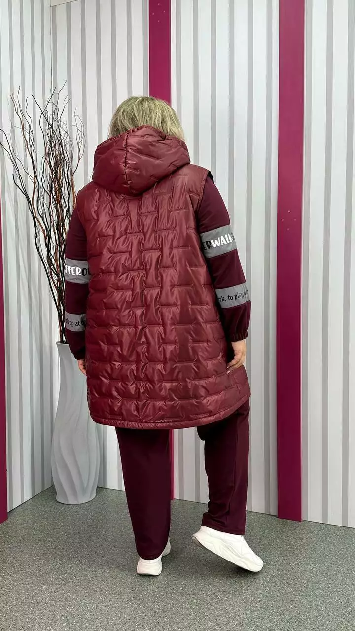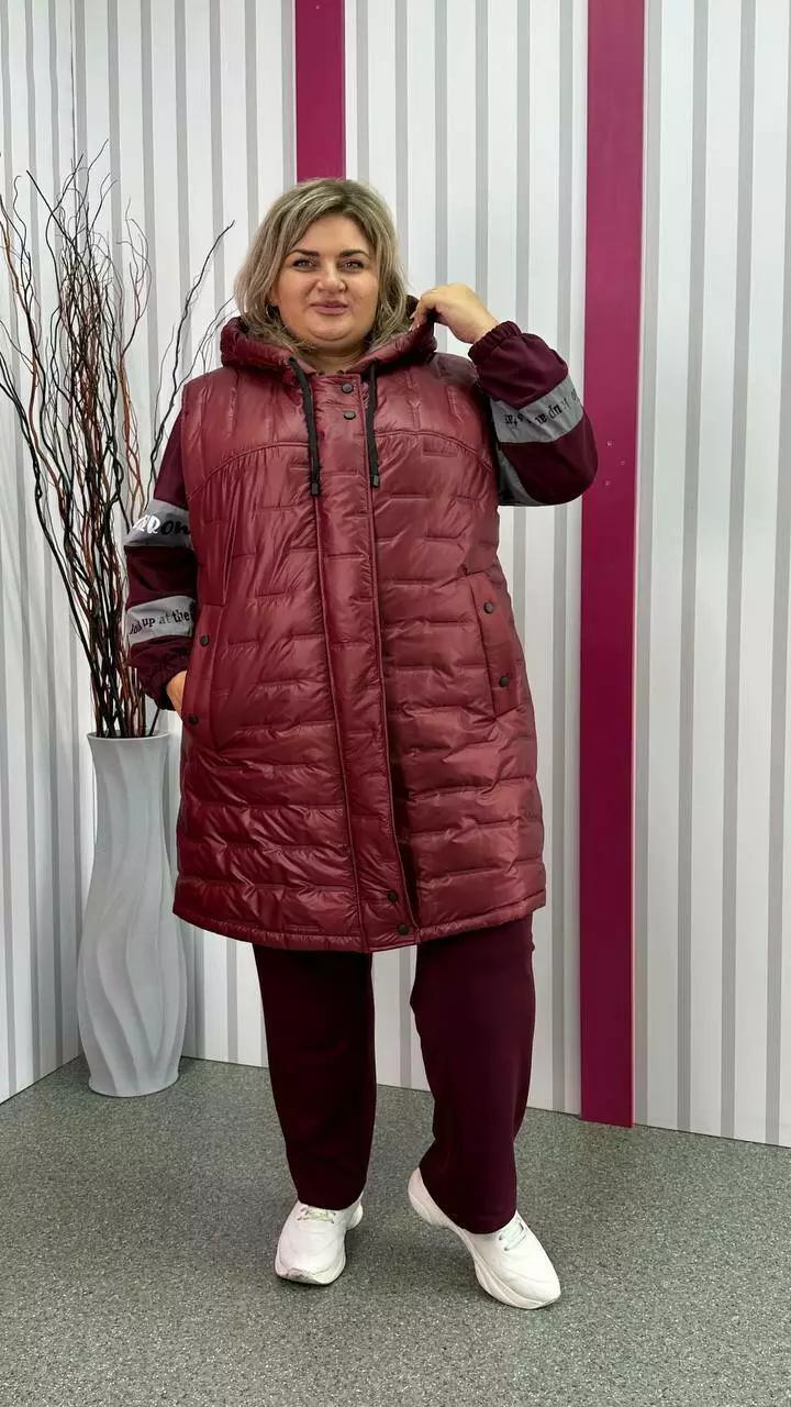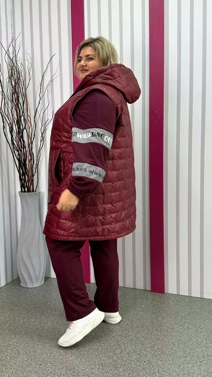Подовжена тепла жилет зі стьобаної плащівки "Еммі" та "Лаке" наповнення силікон 120. Прикрашений контрастним оздобленням по підборам і середина капюшона. Силует А образний, в кокетку закладена виточка на груди, кишені листочка, планка на кнопках, застібка змійка. М'який, легкий та теплий жилет не пропускає воду та вітер. Посадка ідеальна, зручна пройма, відмінний комплект зі спортивним костюмом.