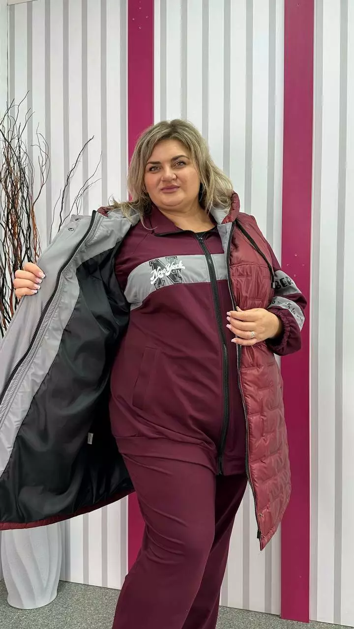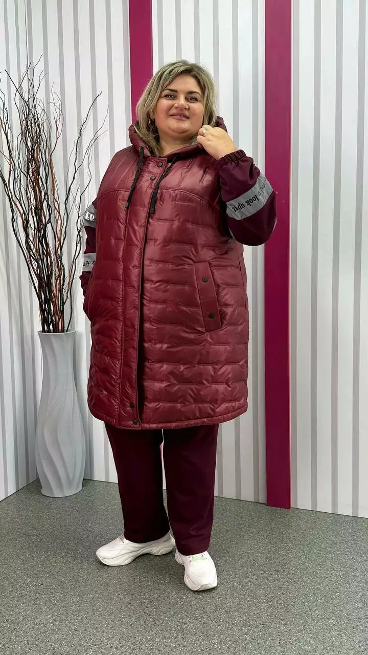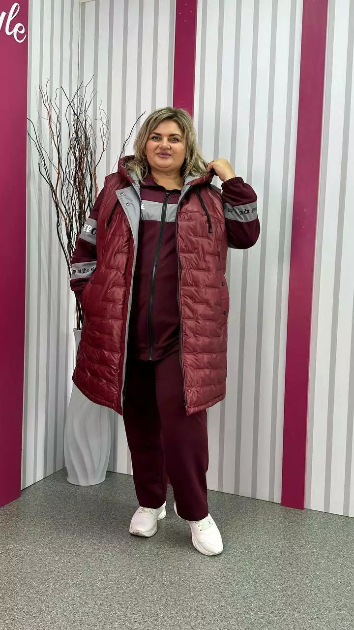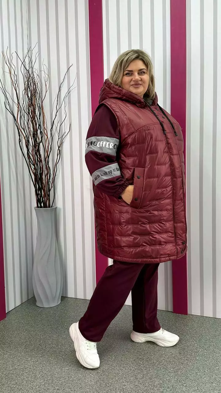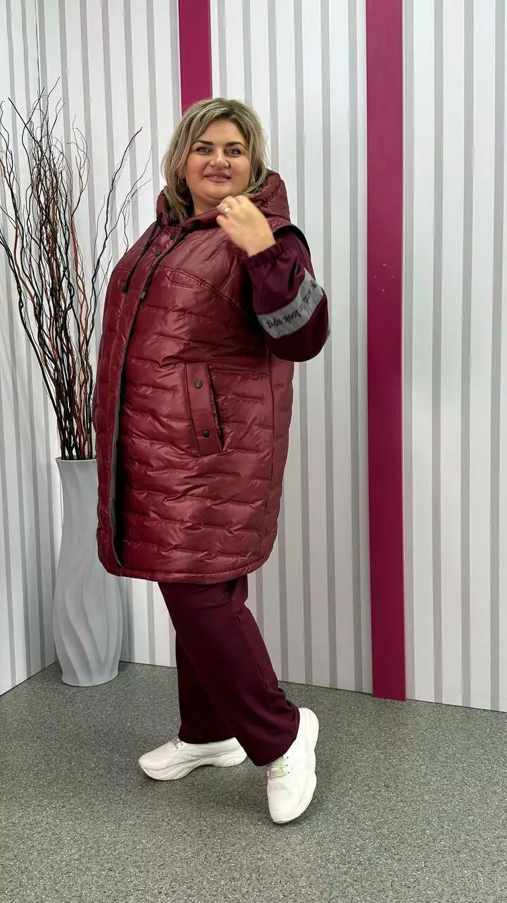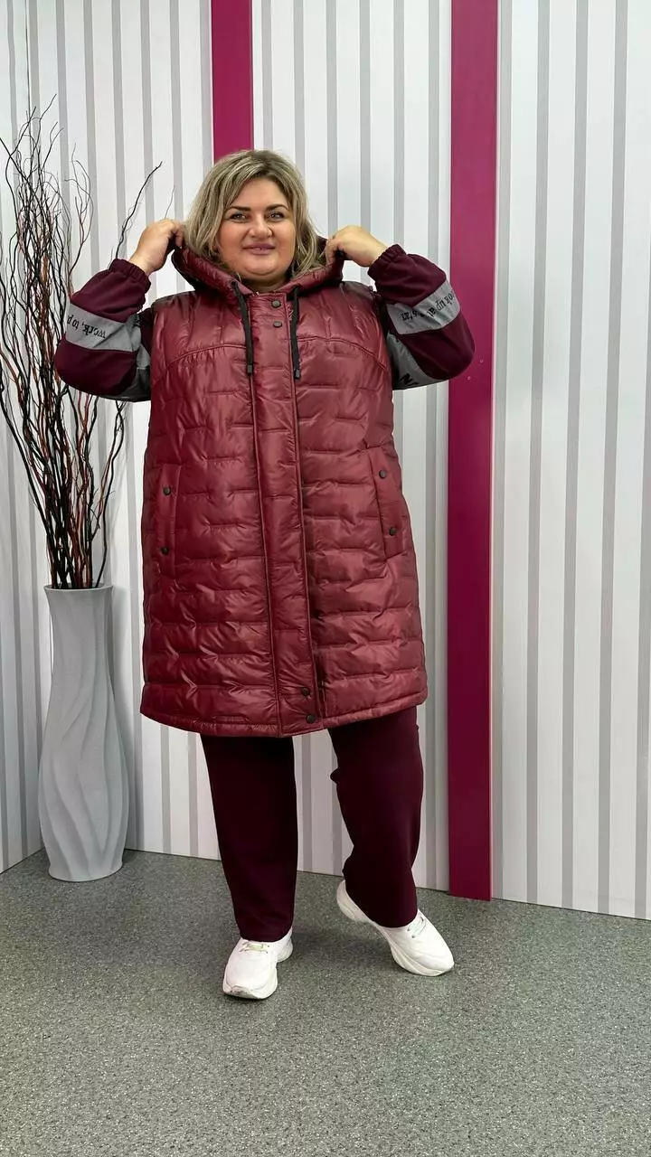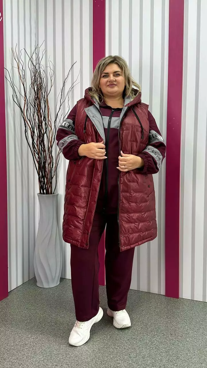 Подовжена тепла жилет зі стьобаної плащівки "Еммі" та "Лаке" наповнення силікон 120. Прикрашений контрастним оздобленням по підборам і середина капюшона. Силует А образний, в кокетку закладена виточка на груди, кишені листочка, планка на кнопках, застібка змійка. М'який, легкий та теплий жилет не пропускає воду та вітер. Посадка ідеальна, зручна пройма, відмінний комплект зі спортивним костюмом.