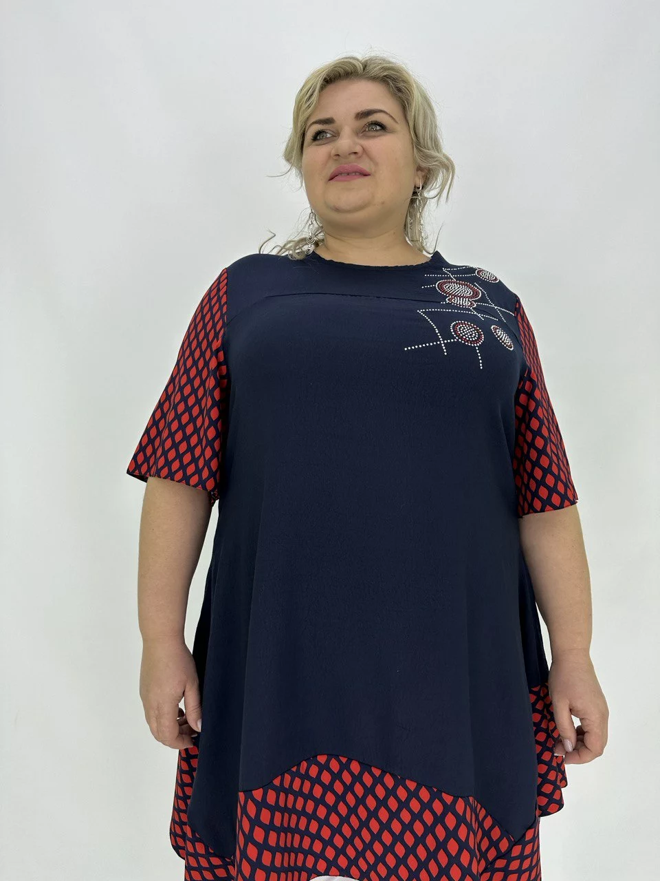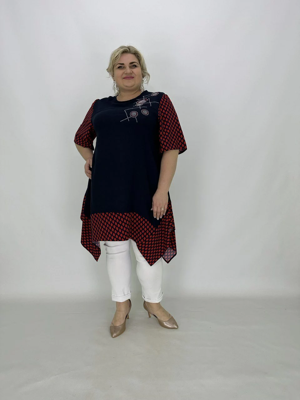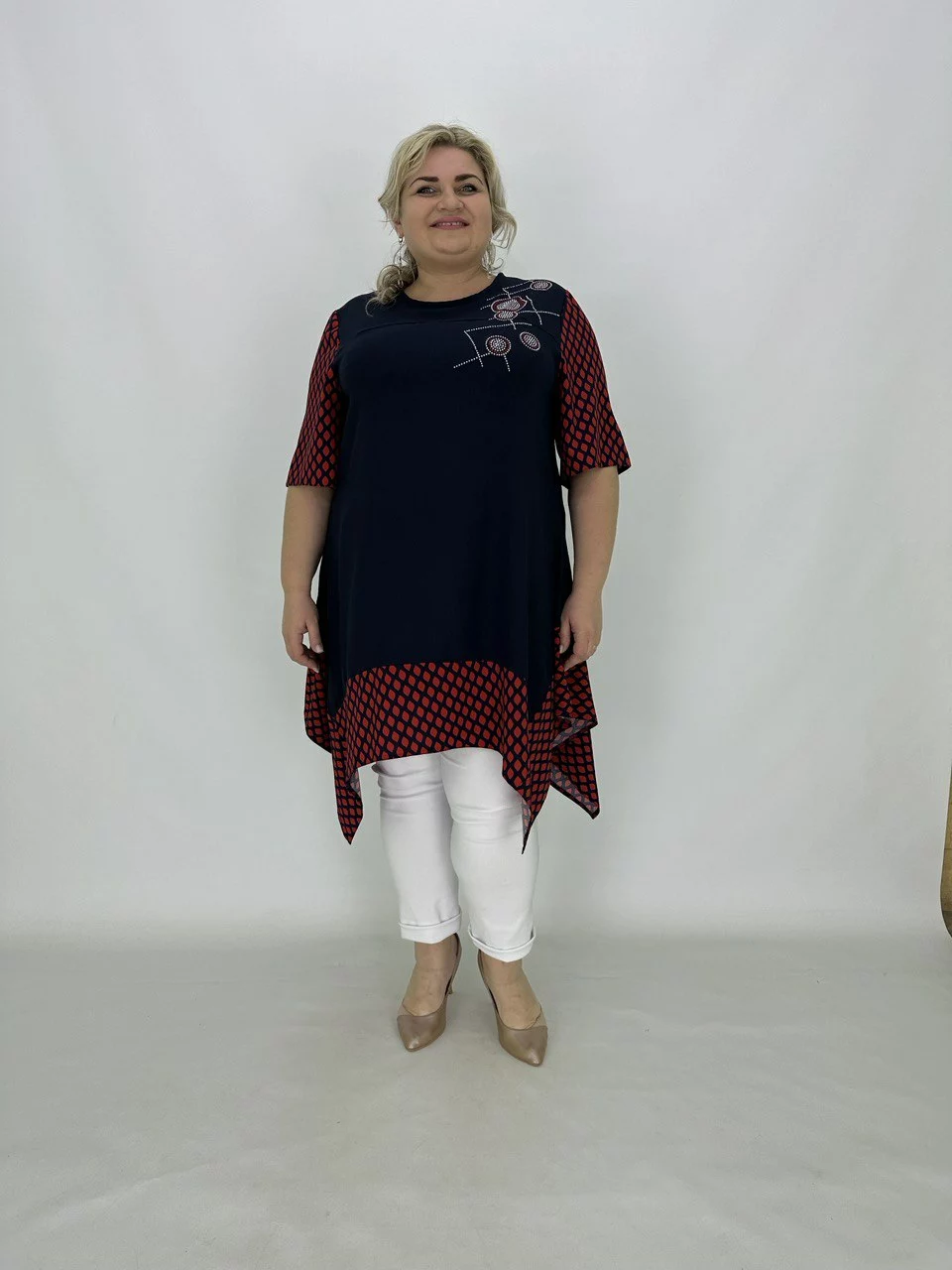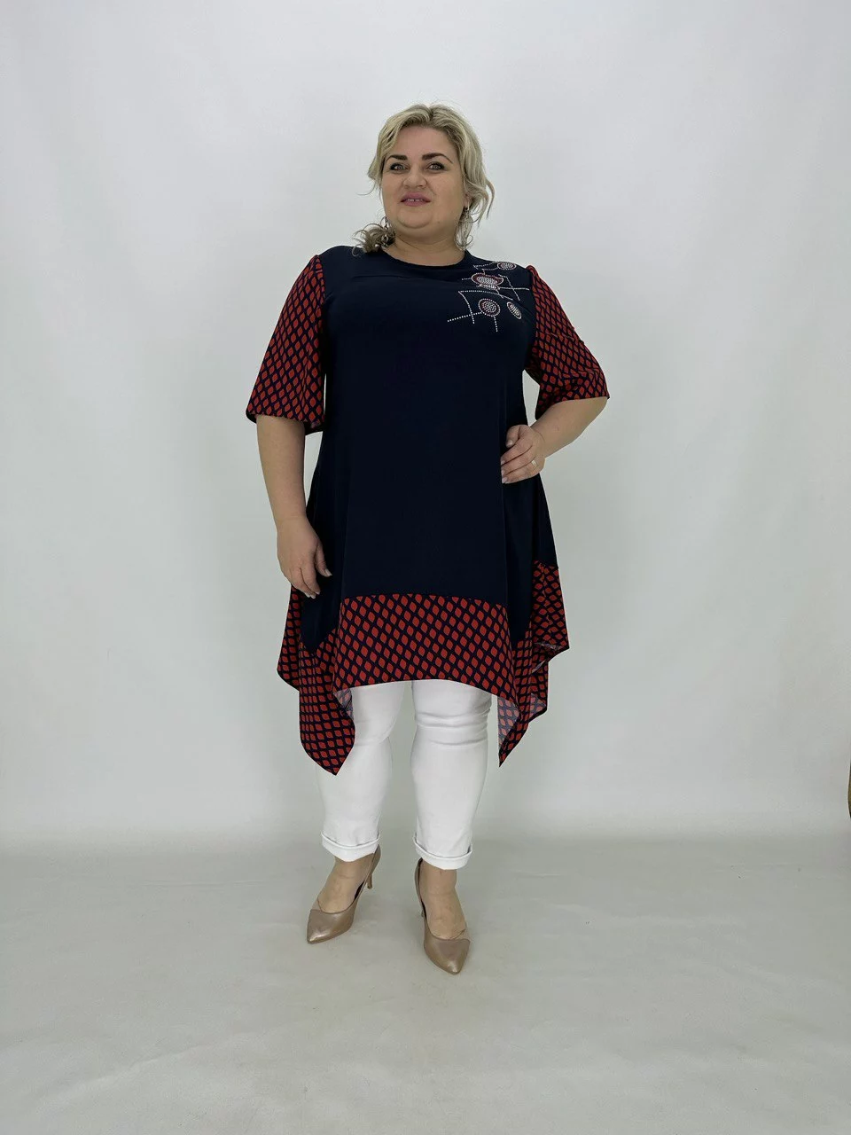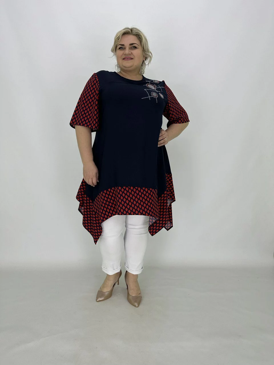 Розкльошена туніка з подовженими кутами "Перлина" з аплікацією з каменів