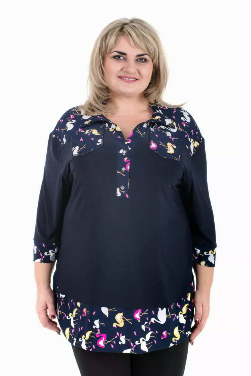 Тканина: масло-70% поліестер; 20% віскоза; 10% еластан. Красива сорочка вільного силуету з розрізами з боків. Виріб має сорочковий комір прикрашений стразами і дві нагрудні кишеньки. Тканина приємна на дотик не потребує особливого догляду.