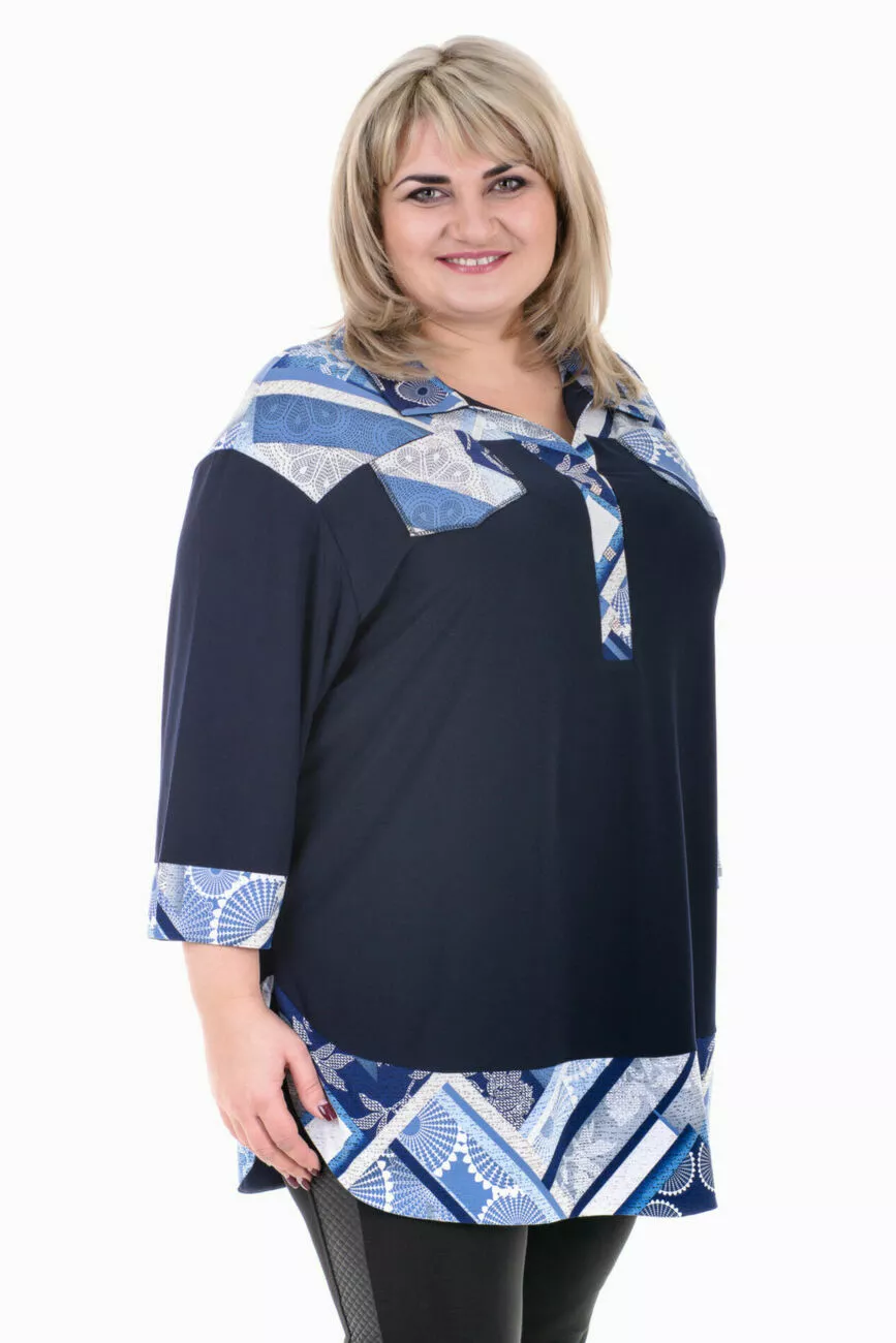 Тканина: масло-70% поліестер; 20% віскоза; 10% еластан. Красива сорочка вільного силуету з розрізами з боків. Виріб має сорочковий комір прикрашений стразами і дві нагрудні кишеньки. Тканина приємна на дотик не потребує особливого догляду.