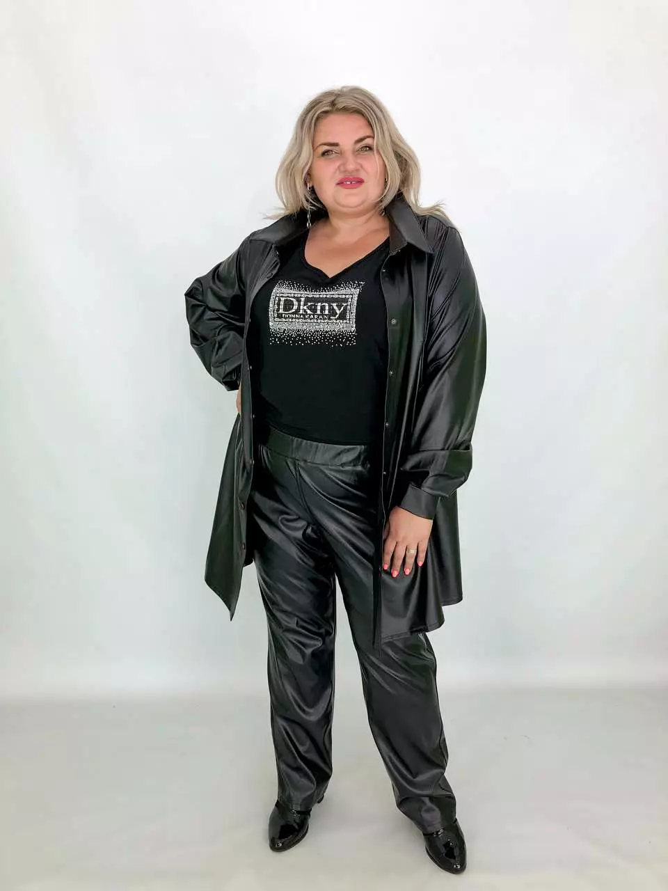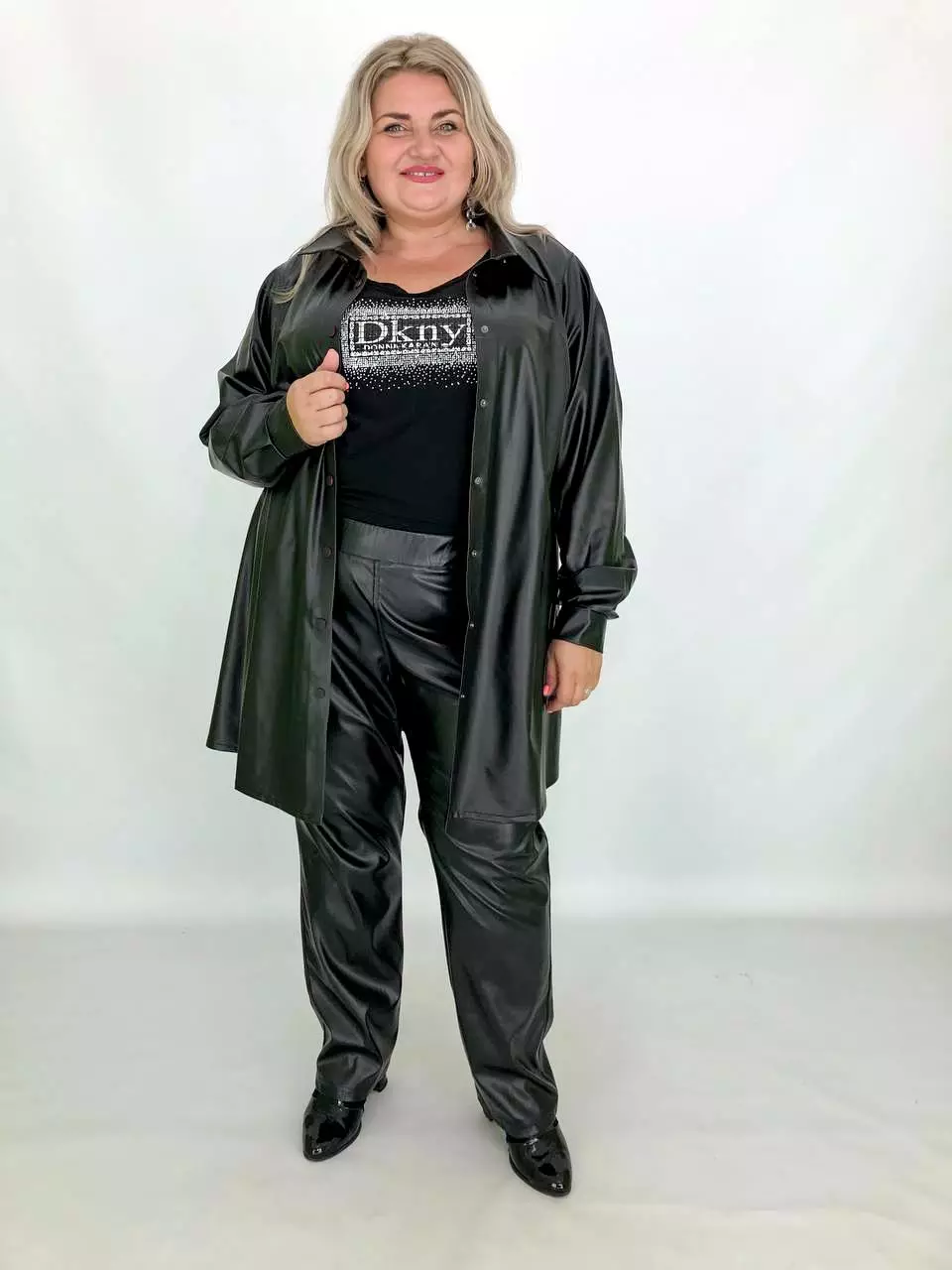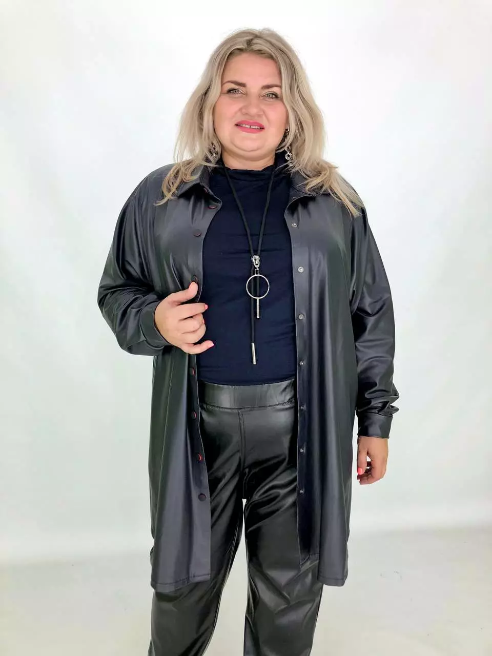 Тканина: екошкіра - 100% поліестер. Тканина екошкіри на трикотажній основі, дуже м'яка, добре тягнеться. Силует вільний, рукав широкий - кажан. Підходить під будь-які груди. Застібається на кнопки. Прання-ручне без віджиму, гладити тільки з вивороту. Розміри :
