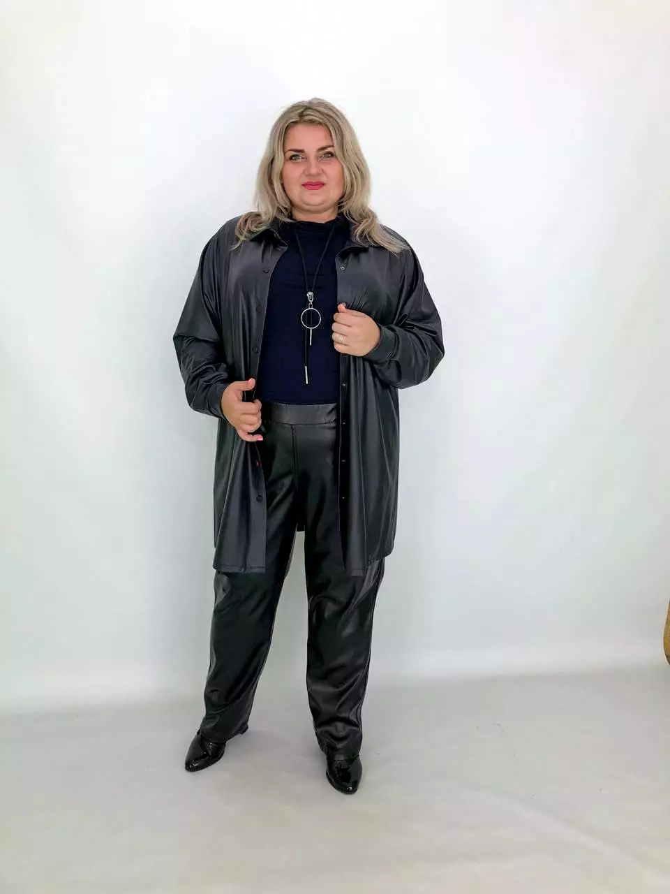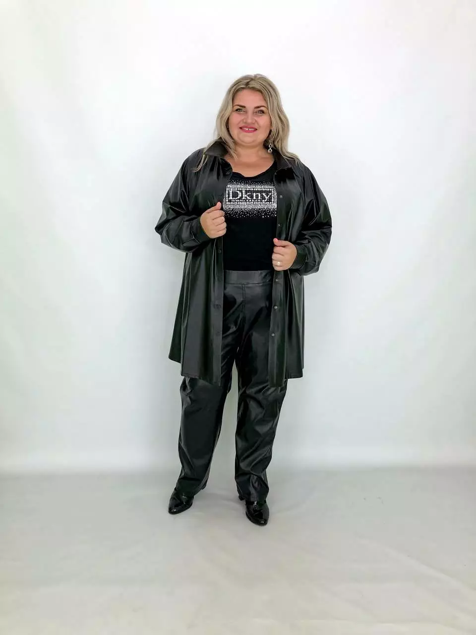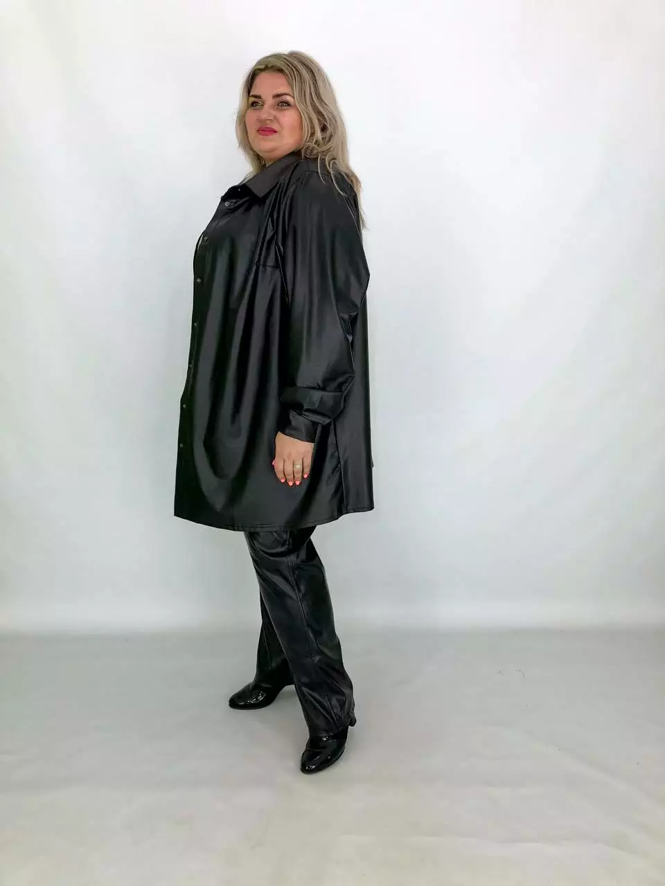 Тканина: екошкіра - 100% поліестер. Тканина екошкіри на трикотажній основі, дуже м'яка, добре тягнеться. Силует вільний, рукав широкий - кажан. Підходить під будь-які груди. Застібається на кнопки. Прання-ручне без віджиму, гладити тільки з вивороту. Розміри :
