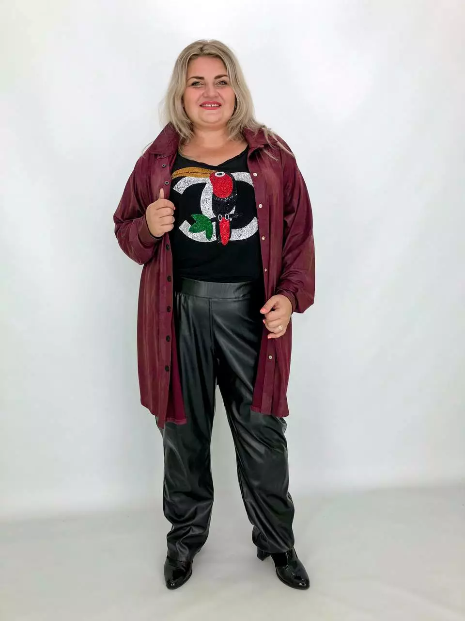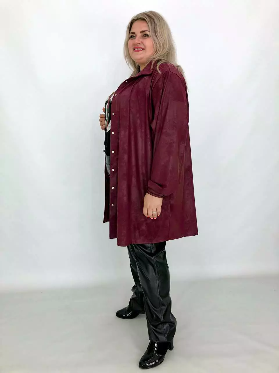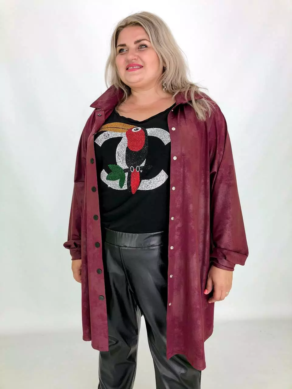 Тканина: екошкіра - 100% поліестер. Тканина екошкіри під замш на трикотажній основі, дуже м'яка, добре тягнеться. Силует вільний, рукав широкий - кажан. Підходить під будь-які груди. Застібається на кнопки. Прання-ручне без віджиму, гладити тільки з вивороту.