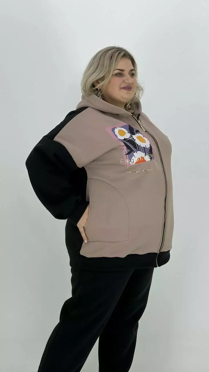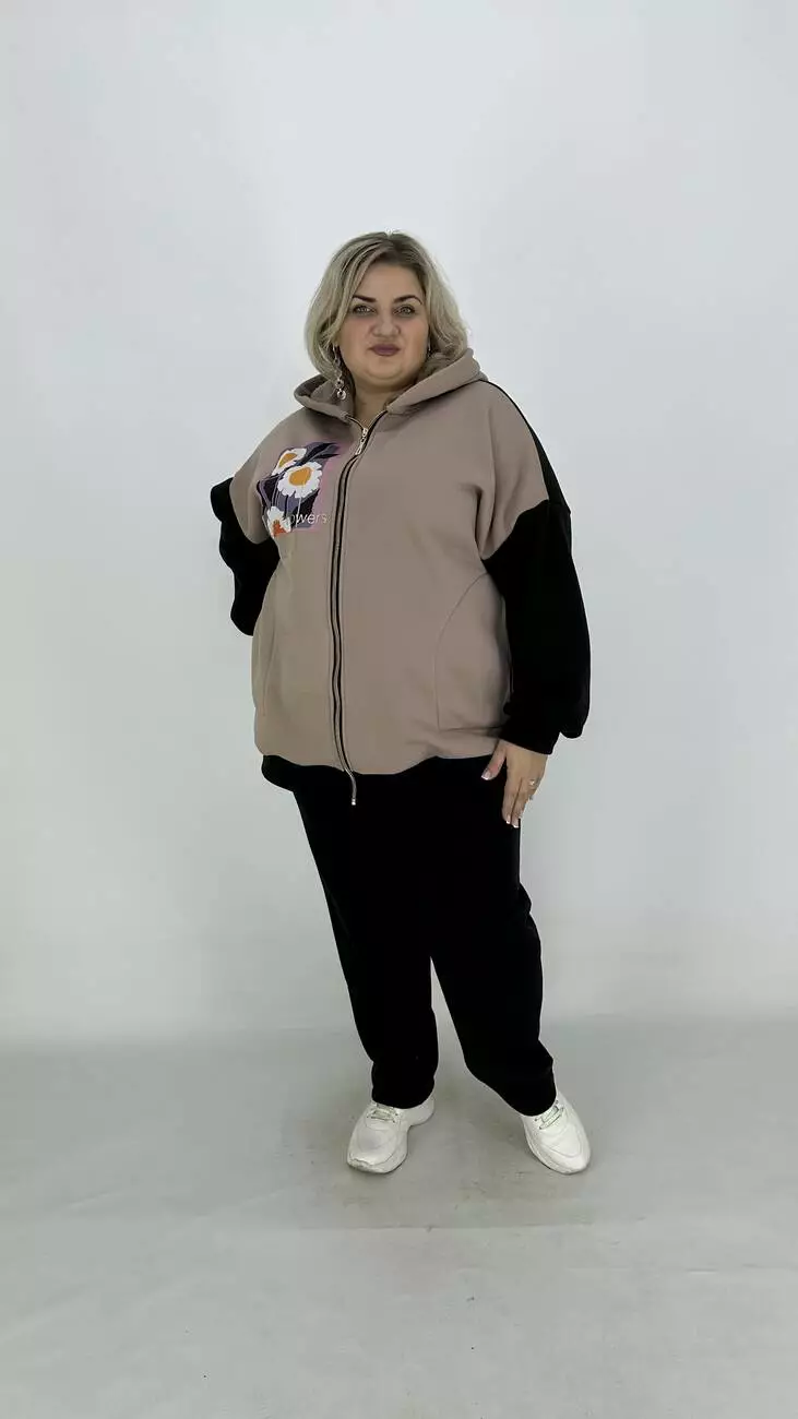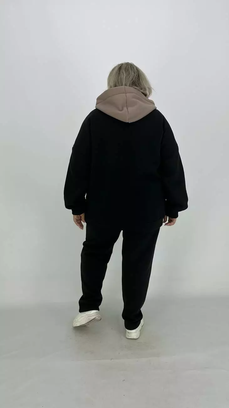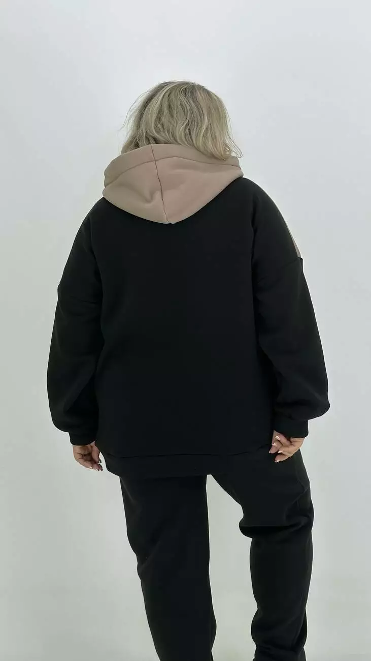 Фасон-оверсайз-спущене плече комбінована з двох кольорів, прикрашена тканинним накатом та фольгою. Основний колір — чорний. Для комплекту пропонуємо окремо штани 3х нитка.