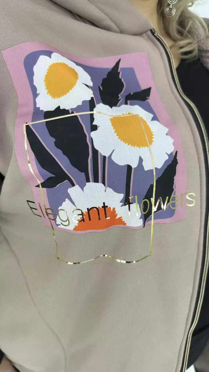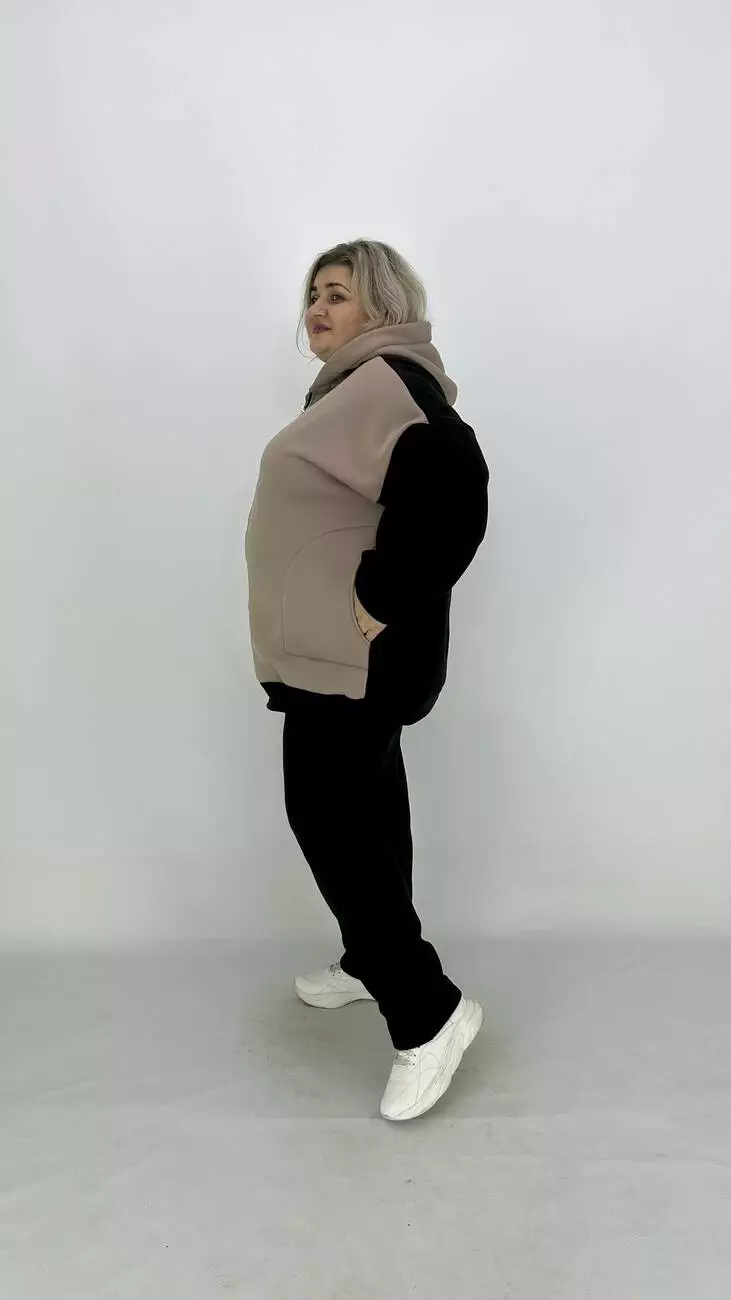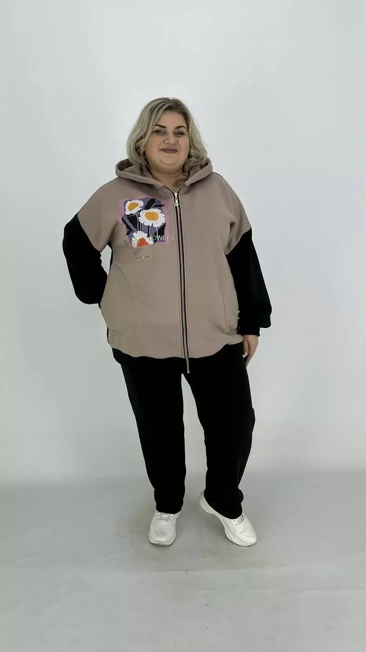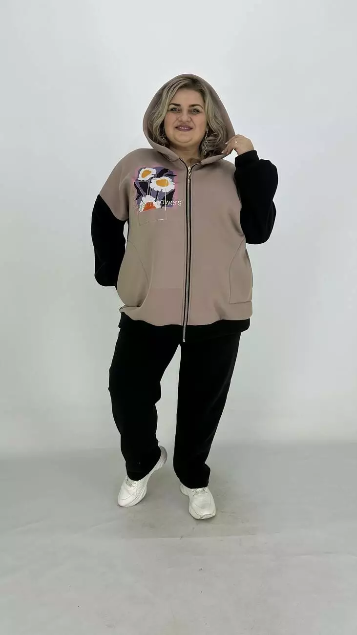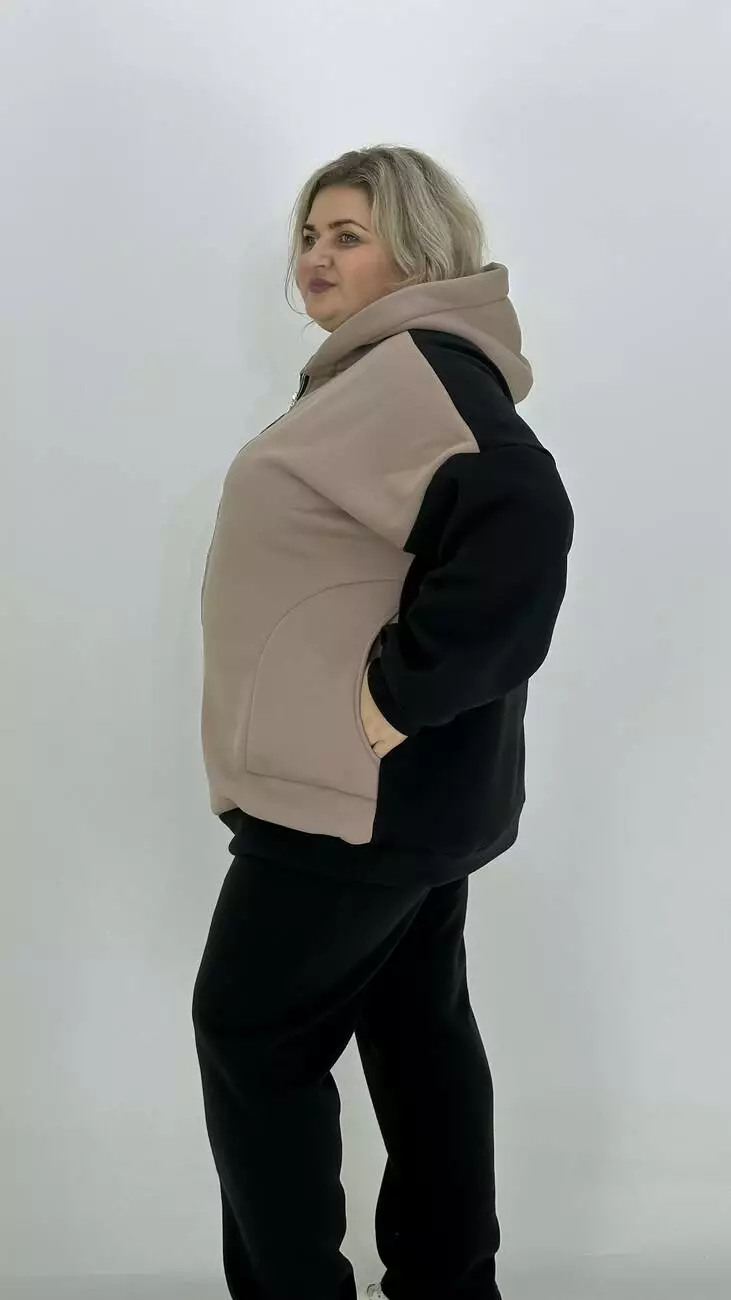 Фасон-оверсайз-спущене плече комбінована з двох кольорів, прикрашена тканинним накатом та фольгою. Основний колір — чорний. Для комплекту пропонуємо окремо штани 3х нитка.