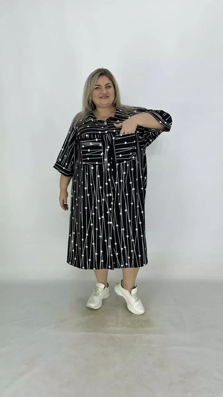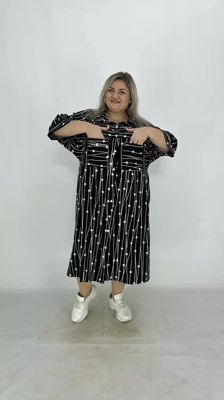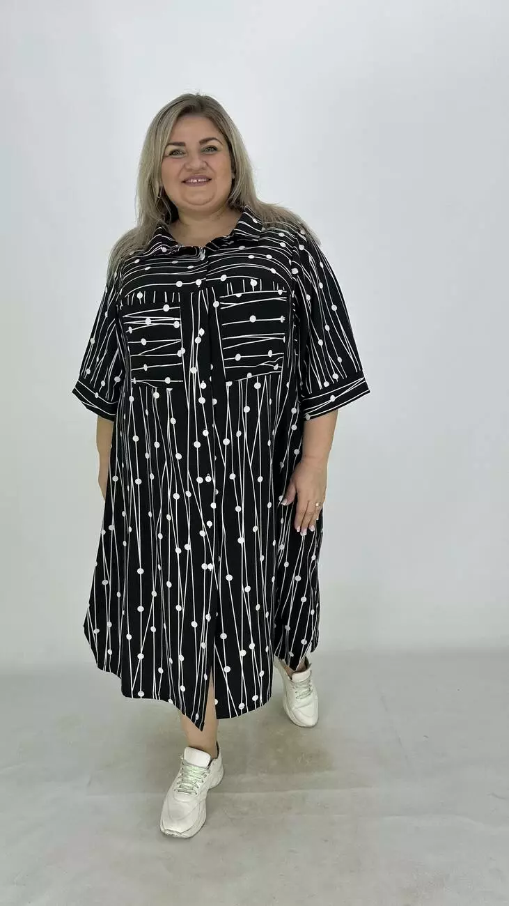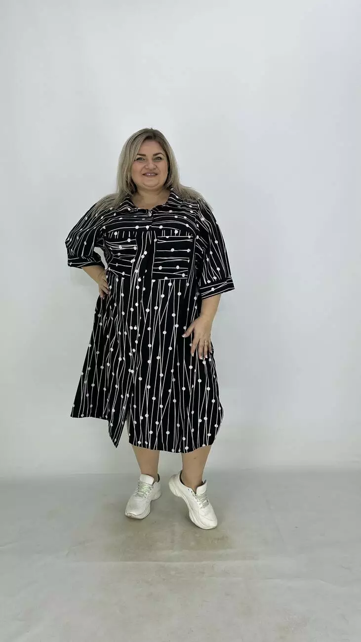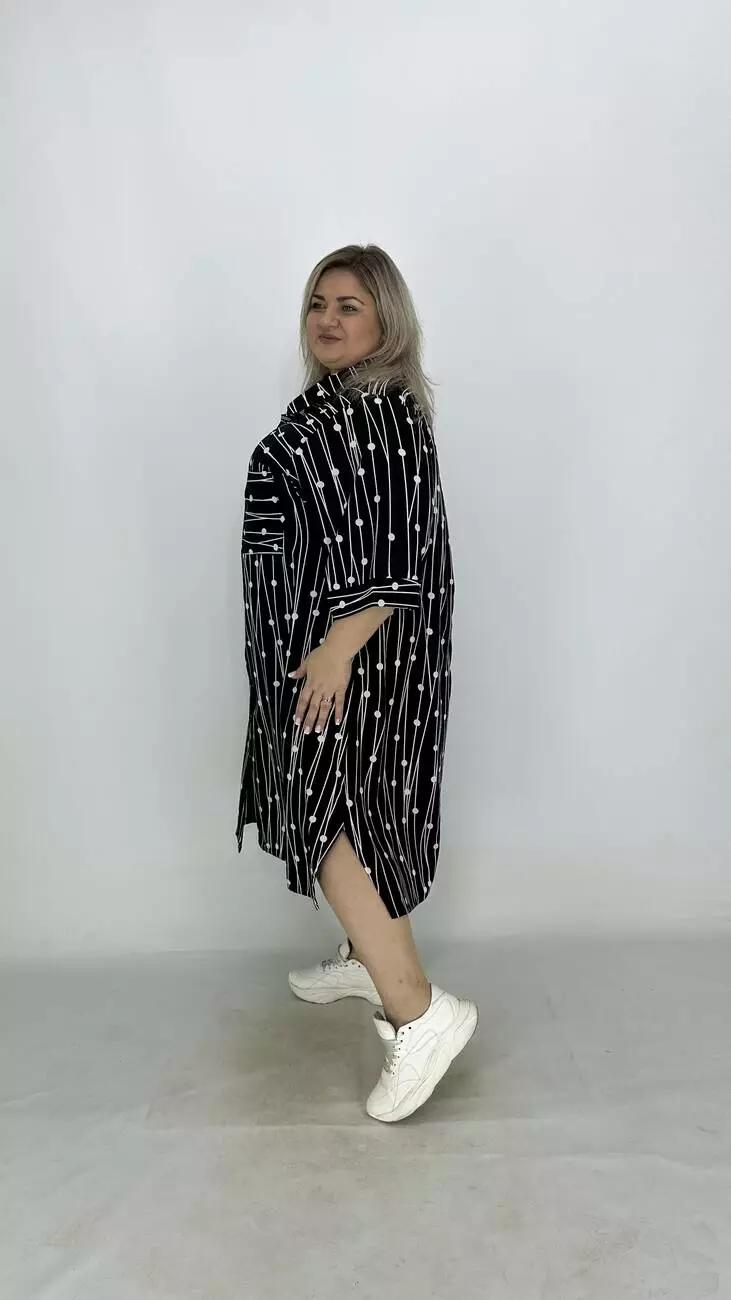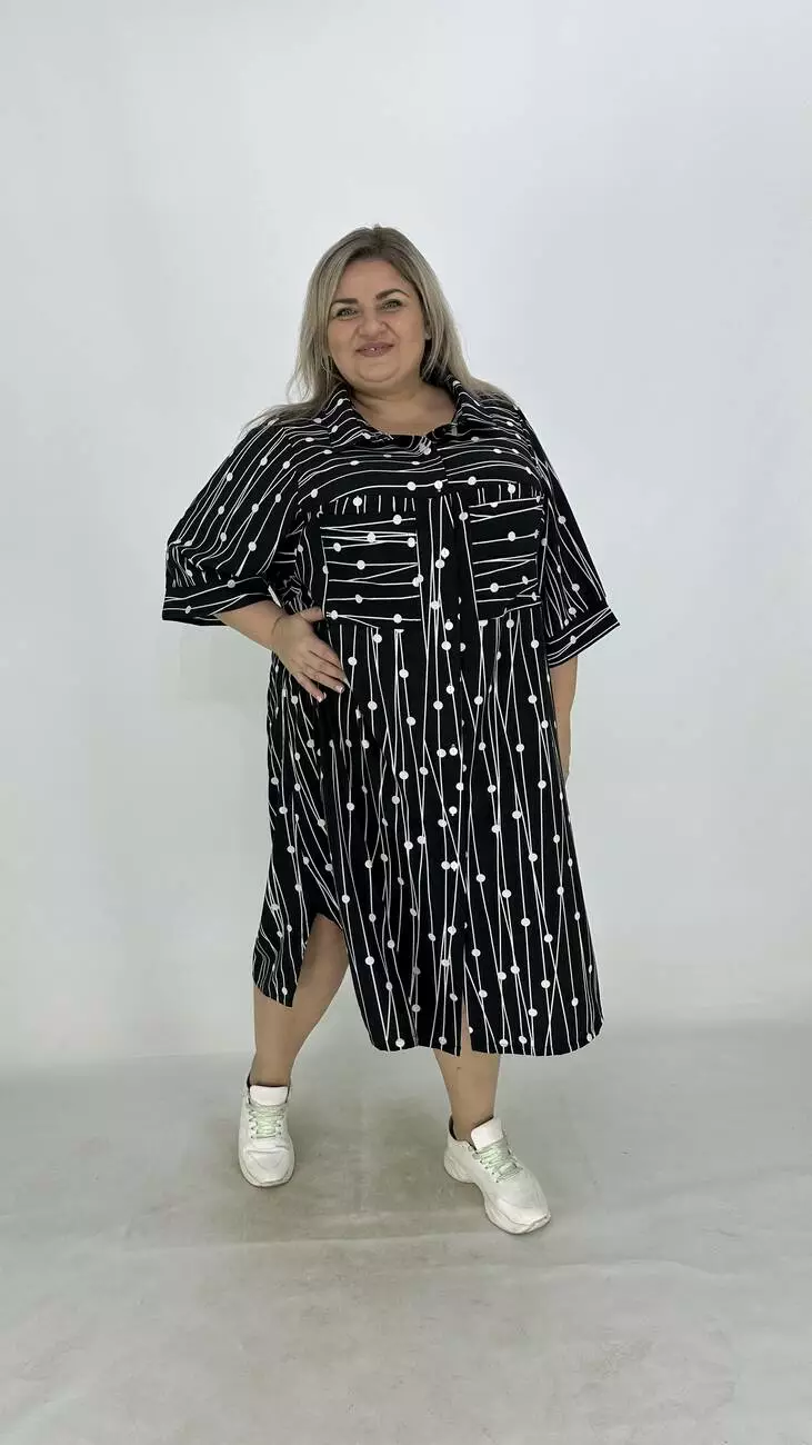 Сукня - сорочка з супер софту, дуже легка, м'яка, приємна до тіла, не меніться, розтяжності немає. Силует трапеція, по грудях вільне, опущена пройма підходить на будь-які груди, з боків підрізи. Комір сорочковий, кишені накладні, застібається на гудзики.